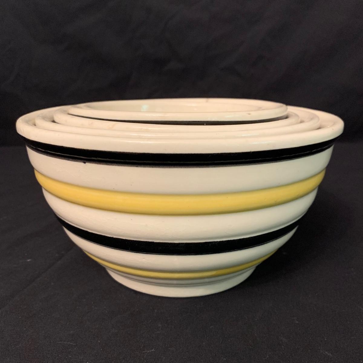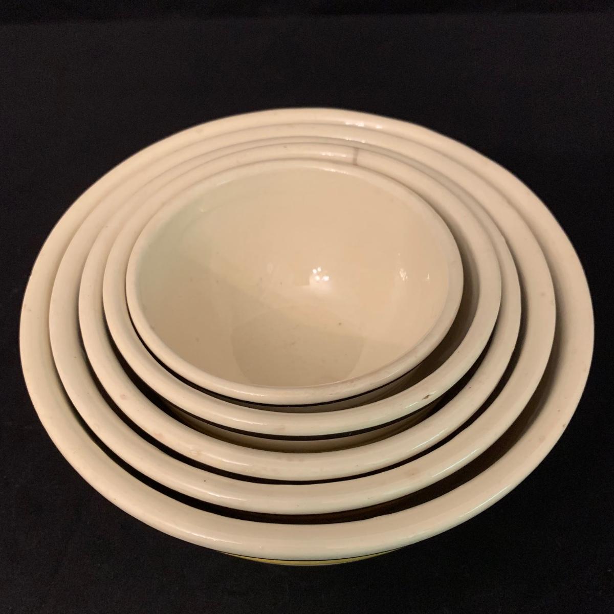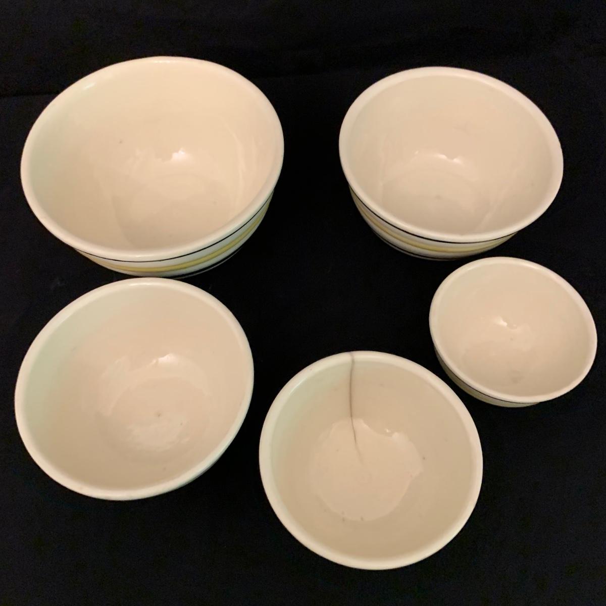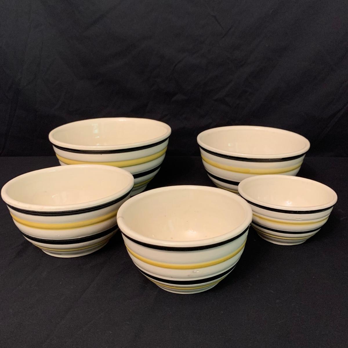 Set of five nested Robinson Ransbottom Pottery (RRP) Co. mixing bowls. The bowls are marked “RRP Co. Roseville, Ohio” on the bottom. The bowls are cream-colored and have yellow and black stripes on the outside. The largest bowl is 9”D and the smallest is 5.5”D. Note the crack in one of the bowls. Shipping available.