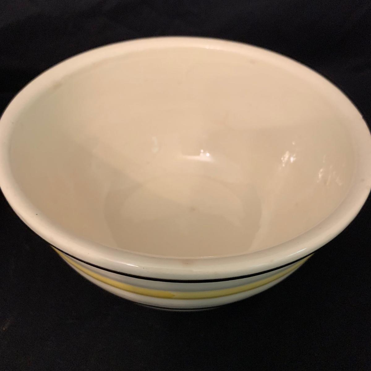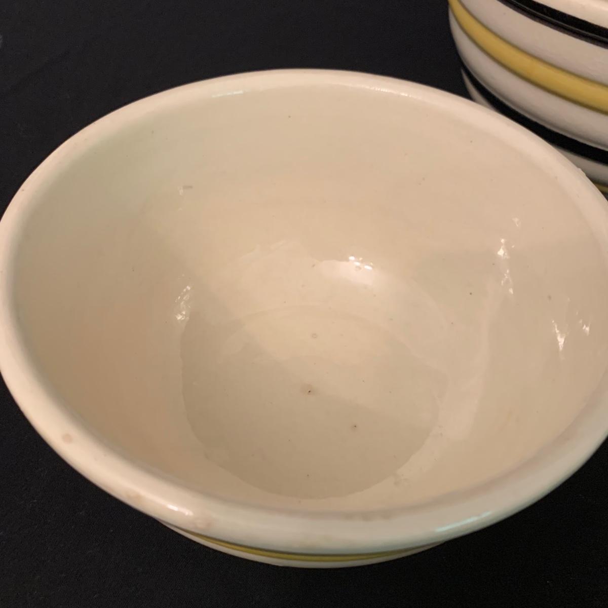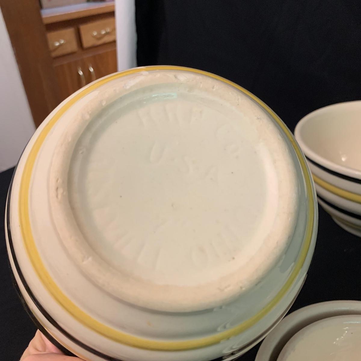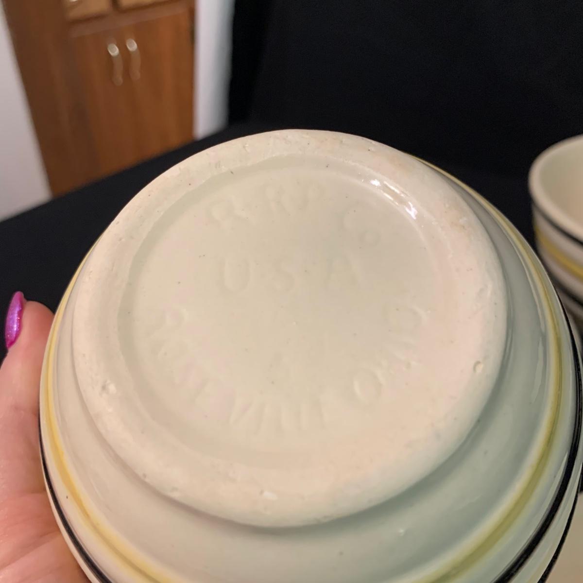 Set of five nested Robinson Ransbottom Pottery (RRP) Co. mixing bowls. The bowls are marked “RRP Co. Roseville, Ohio” on the bottom. The bowls are cream-colored and have yellow and black stripes on the outside. The largest bowl is 9”D and the smallest is 5.5”D. Note the crack in one of the bowls. Shipping available.