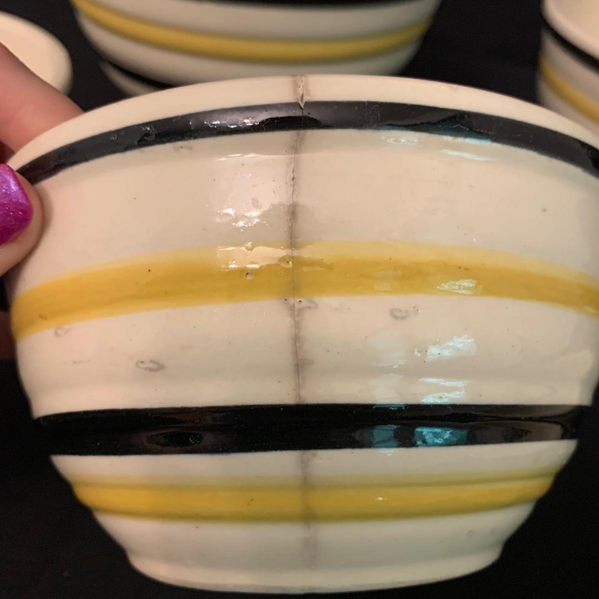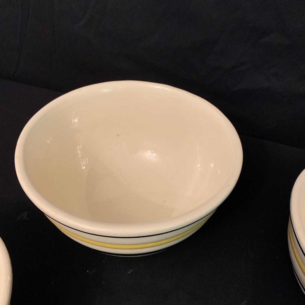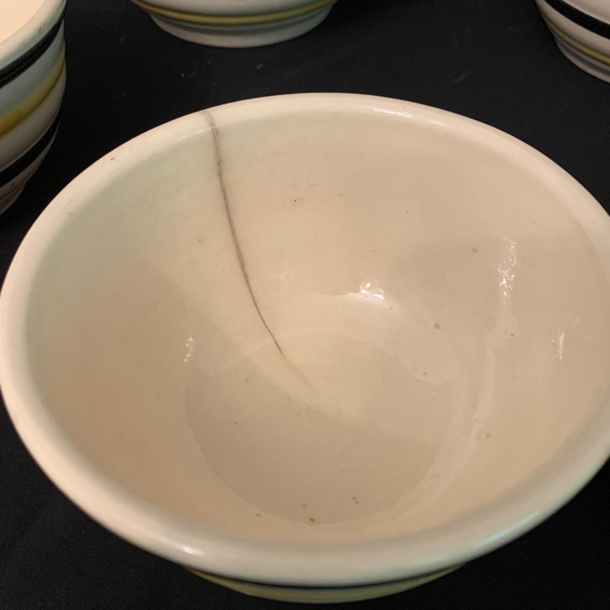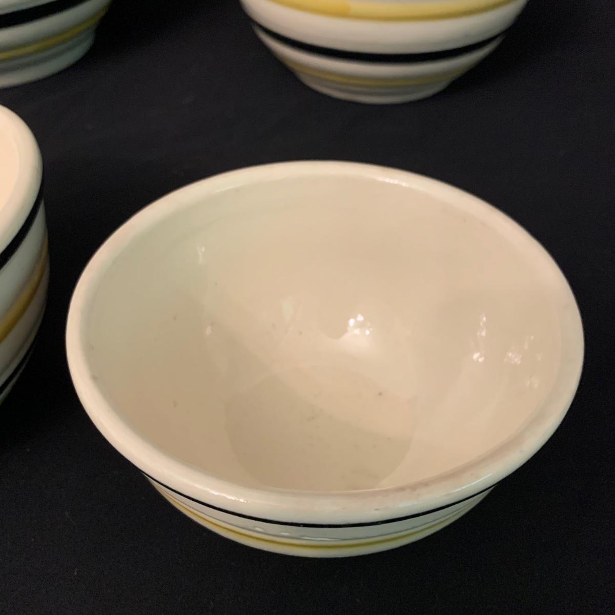Set of five nested Robinson Ransbottom Pottery (RRP) Co. mixing bowls. The bowls are marked “RRP Co. Roseville, Ohio” on the bottom. The bowls are cream-colored and have yellow and black stripes on the outside. The largest bowl is 9”D and the smallest is 5.5”D. Note the crack in one of the bowls. Shipping available.