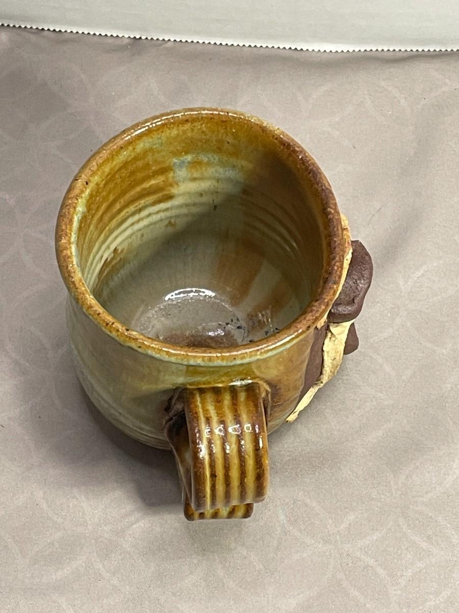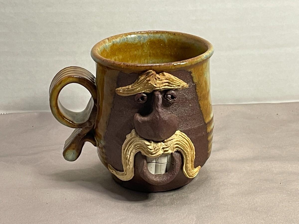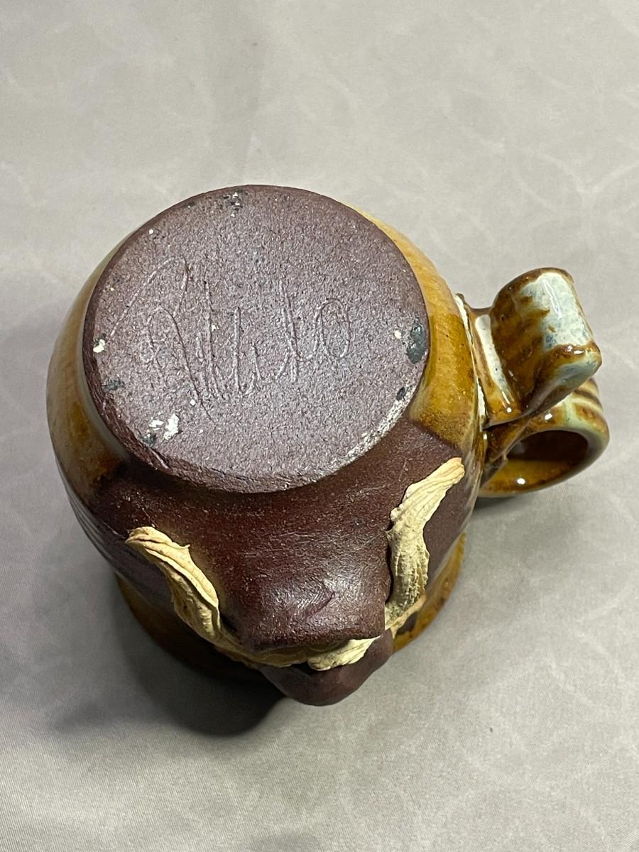 This hand-made face mug is about 3.5 inches tall. It does not appear to have any damage and it is signed by the maker.