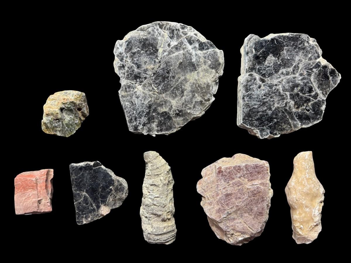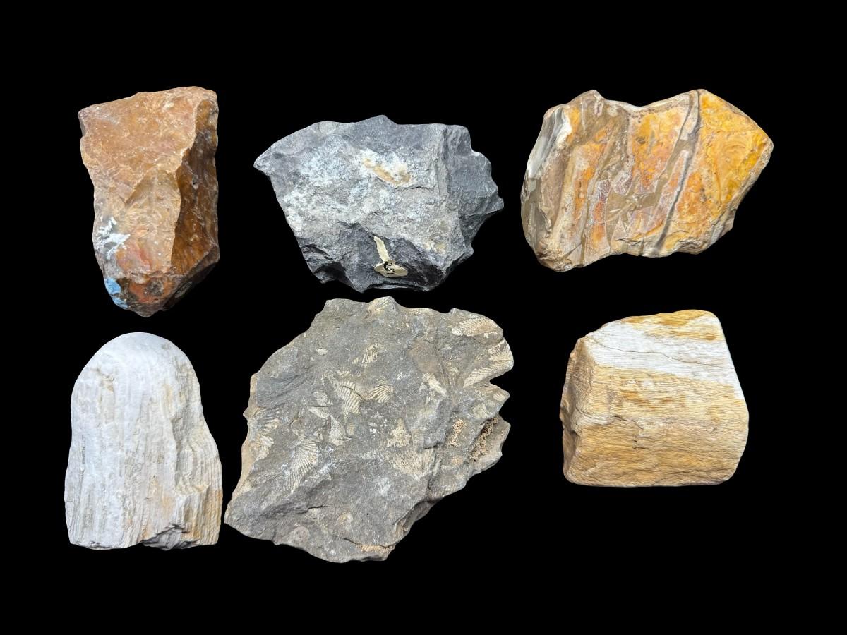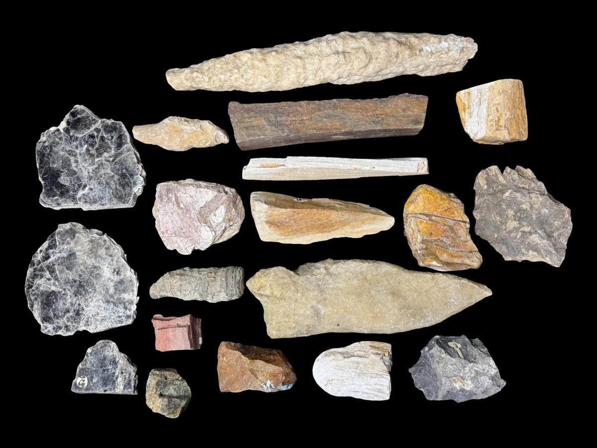 Includes horned coral, flint, sandstone, pyrite, igneous, and more. Total of 15+ pieces. [BK]