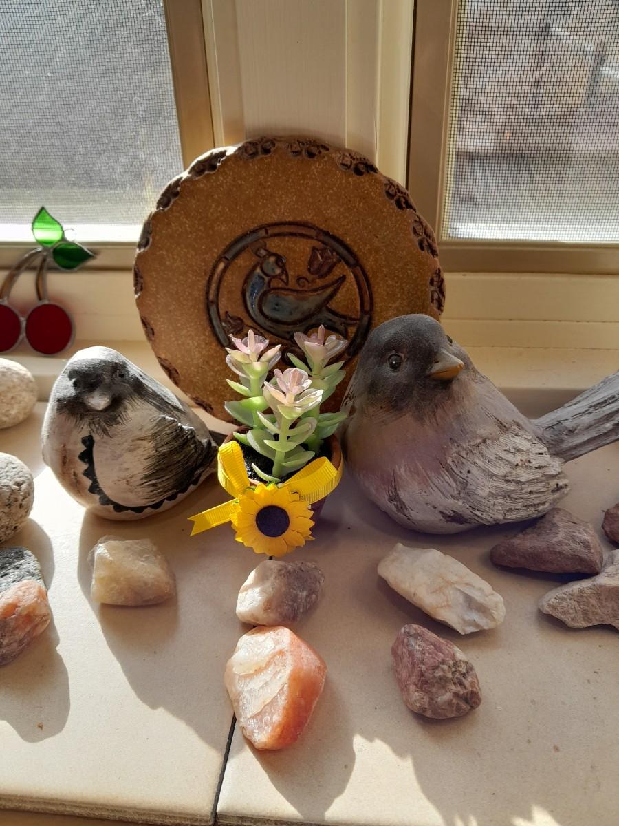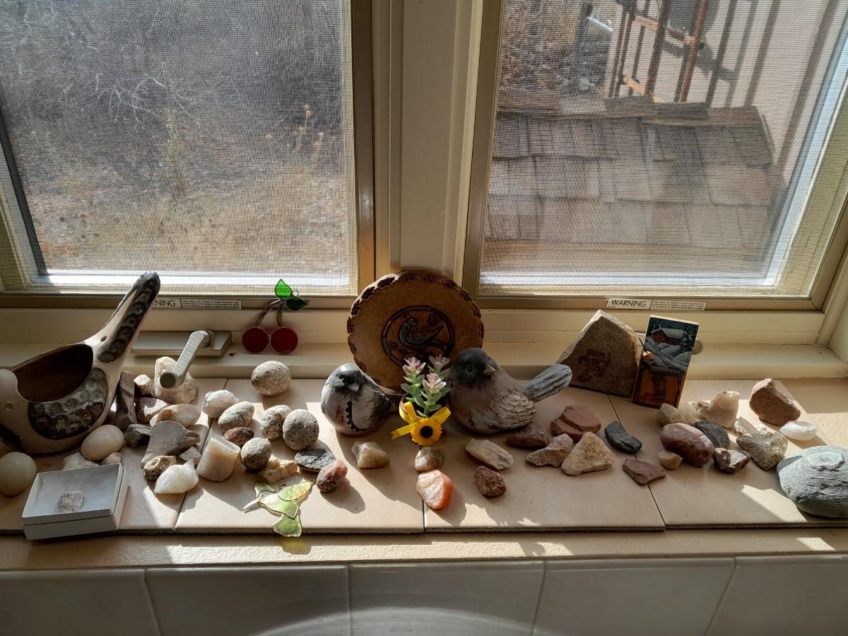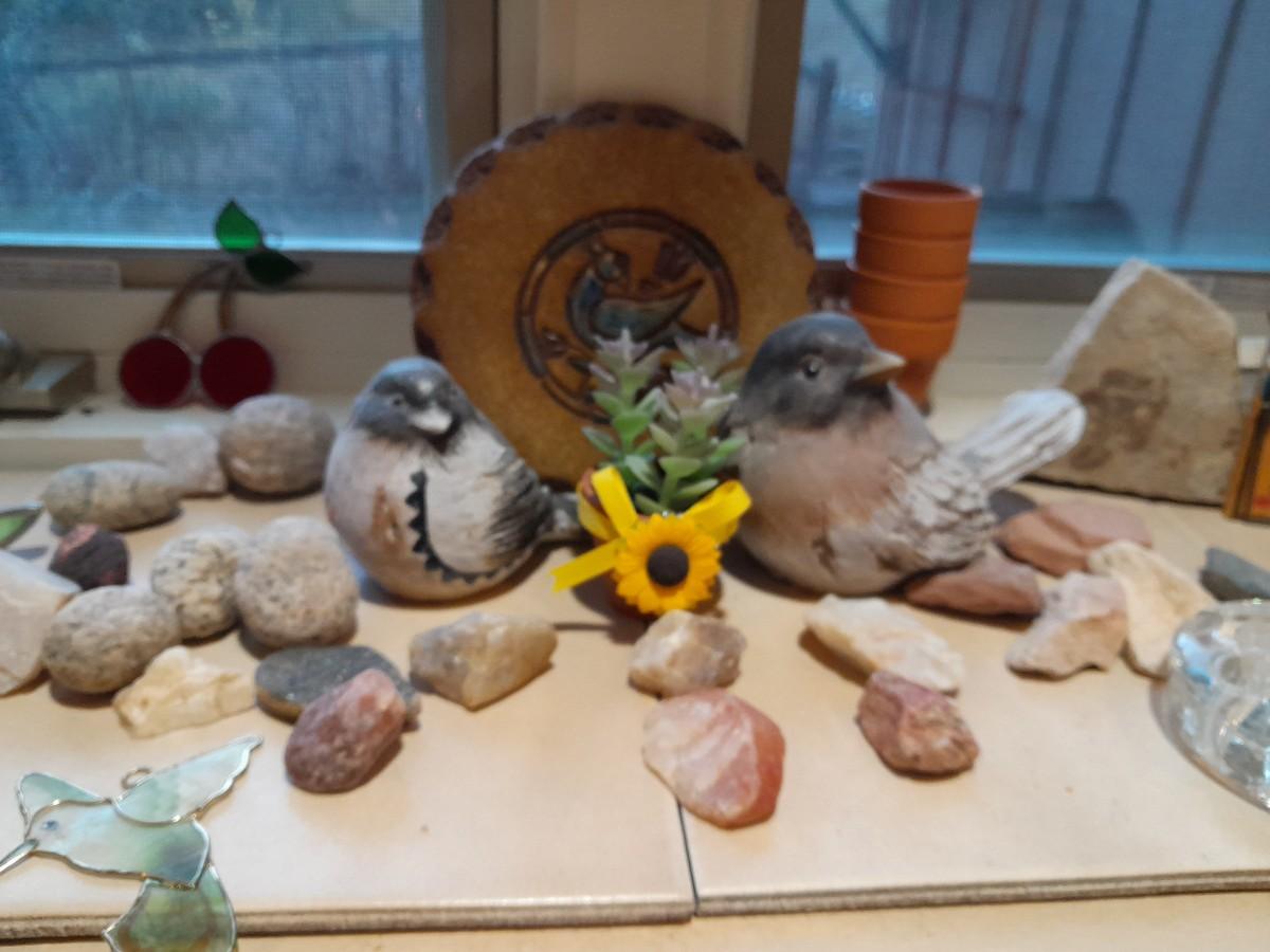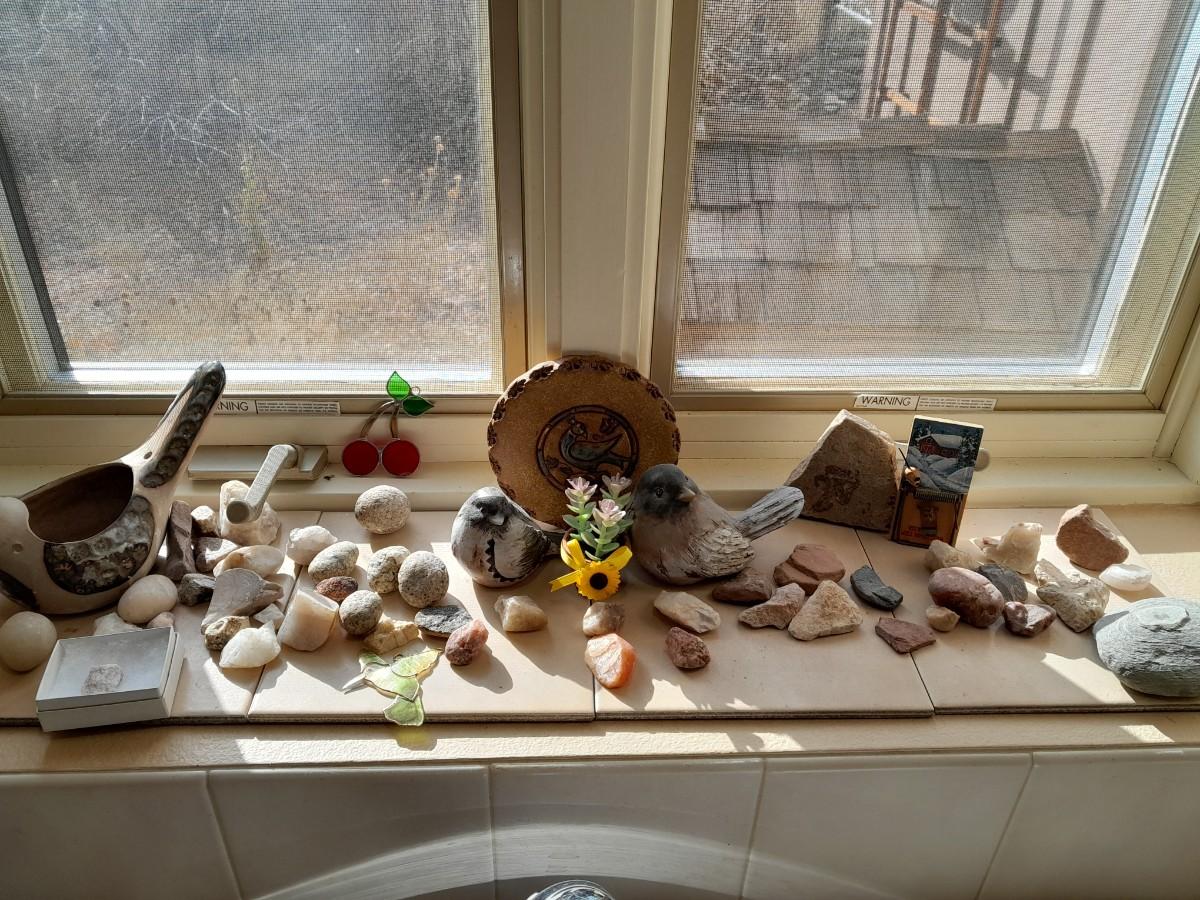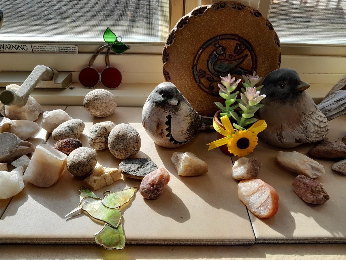 SMALL ROCK COLLECTION WITH BIRD FIGURES, STAINED GLASS HUMMINGBIRD, AND CHERRIES, PAINTED MOUSETRAP, GLASS FLORAL FROG, AND MORE