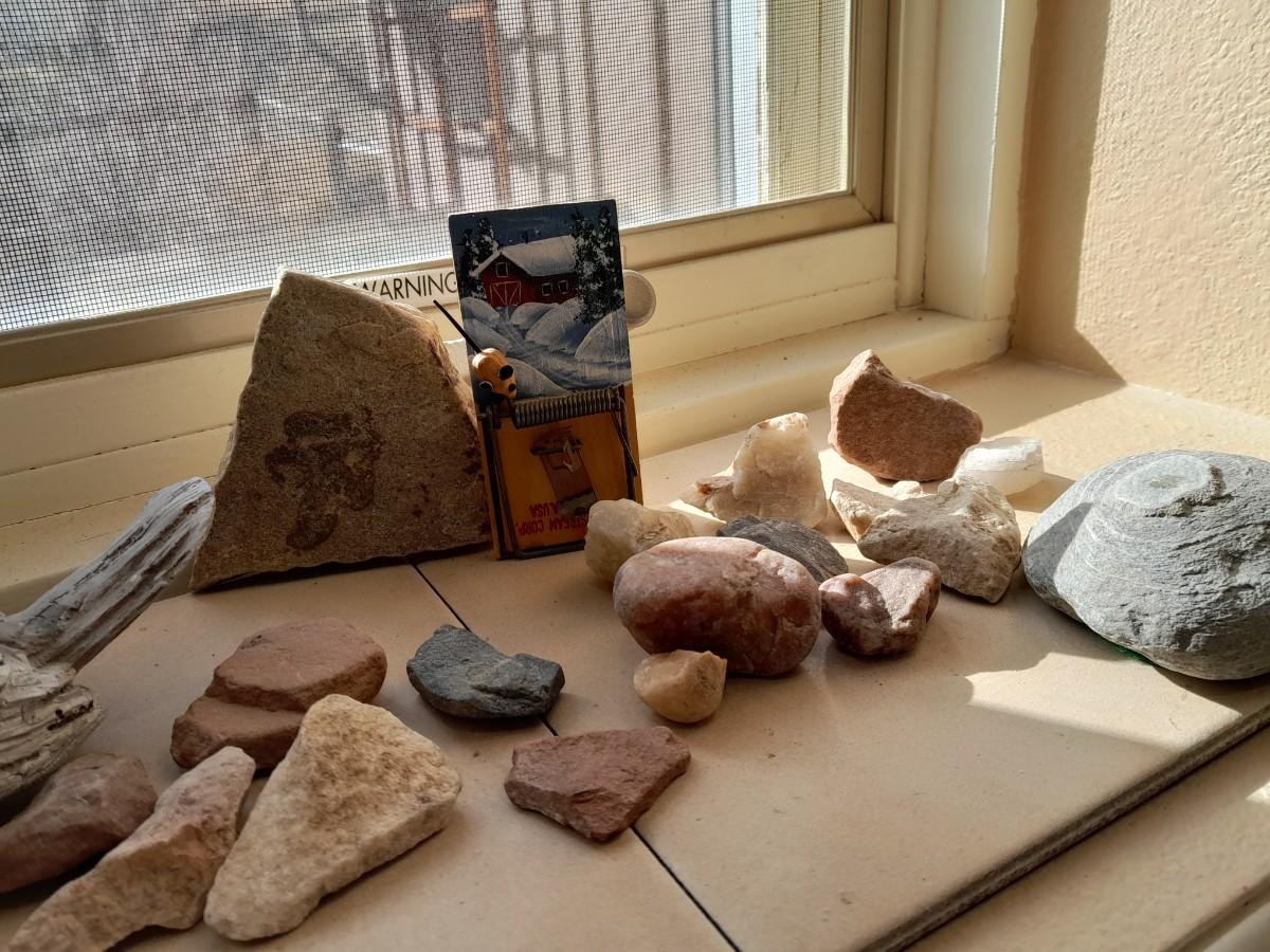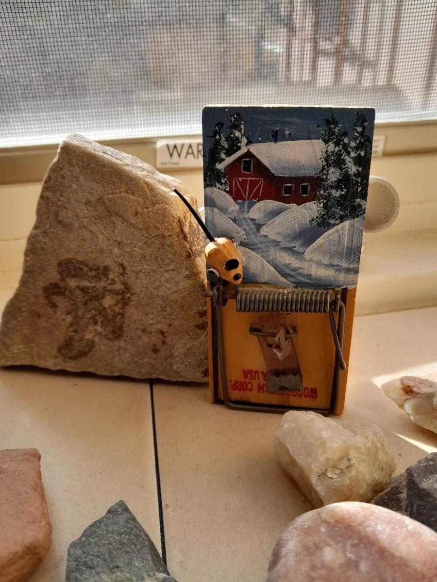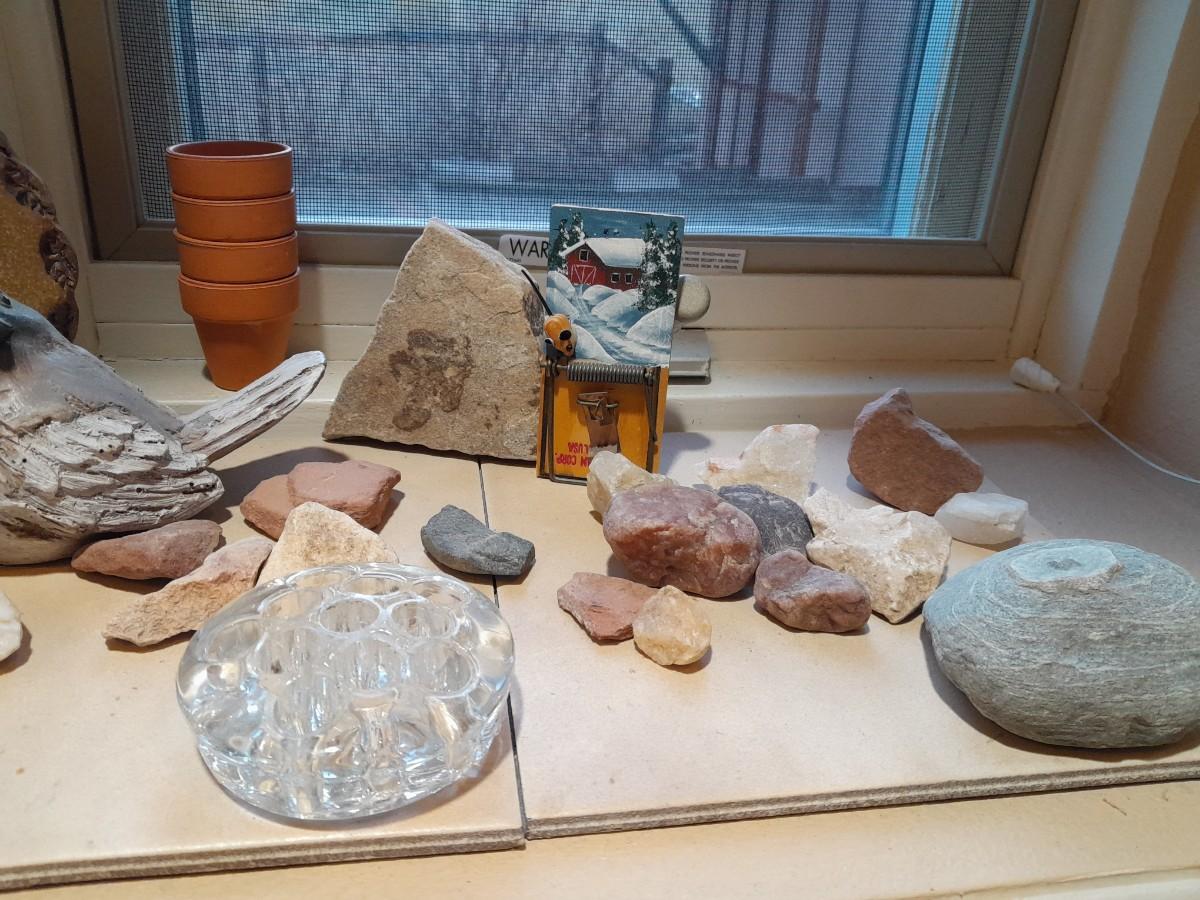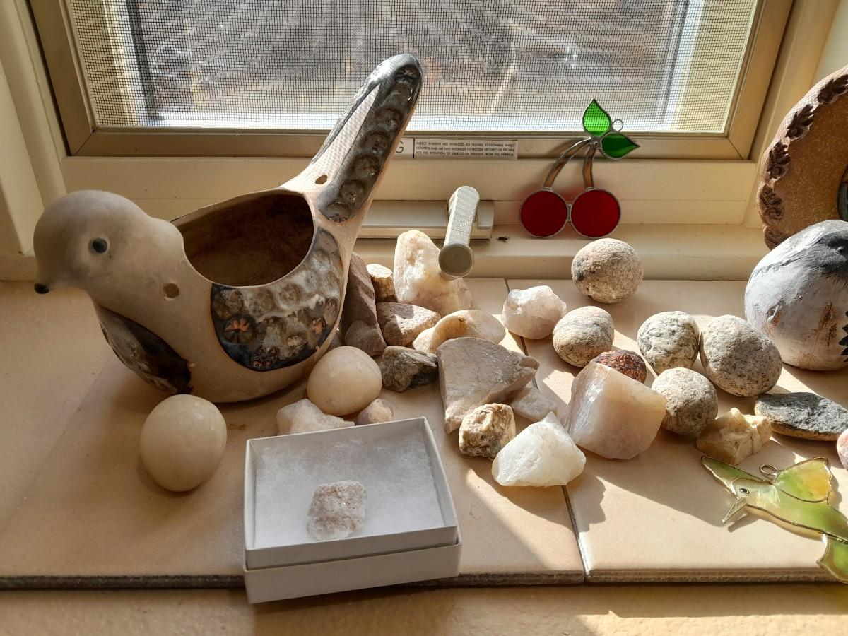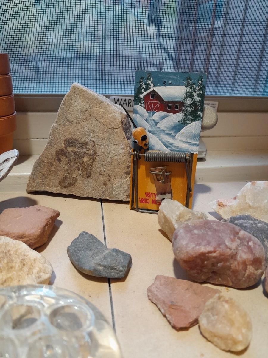 SMALL ROCK COLLECTION WITH BIRD FIGURES, STAINED GLASS HUMMINGBIRD, AND CHERRIES, PAINTED MOUSETRAP, GLASS FLORAL FROG, AND MORE