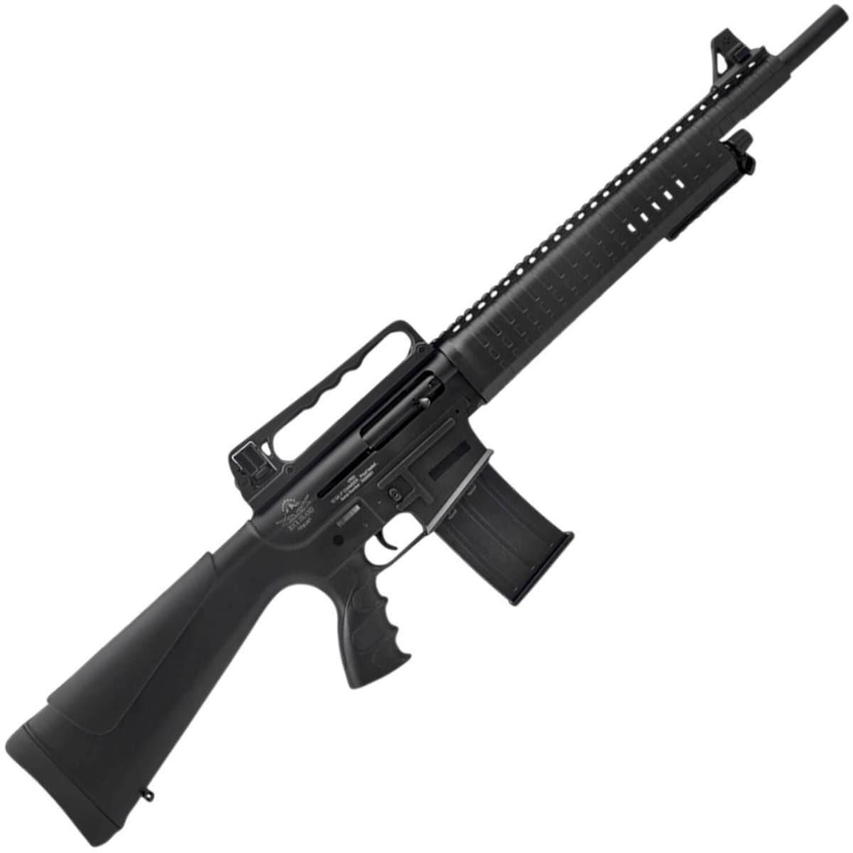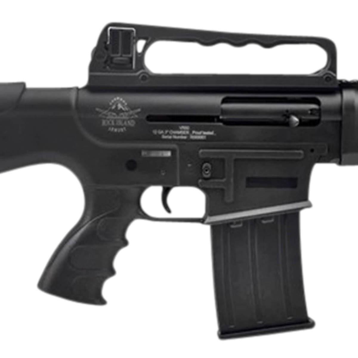 Rock Island VR60 Standard Black 12 Gauge 3in Semi-Automatic Shotgun - 20in - The VR60 AR semi-automatic shotgun uses a conventional gas-operated action which is located around the support tube that runs below the barrel. The upper receiver is manufactured from an aluminum alloy, has a carrying handle, and an integral Picatinny rail. The manual safety also duplicates the M16 style being located on the left side of the receiver above the pistol grip.