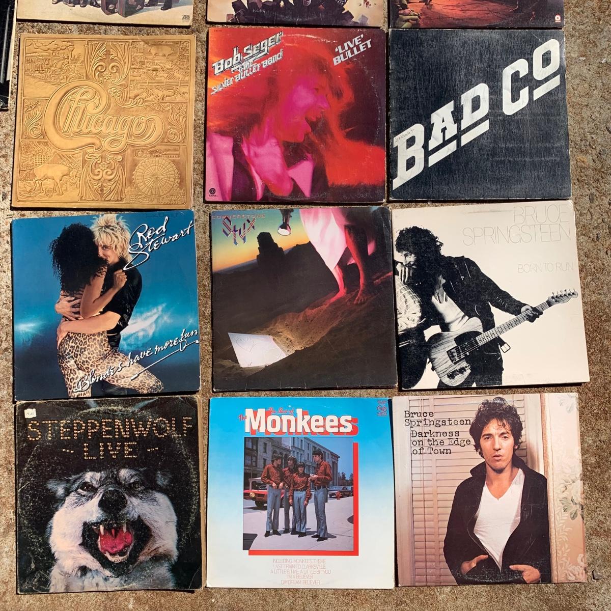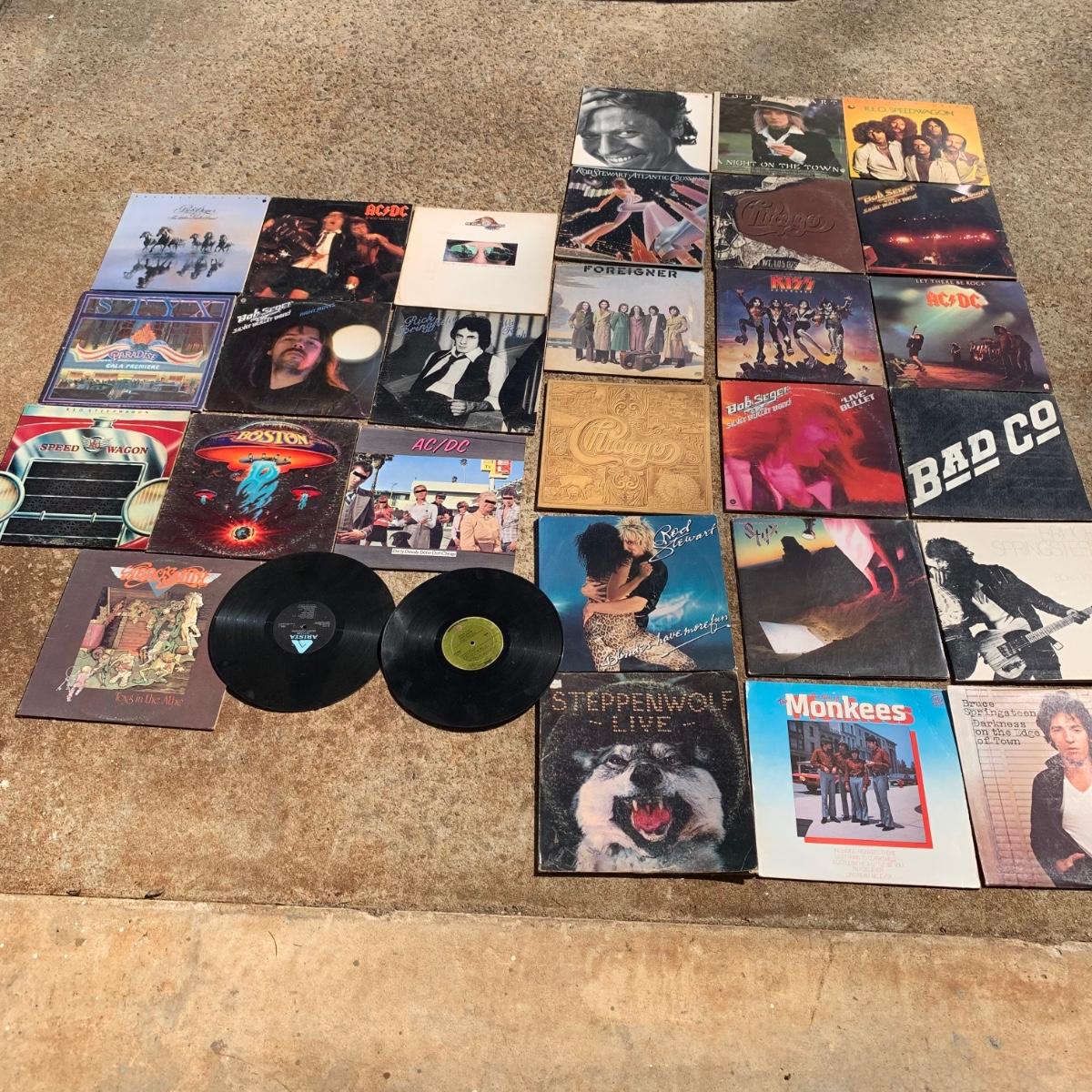 This lot includes approximately 30 rock and roll vinyl albums from the 1970s & “˜80s. You’ll find music here from artists such as Aerosmith, Steppenwolf, The Monkees, Bruce Springsteen, Rod Stewart, Bob Seger, AC/DC, Chicago, and more. The albums are all in used condition. There is one album without an album cover and is a bit warped (Alice Cooper’s School’s Out). Shipping available.