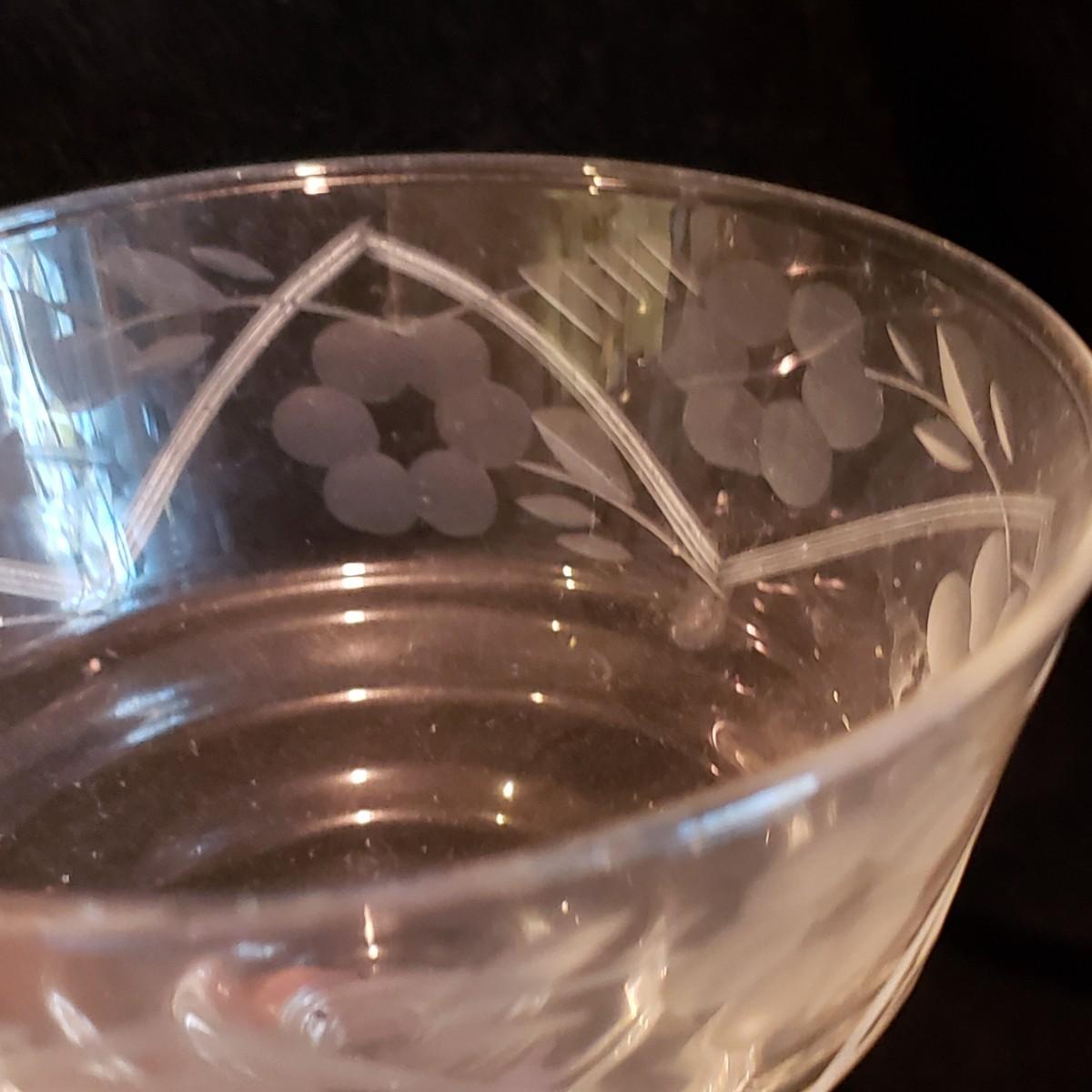 This is a Rock Sharpe style etched glasses and plates lot. There are ten, 6" plates. They appear to be blemish free, with the exception of one has a sticker residue on it, see picture. The 10 champagne/tall sorbet glasses have a textured stem and etched glass. Each glass measures 4" x 6"H. The glasses and dishes need a washing.