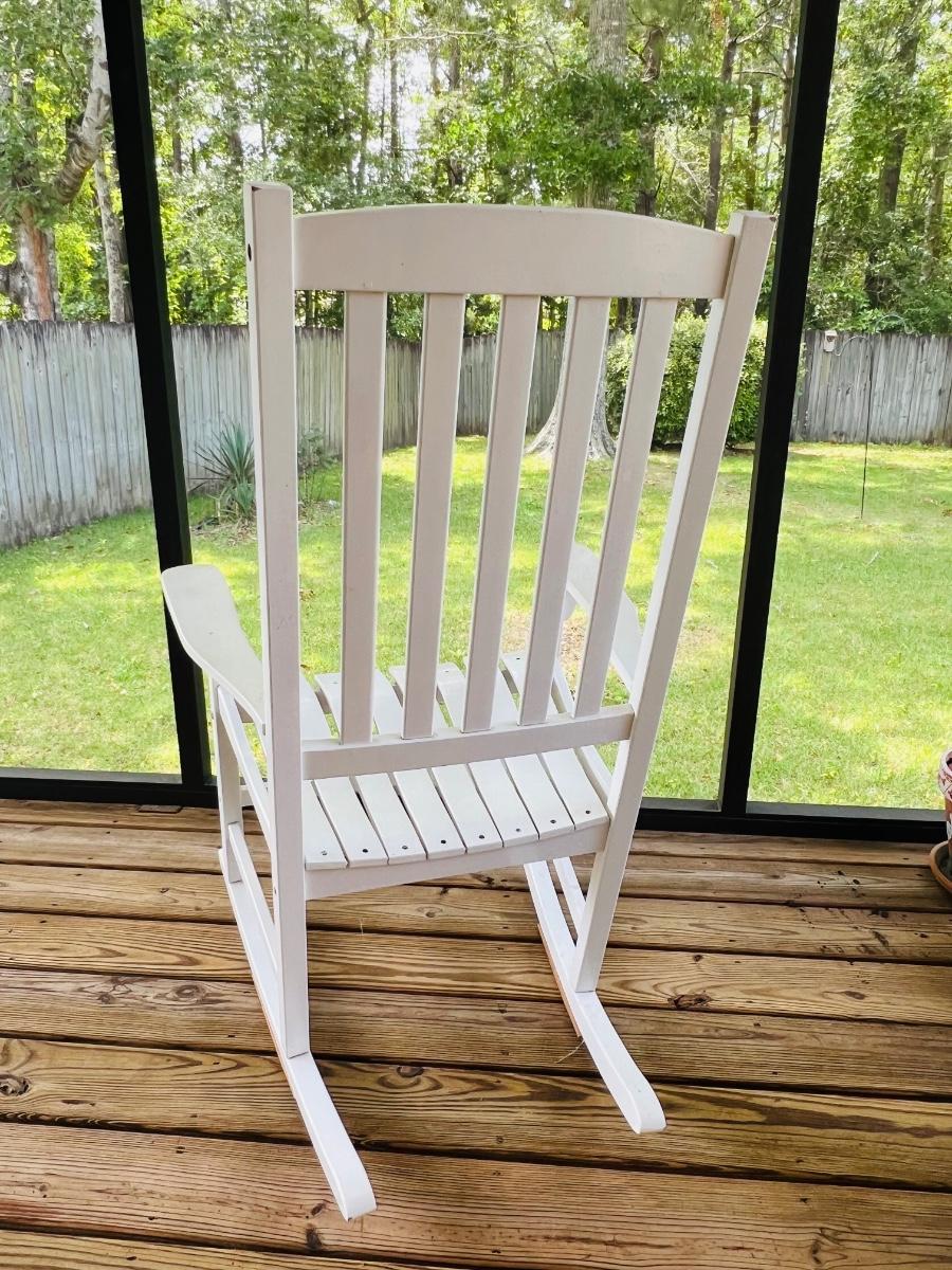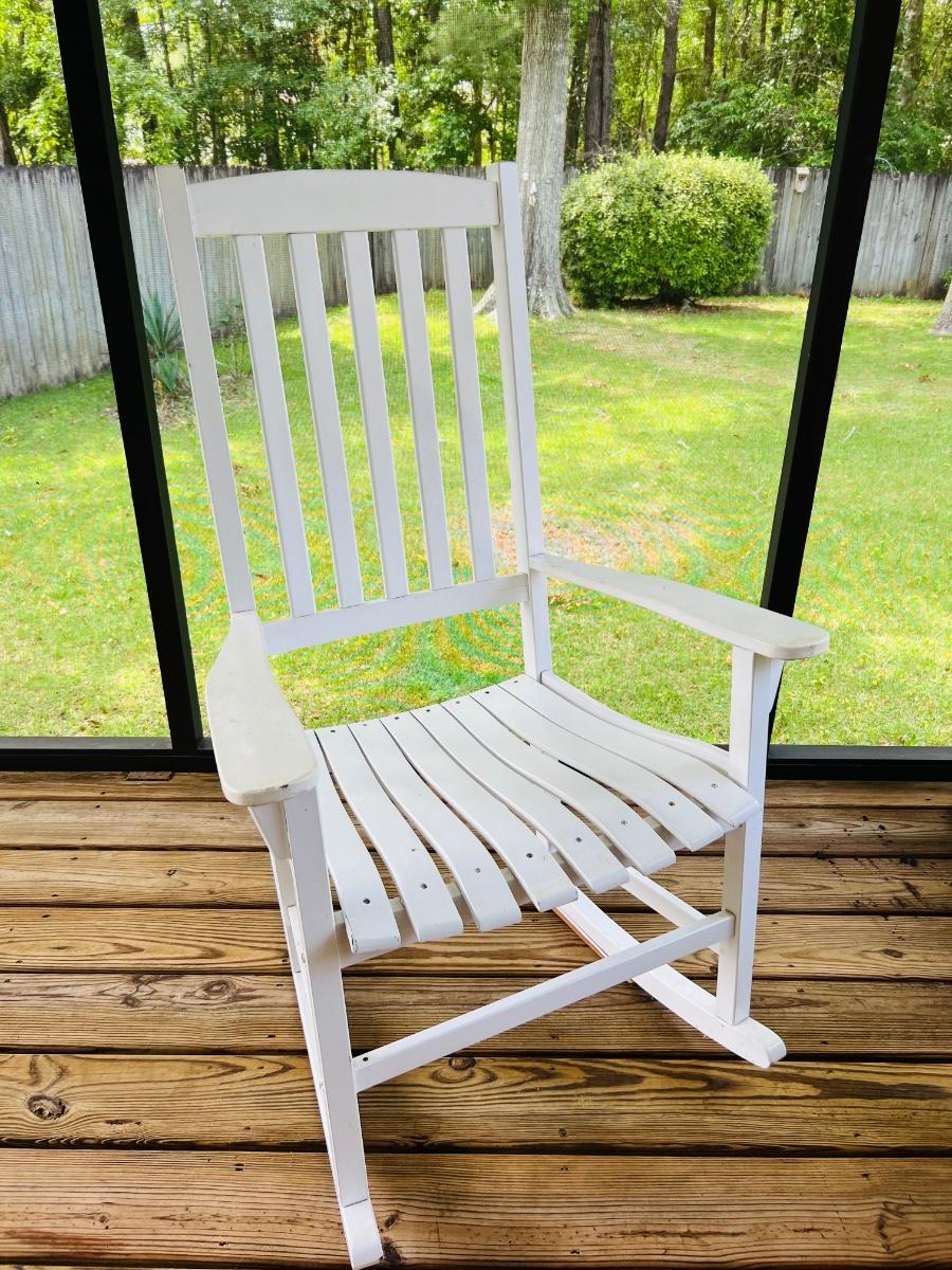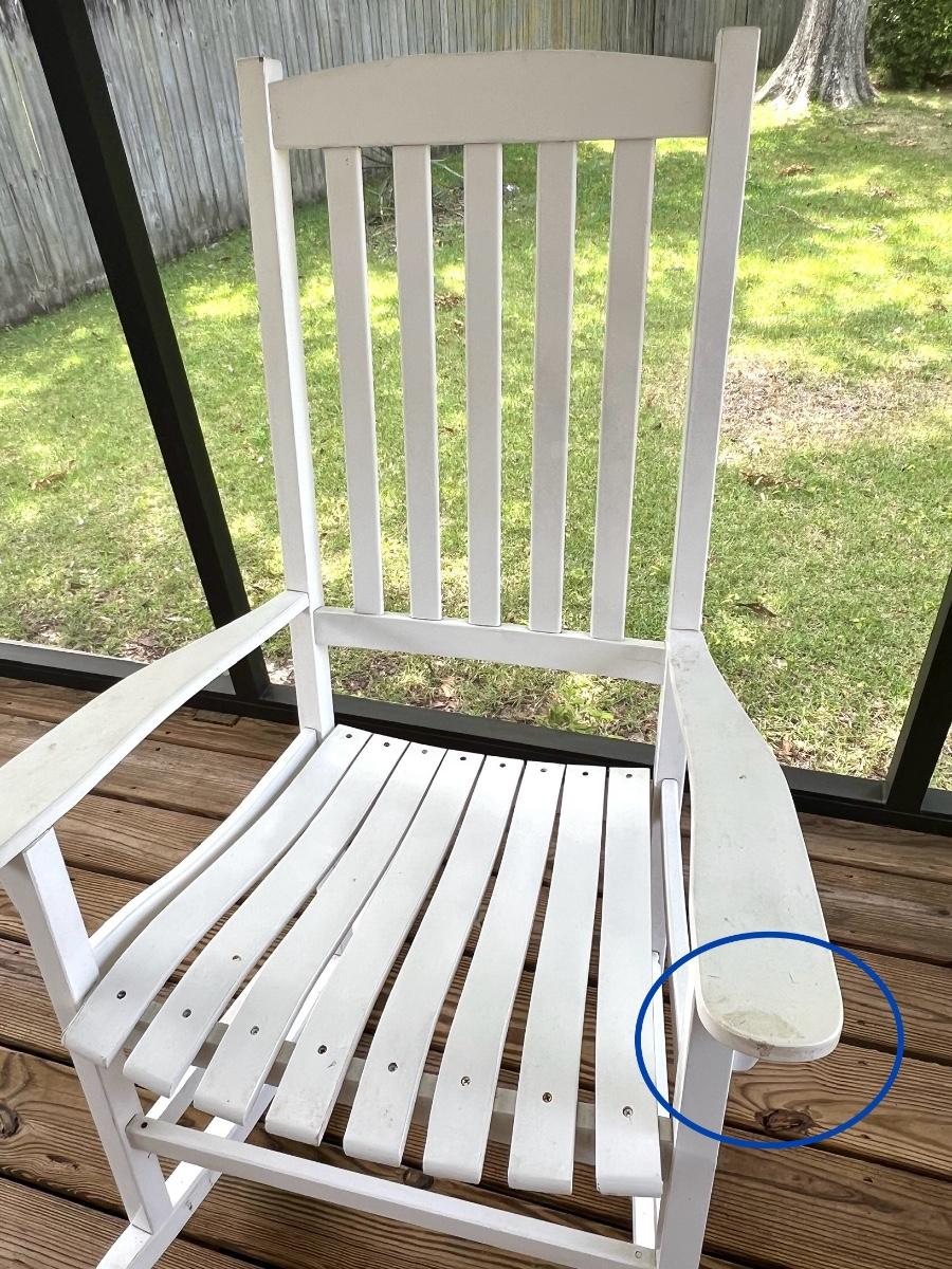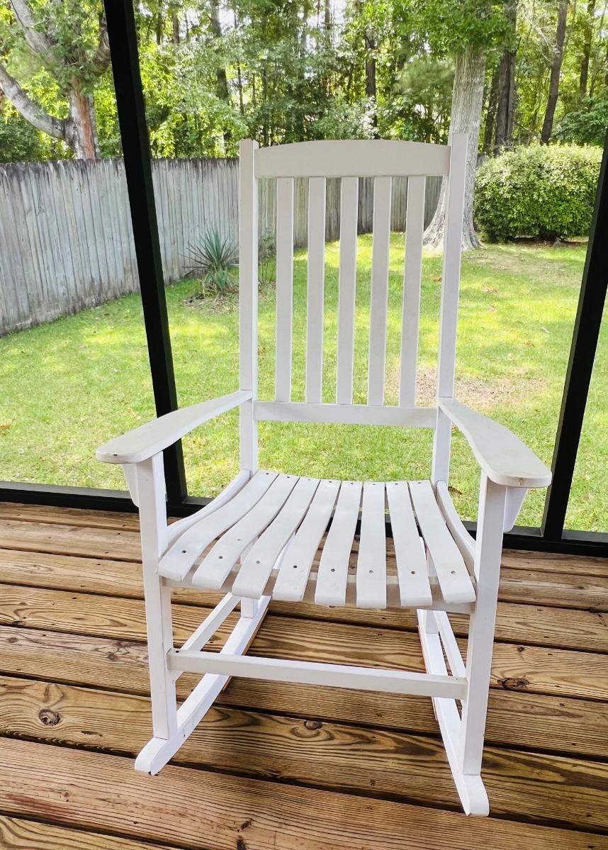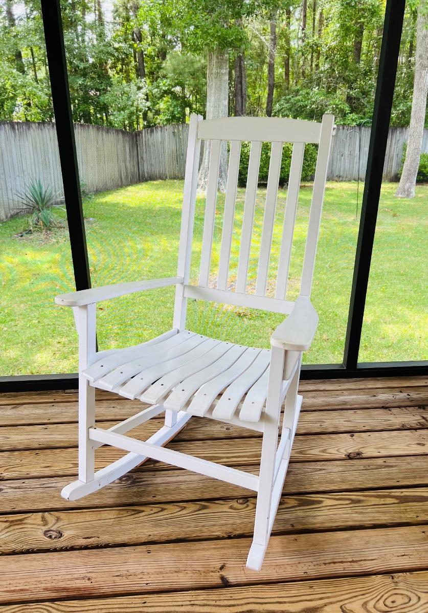 White, wooden rocking chair. Rocker measures 45 inches tall, 28 inches at its widest and 32 inches deep. Floor to seat measures 18 inches tall. Arm rest is discolored, see picture.