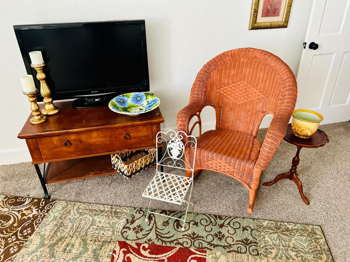 Rocker lot with TV, Art, Candles, Rug, Childs chair, Decorative Bowl,.