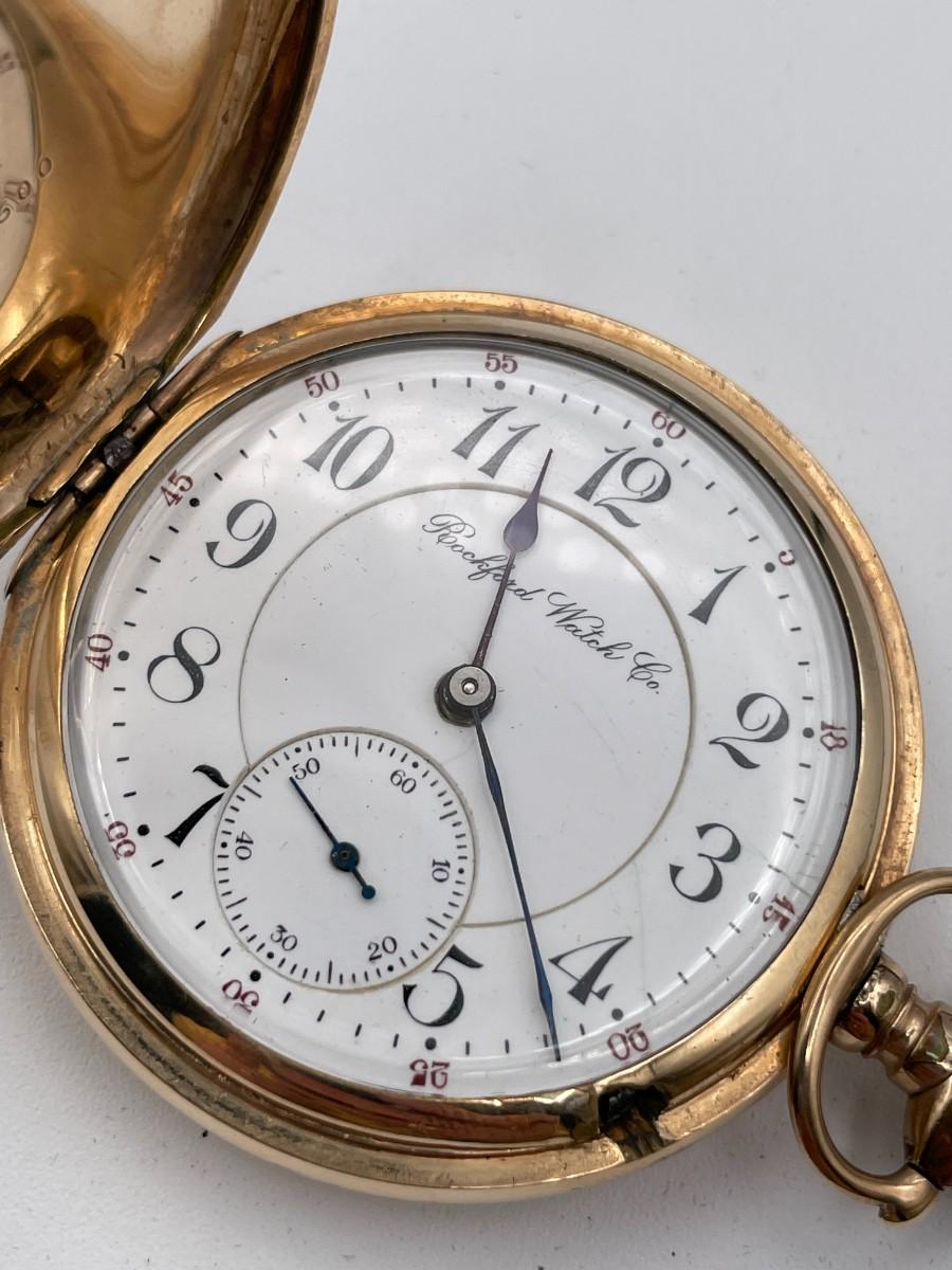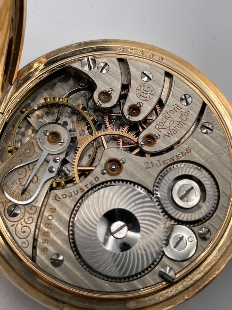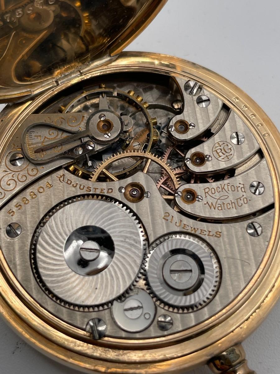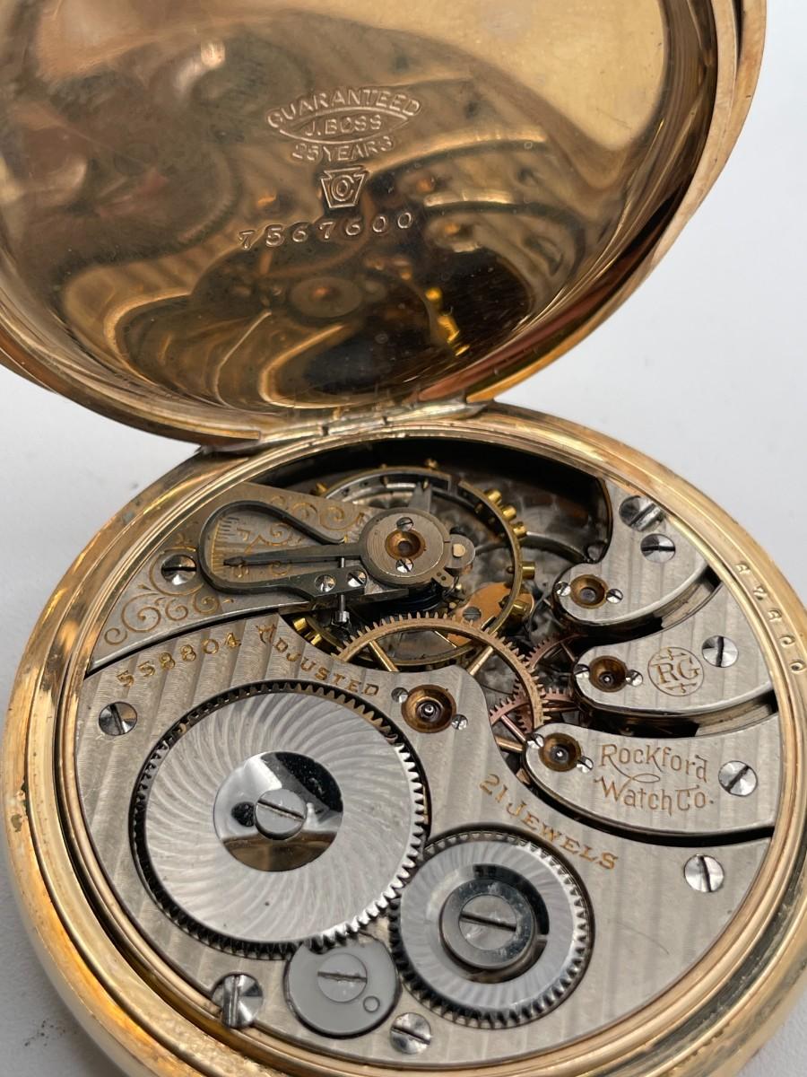 Rockford Watch Co., No. (558804), Size 16s, prod yr. 1908, 21 Jewels. Case: Keystone No. 7567600, Jboss Guar 25 yrs. Condition - Winder & watch are in working order. This is not a guarantee that all parts are original nor is the watch autheniticated.