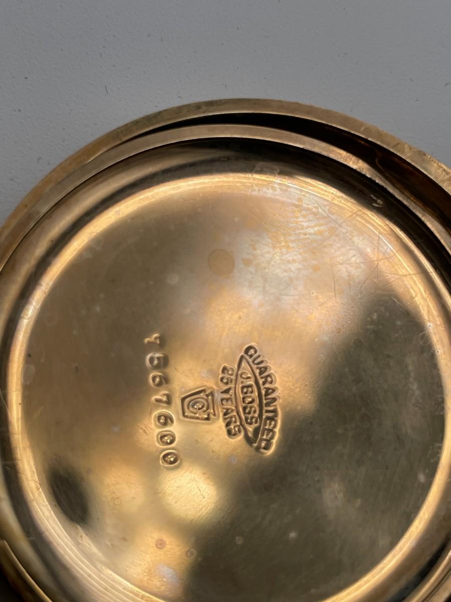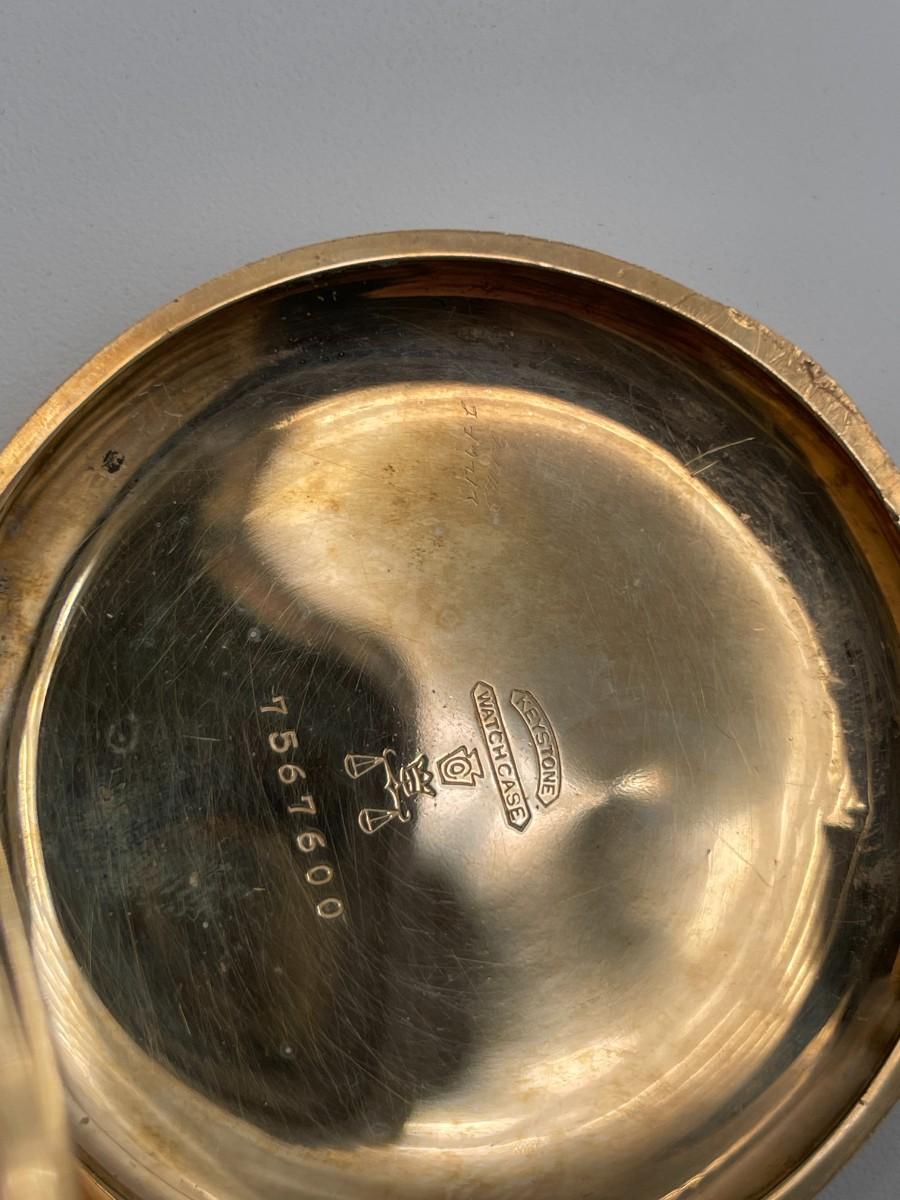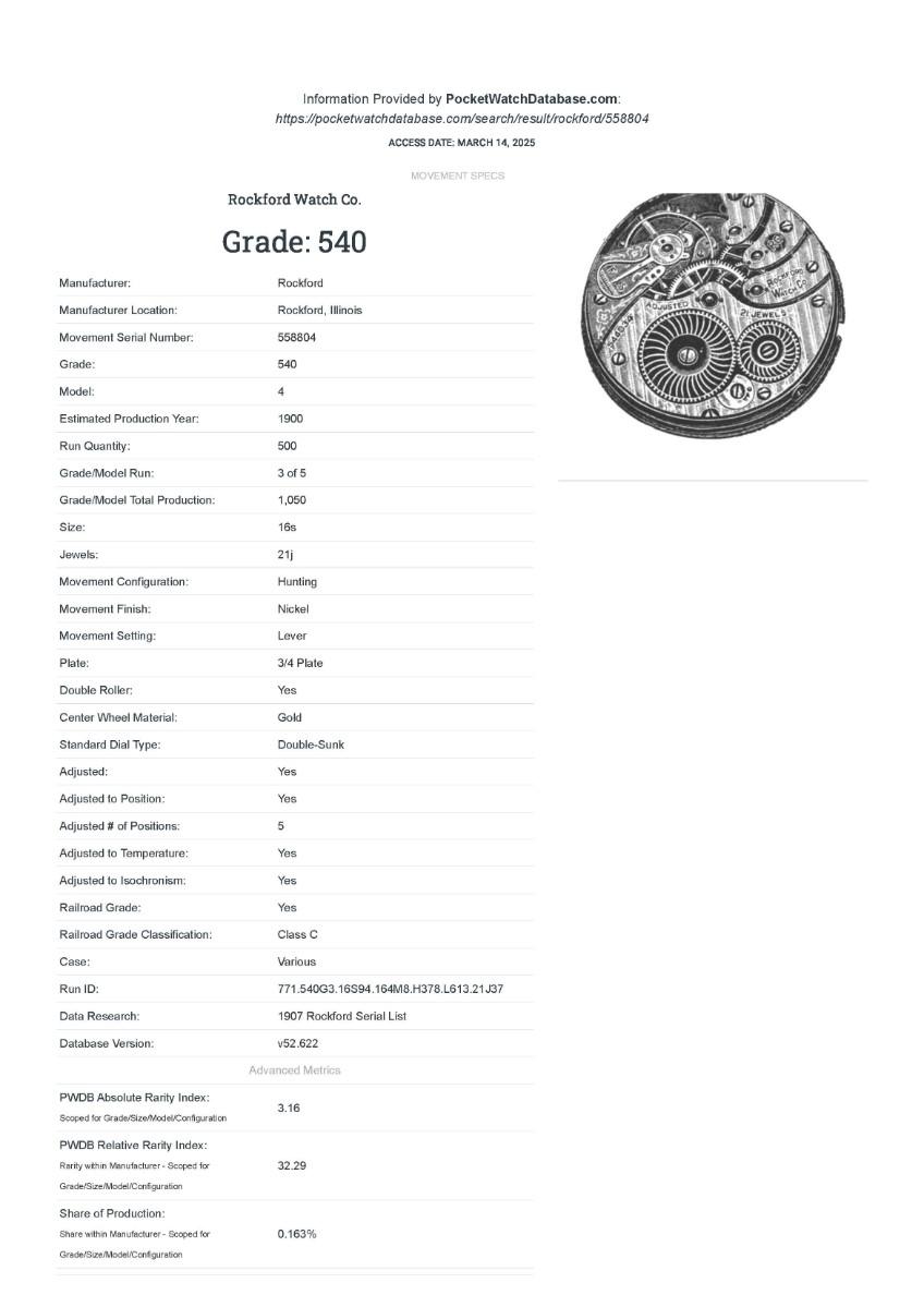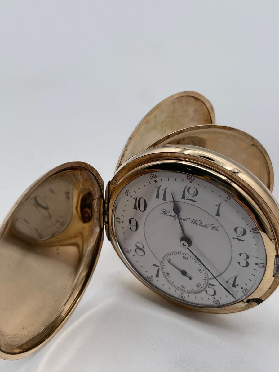 Rockford Watch Co., No. (558804), Size 16s, prod yr. 1908, 21 Jewels. Case: Keystone No. 7567600, Jboss Guar 25 yrs. Condition - Winder & watch are in working order. This is not a guarantee that all parts are original nor is the watch autheniticated.
