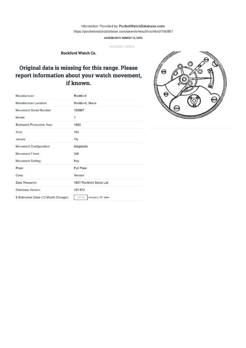 Rockford Watch Co., No. 100897, Size 18s, Prod. Yr. 1880, Key Wind -- Key not included. Case: No. 173171, Dueber Coin. Condition - Winder & watch are in working order. This is not a guarantee that all parts are original nor is the watch autheniticated.