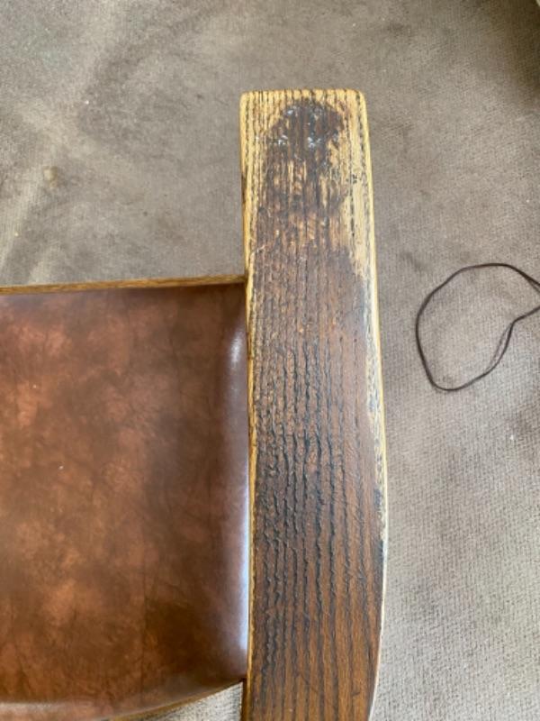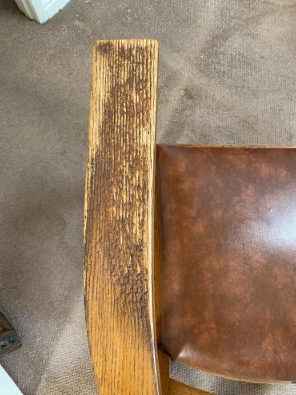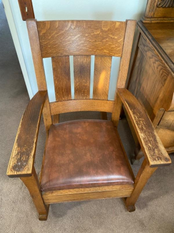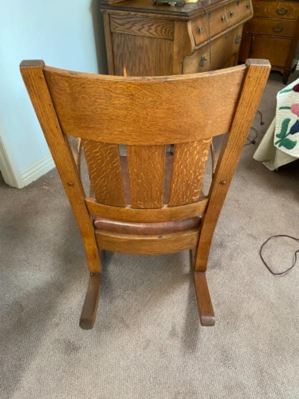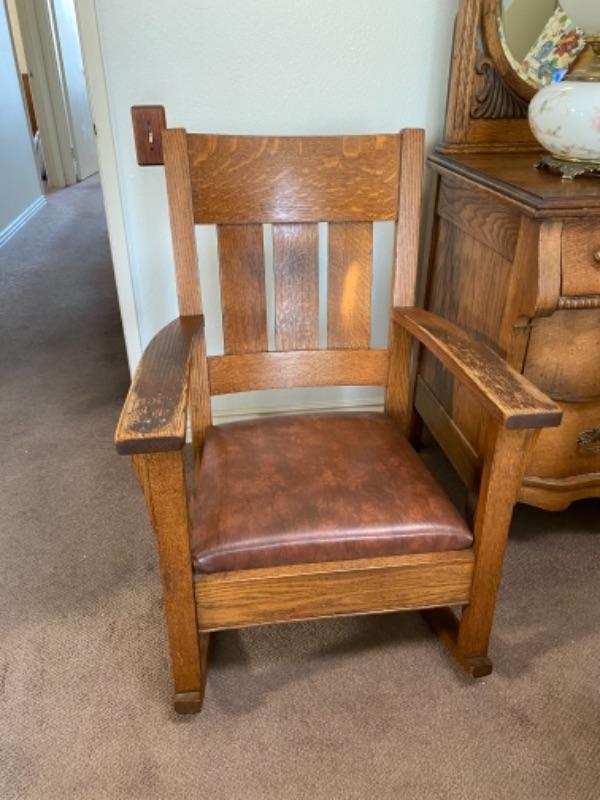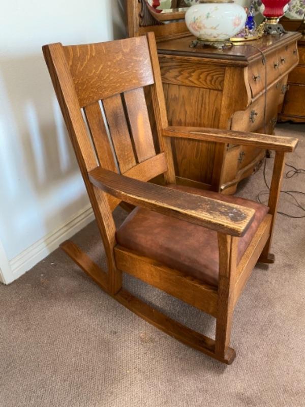 Vintage Arts & Crafts style rocking chair. Solid oak wood. Brown leather seat, possible faux, not original from looking at the underside. Wood needs to be cleaned, there is discolor on the arms from years of use. Sits a little low. The back is at 38" tall and total width is 26". No maker's mark,