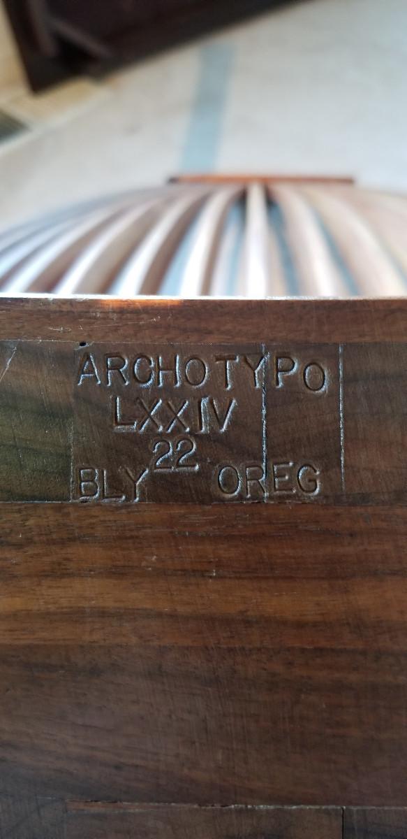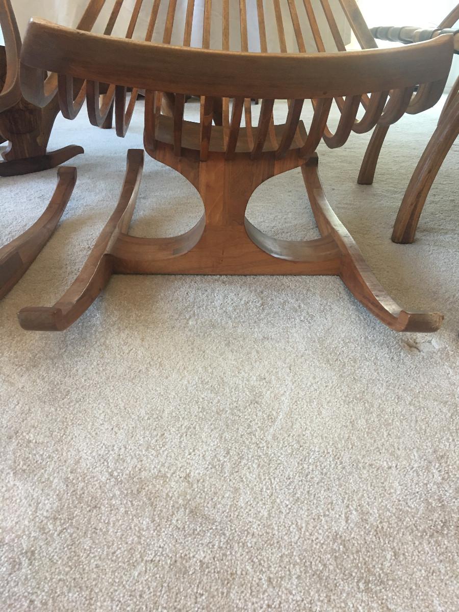 Rocking Chair. Dimensions - 39" h X 27 1/4" w X 39 1/2" w. Makers Mark: "ARCHOTYPO, BLY, L (50), 21". Mate to item 7. Item condition - Condition issue - has small "Puppy chew" on the right side, front rocker (see photo's). Otherwise, appears to show normal use commensurate with its age.