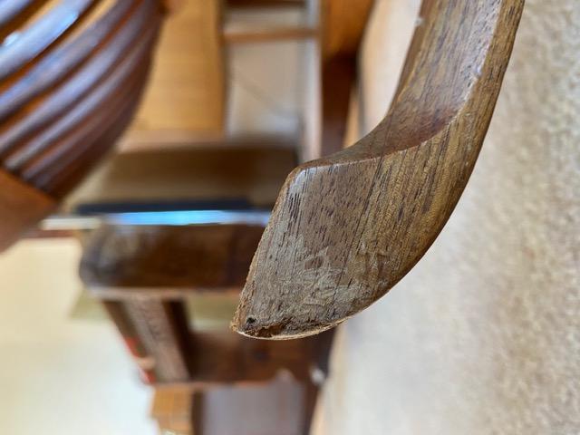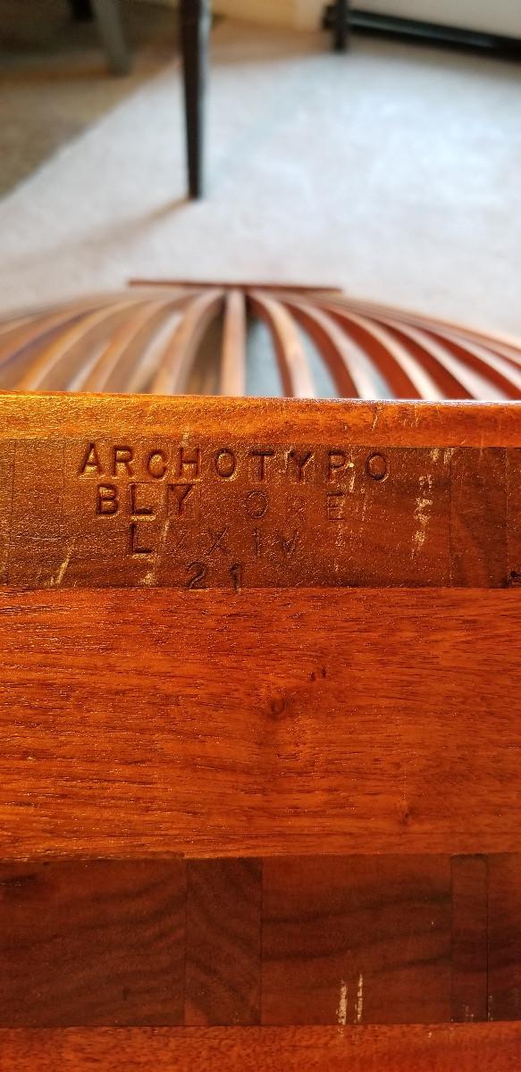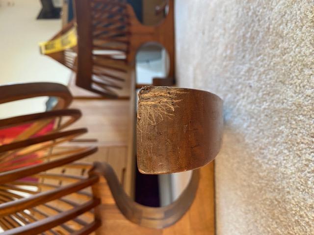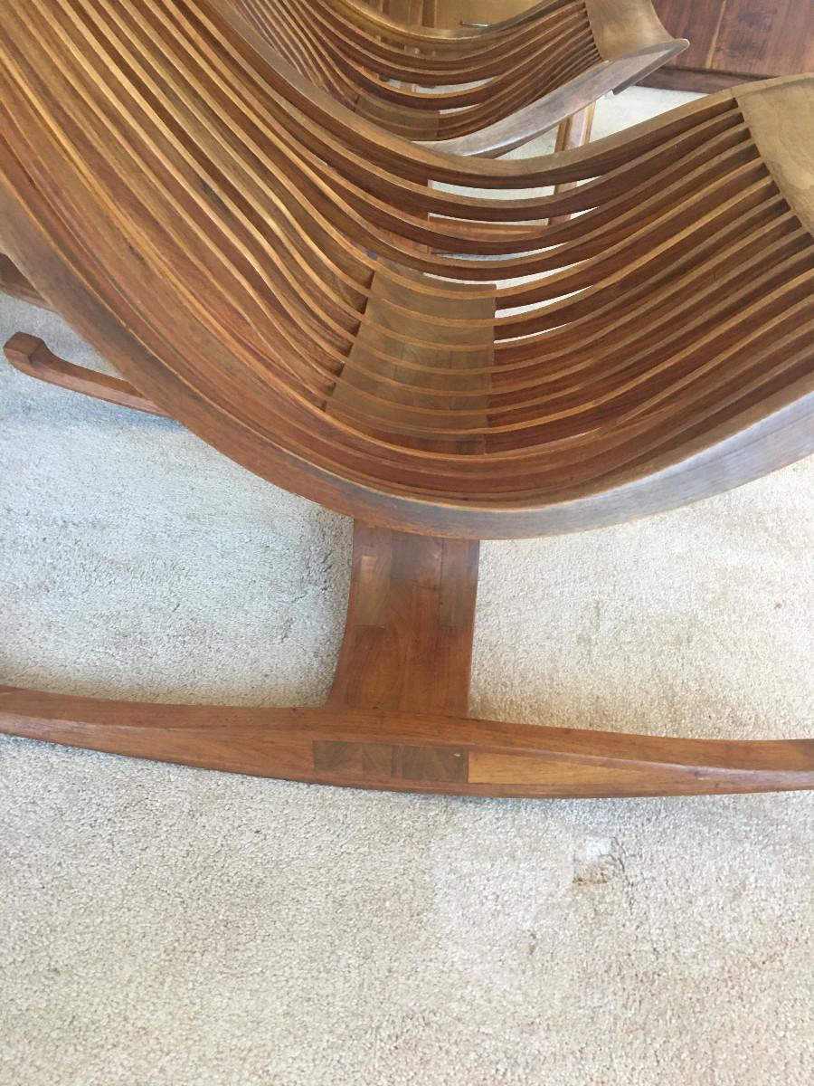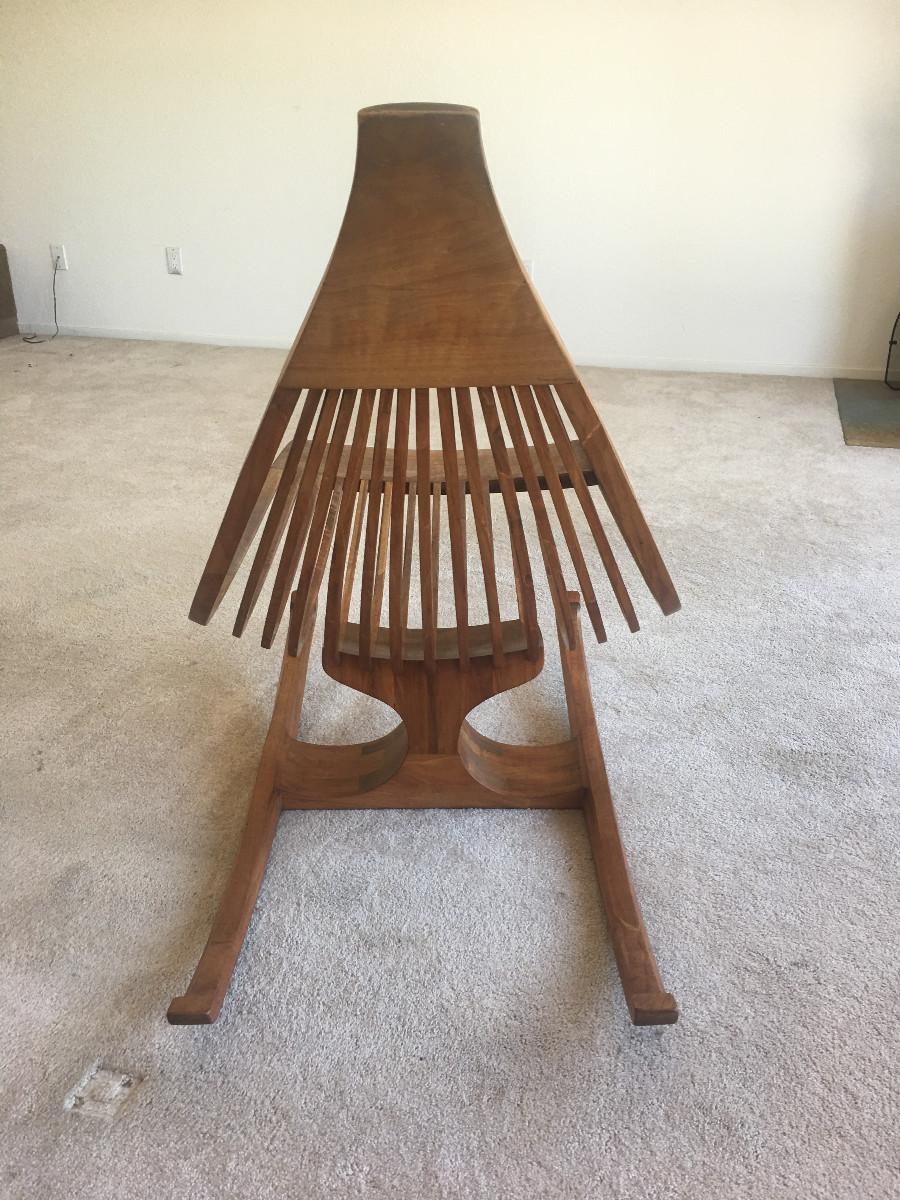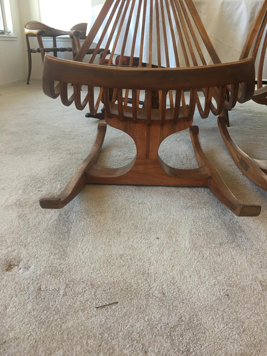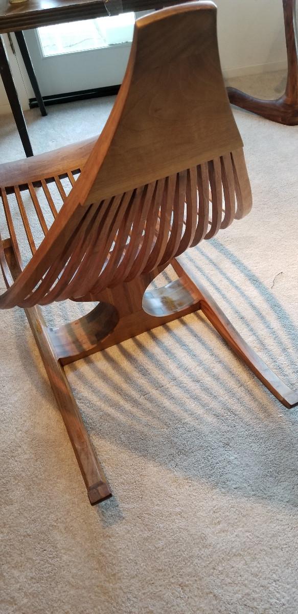 Rocking Chair. Dimensions - 39" h X 27 1/4" w X 39 1/2" w. Makers Mark: "ARCHOTYPO, LXXIV (74), 22, BLY OREG". Mate to item 6. Item condition - The item appears to show normal use commensurate with its age.