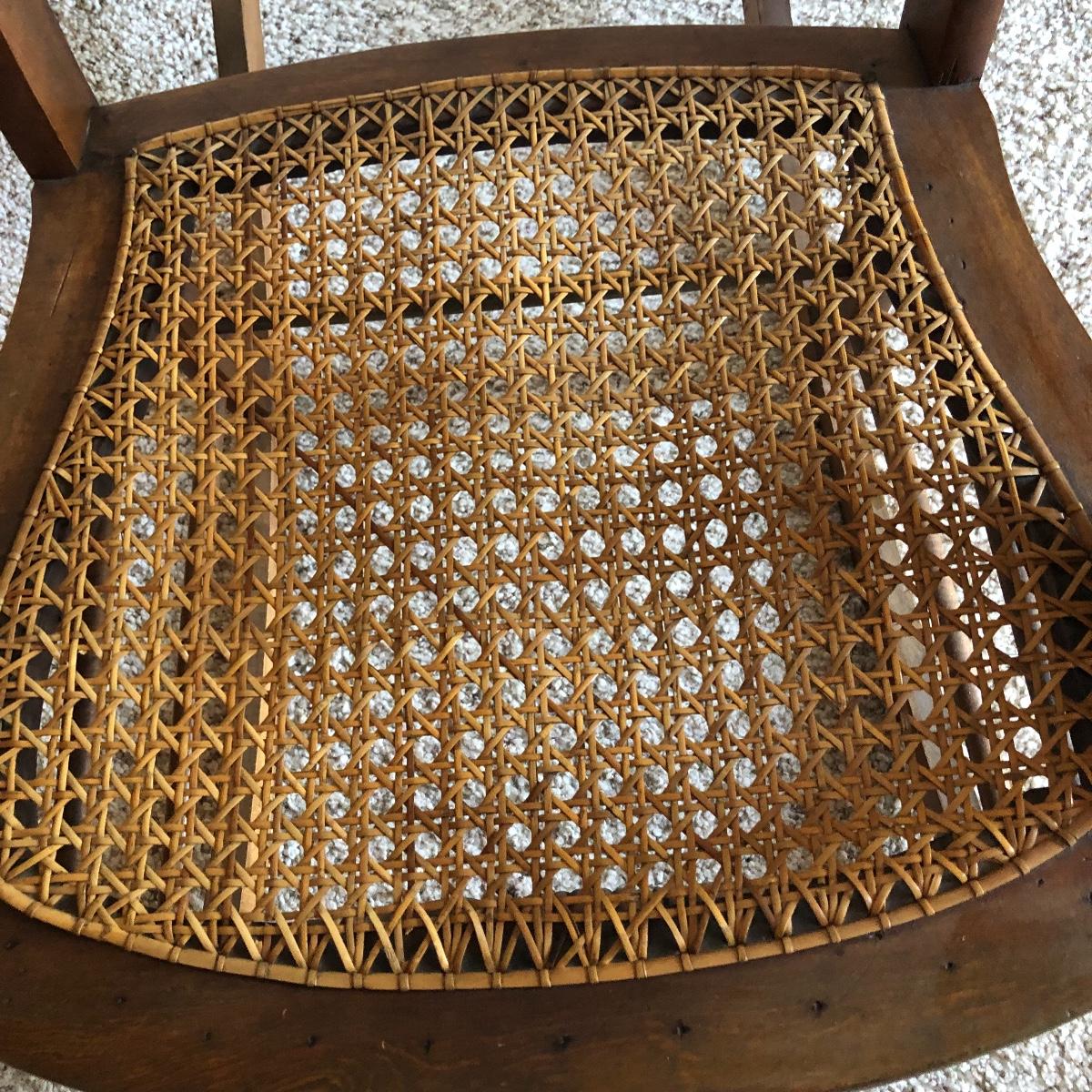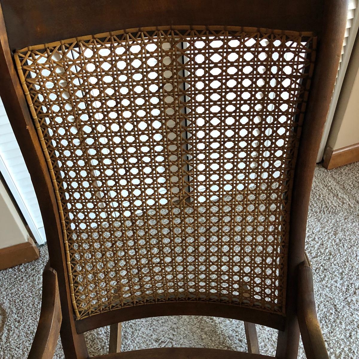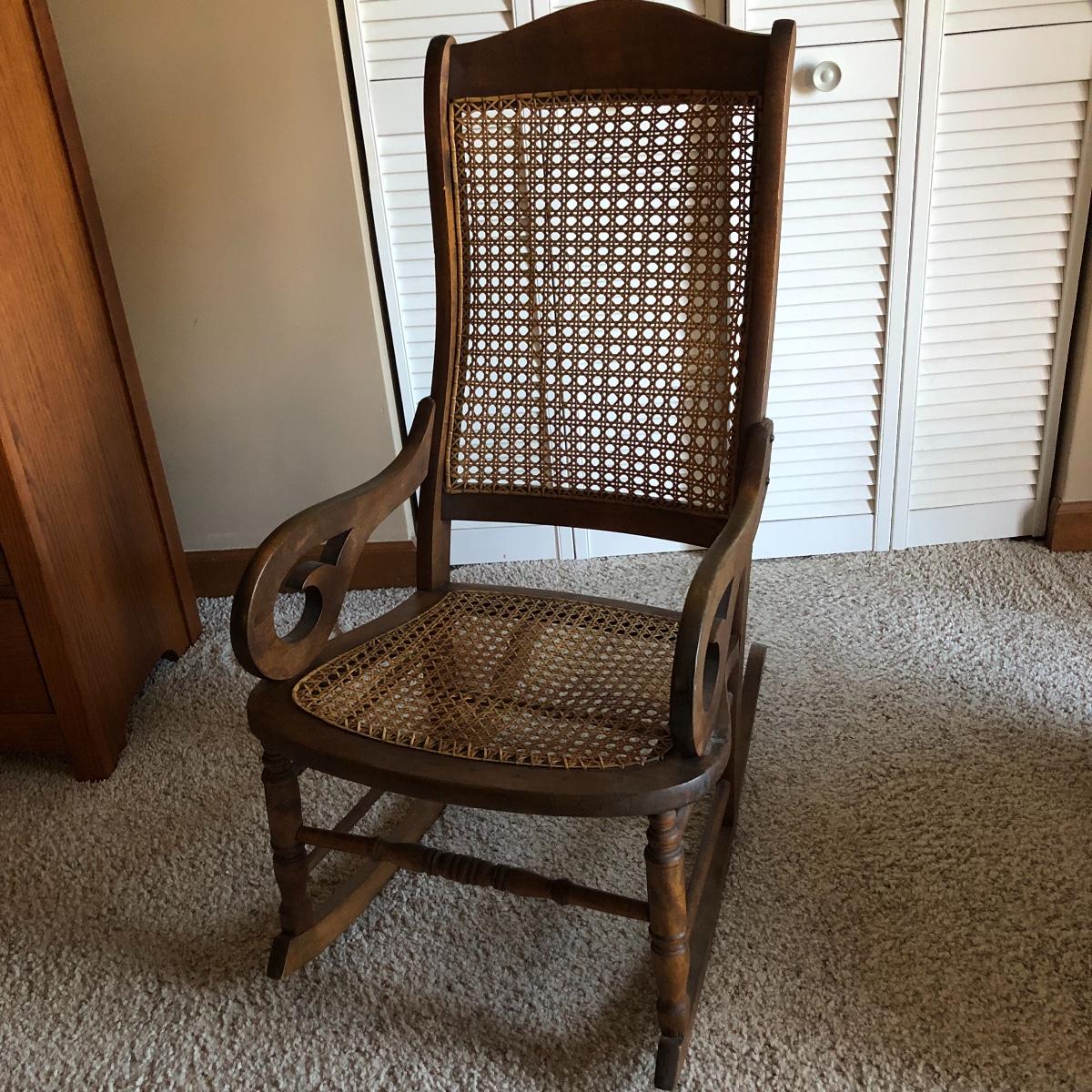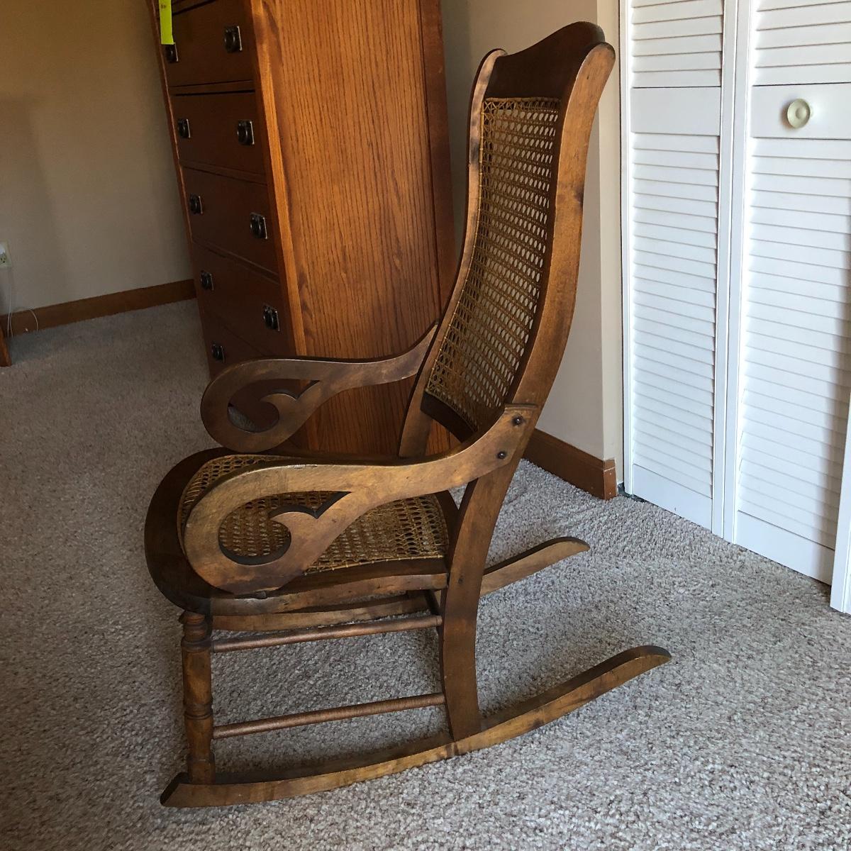 This cane rocking chair is all wood and has an intact woven seat and back.