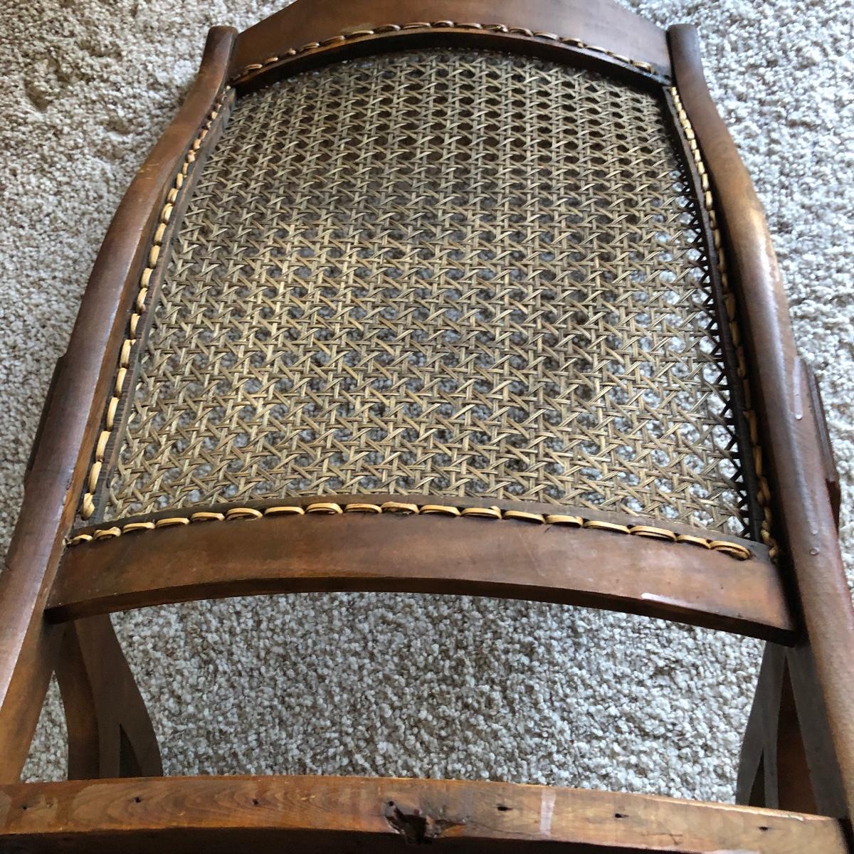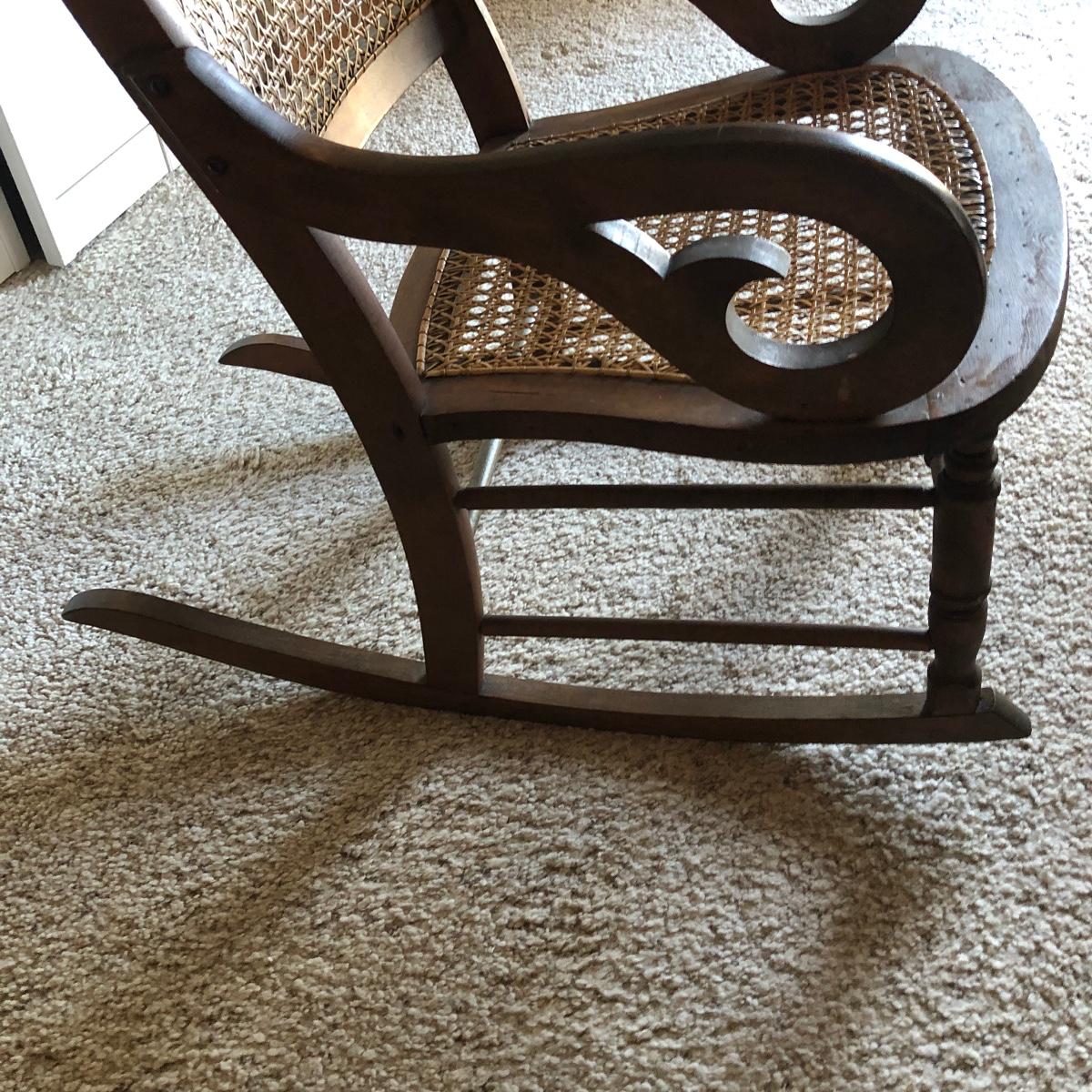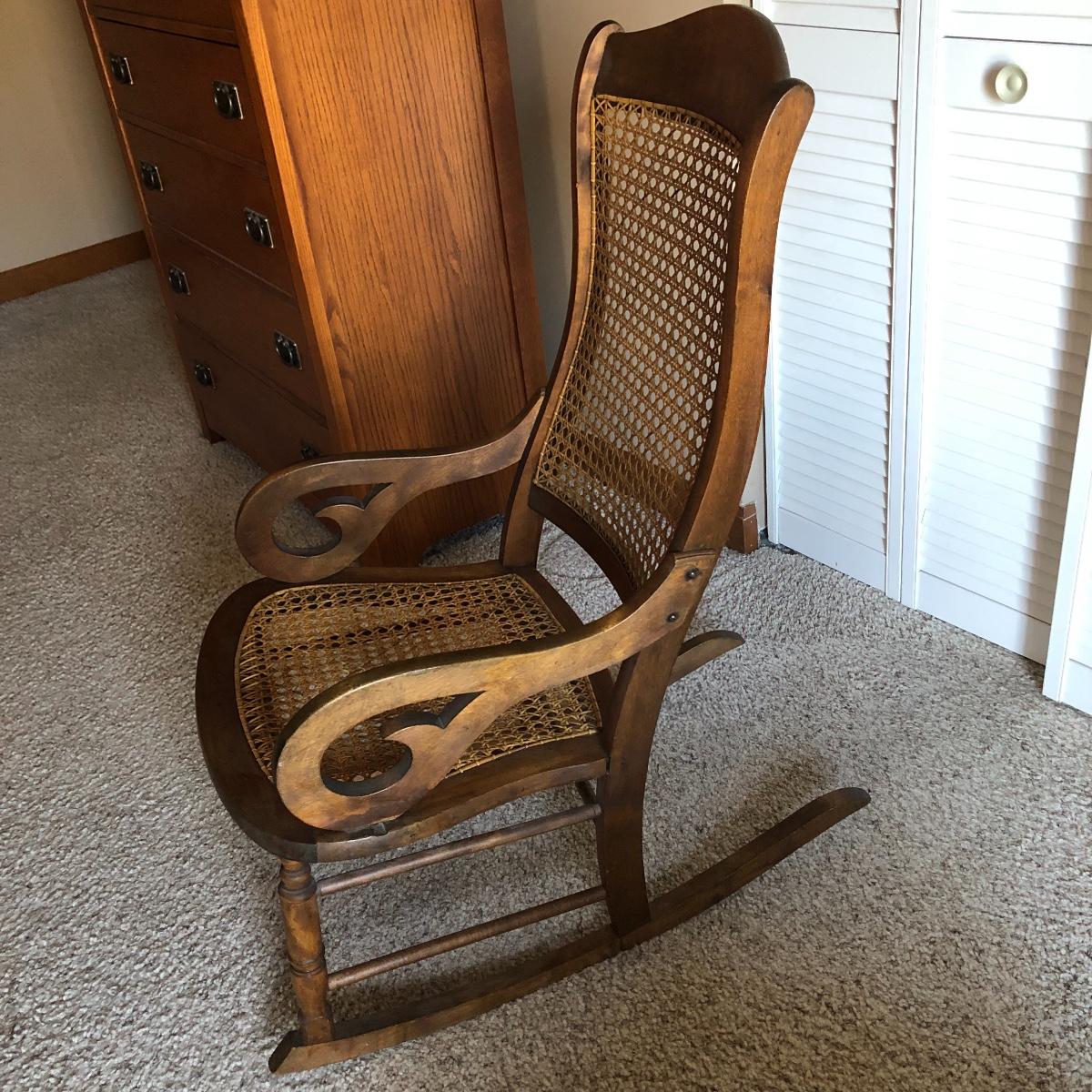 This cane rocking chair is all wood and has an intact woven seat and back.
