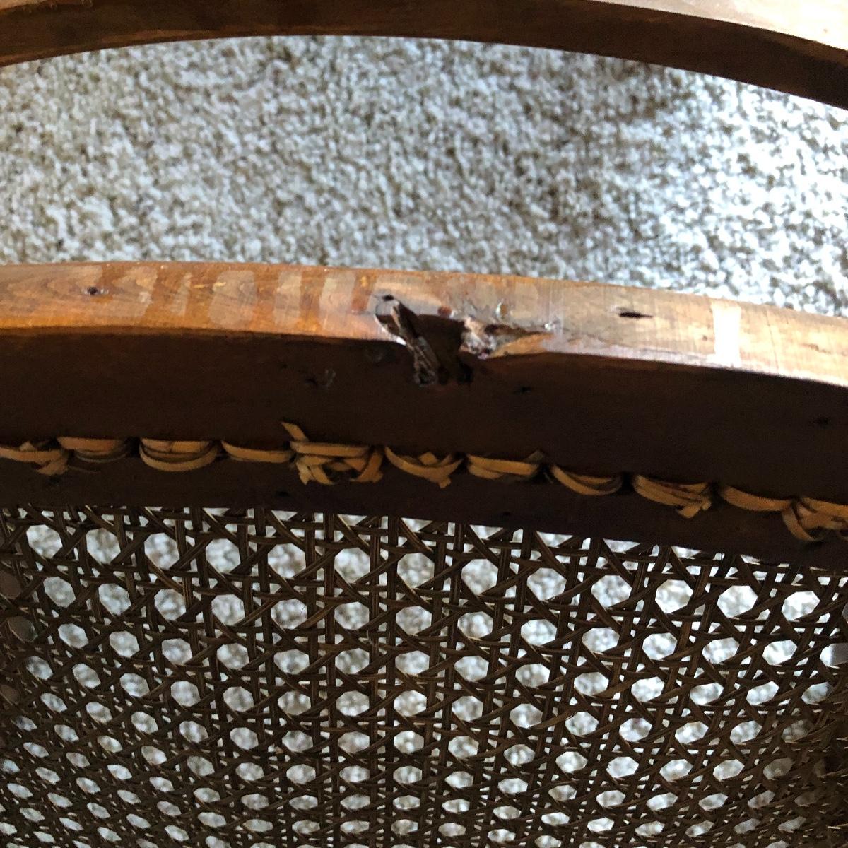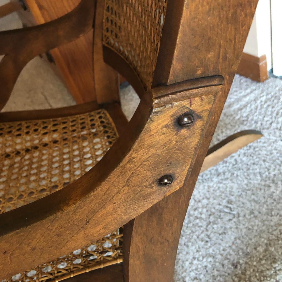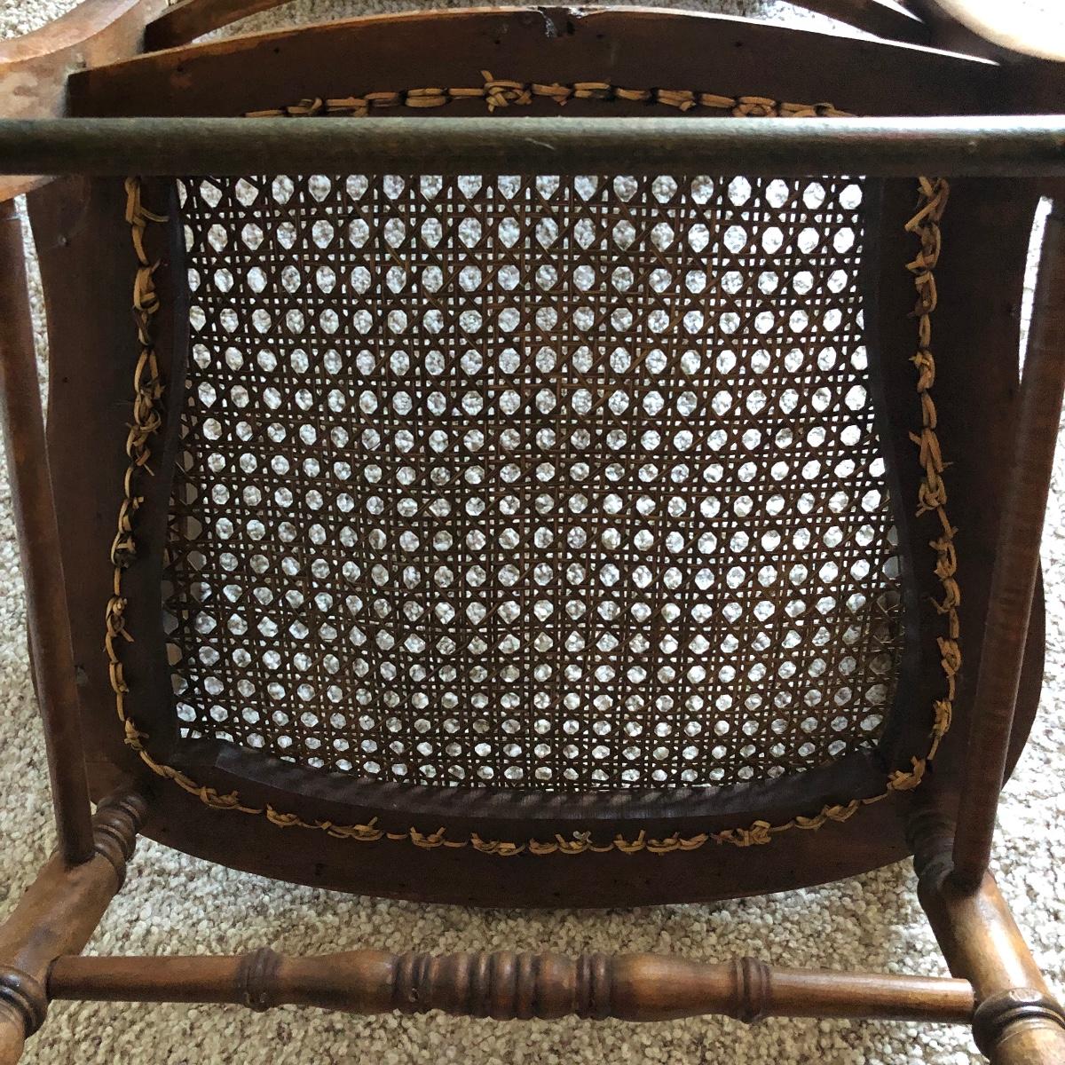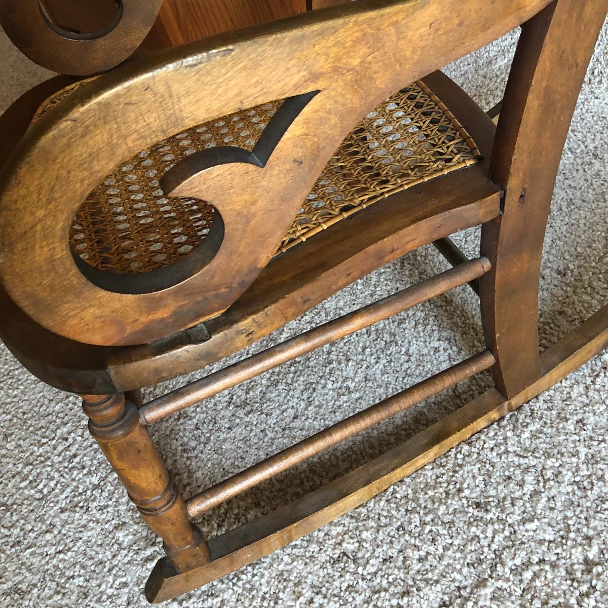 This cane rocking chair is all wood and has an intact woven seat and back.