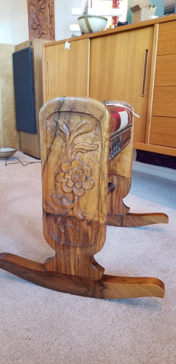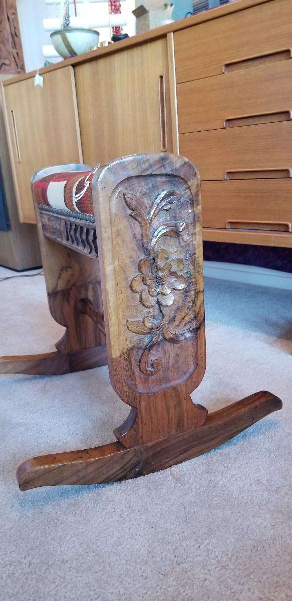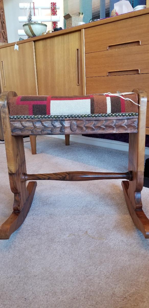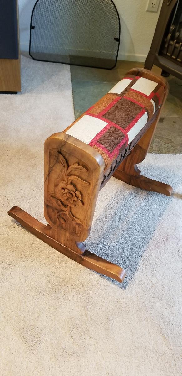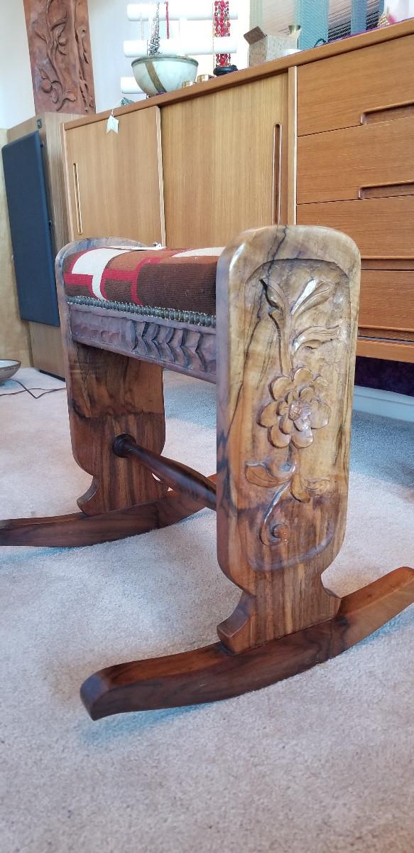 Rocking Foot Stool with Floral carvings. Dimensions - 18 1/8" h X 18" w X 17 1/8" d. Floral patterns are on both sides, as well as, the rails - front and back. Makers Mark: None noted. Item condition - appears to show normal use commensurate with its age.