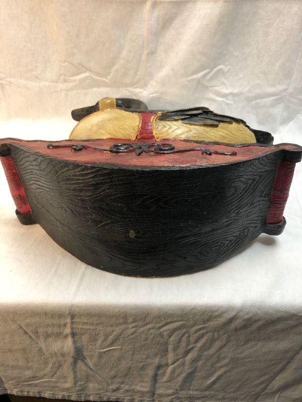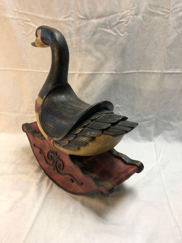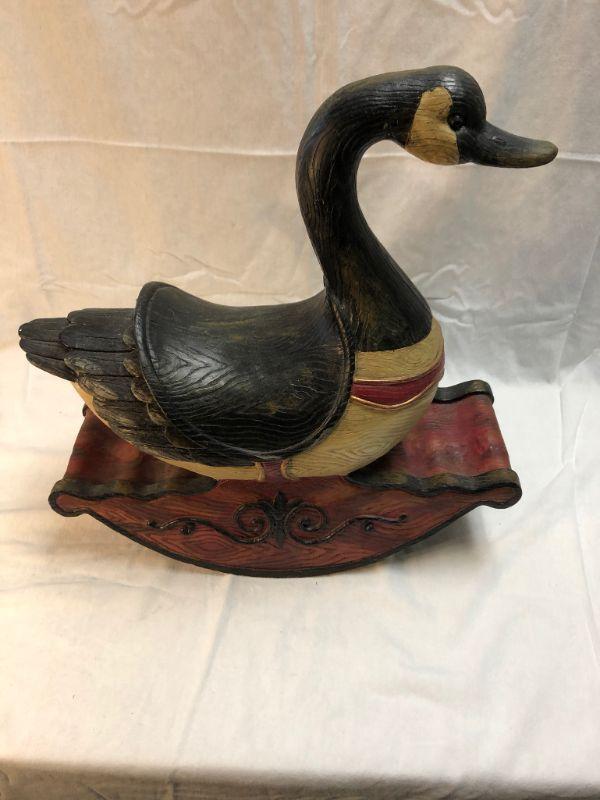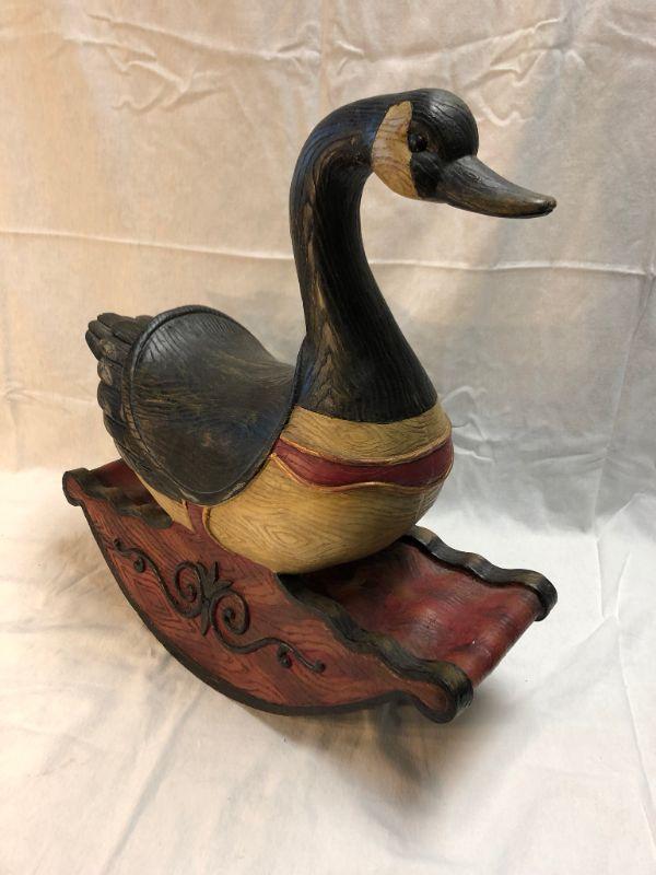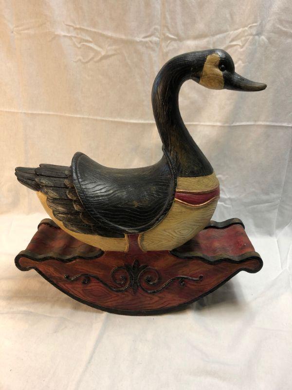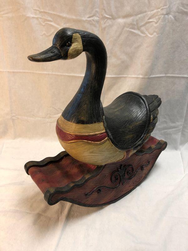 Whimsical folk art inspired rocking goose. Resin/Plastic made to look like stained wood. For decor or maybe a doll, would not recommend for children. Good condition.