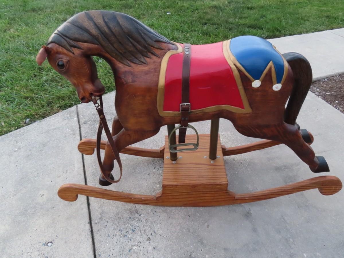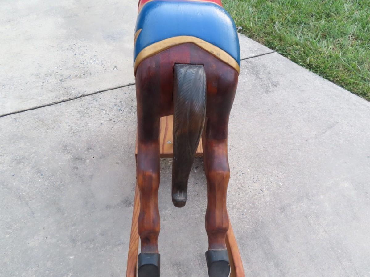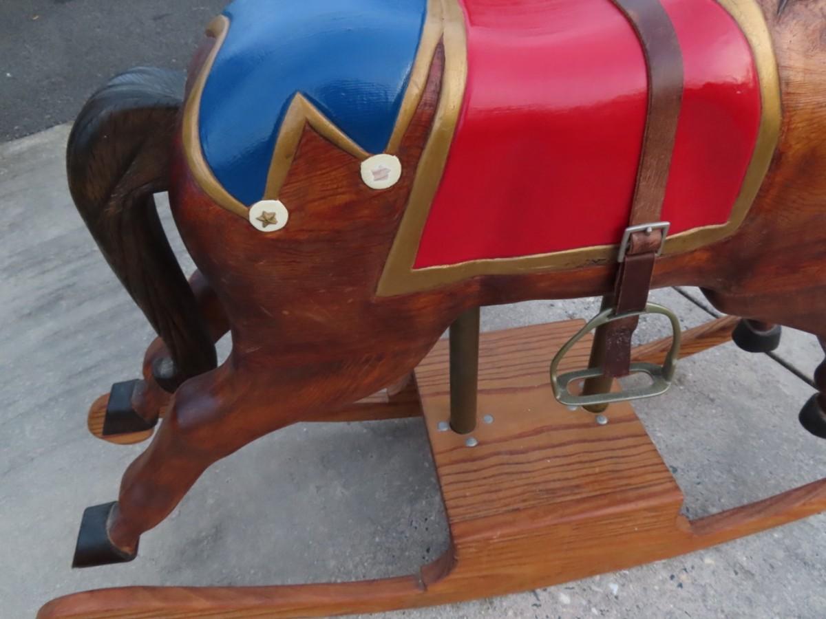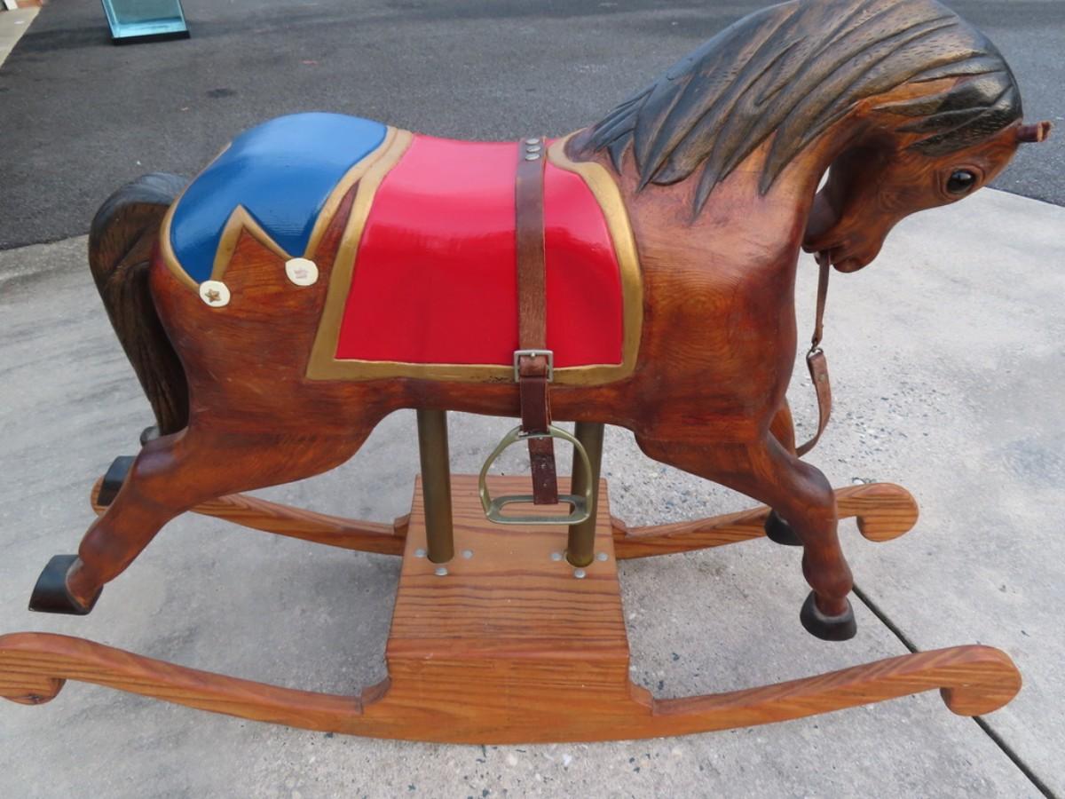 Beautiful handcrafted wooden rocking horse in excellent condition. This unique piece features detailed carving, a painted saddle with vibrant red, blue, and gold accents, and sturdy wooden rockers. Ideal for a nursery, playroom, or as a decorative piece, this rocking horse is both charming and functional. Perfect for children or collectors of vintage toys. Sturdy construction ensures long-lasting use. A timeless and classic addition to any home.