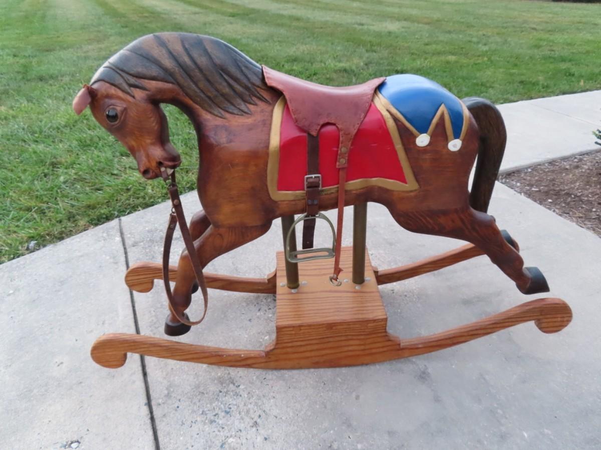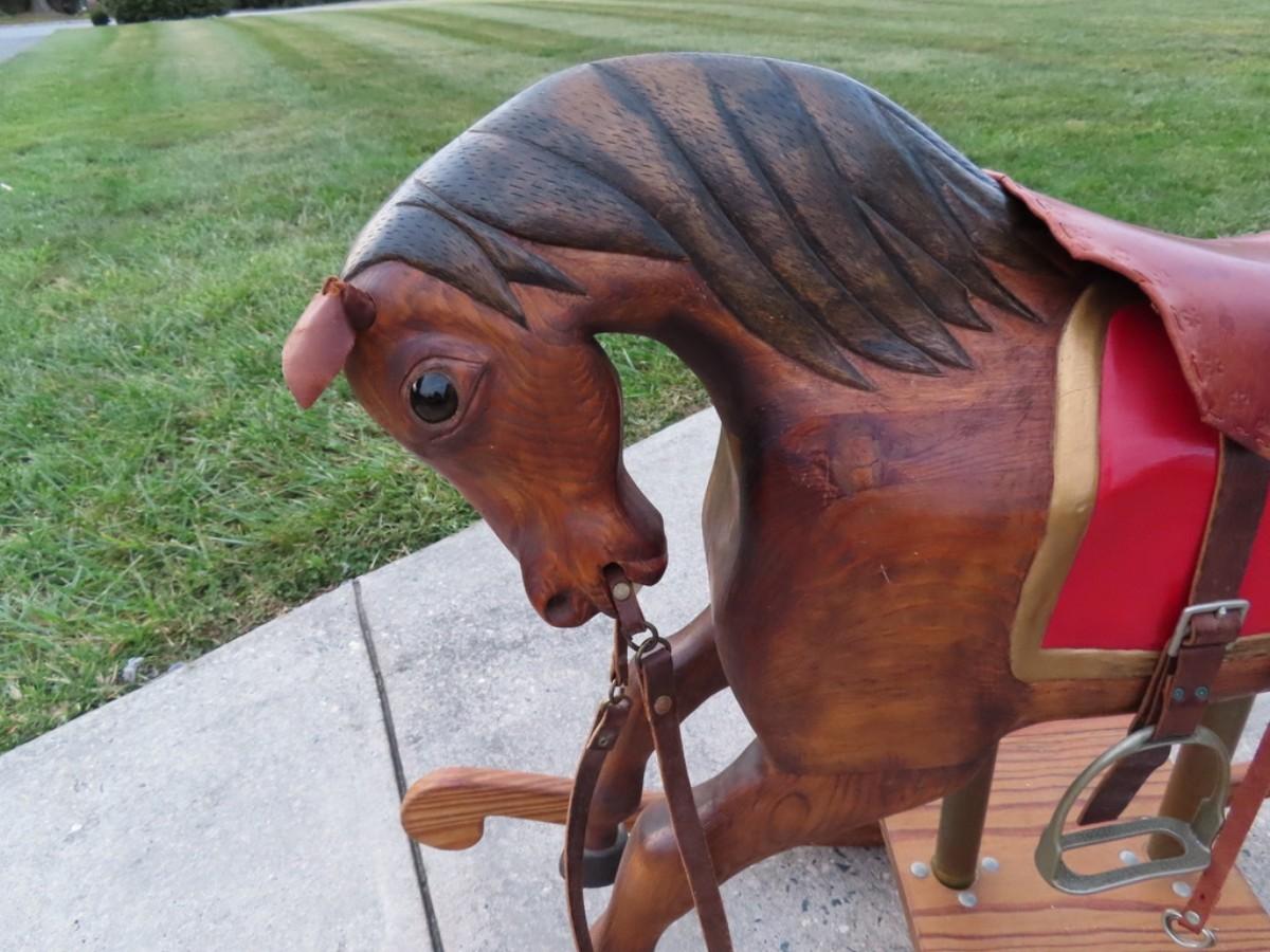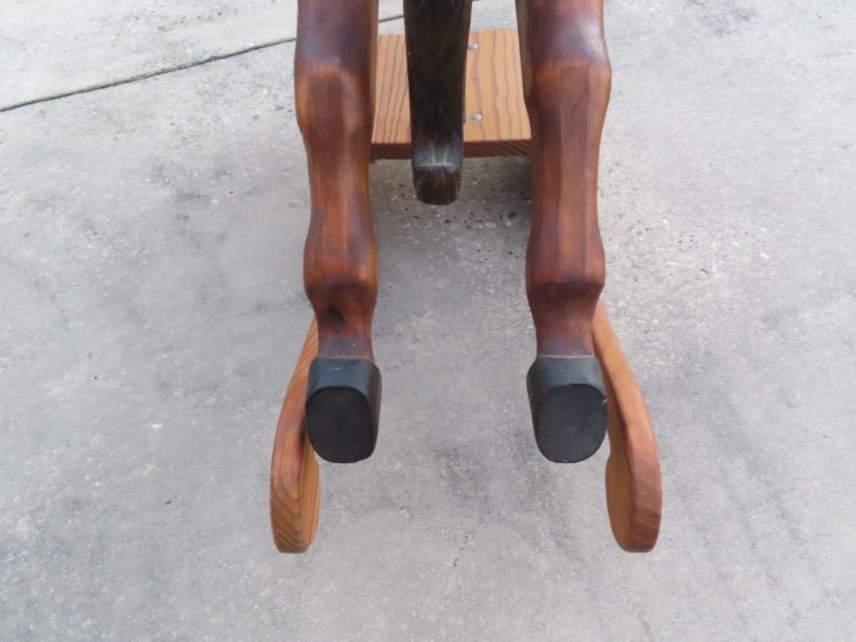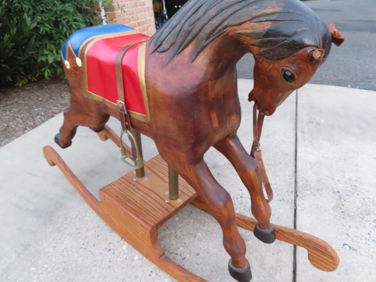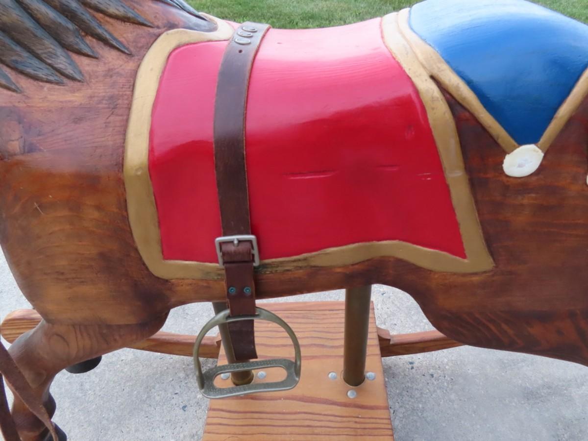 Beautiful handcrafted wooden rocking horse in excellent condition. This unique piece features detailed carving, a painted saddle with vibrant red, blue, and gold accents, and sturdy wooden rockers. Ideal for a nursery, playroom, or as a decorative piece, this rocking horse is both charming and functional. Perfect for children or collectors of vintage toys. Sturdy construction ensures long-lasting use. A timeless and classic addition to any home.