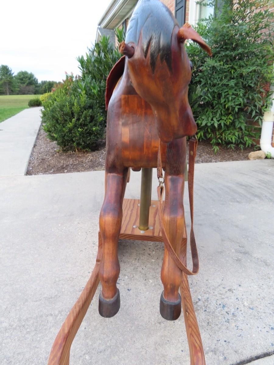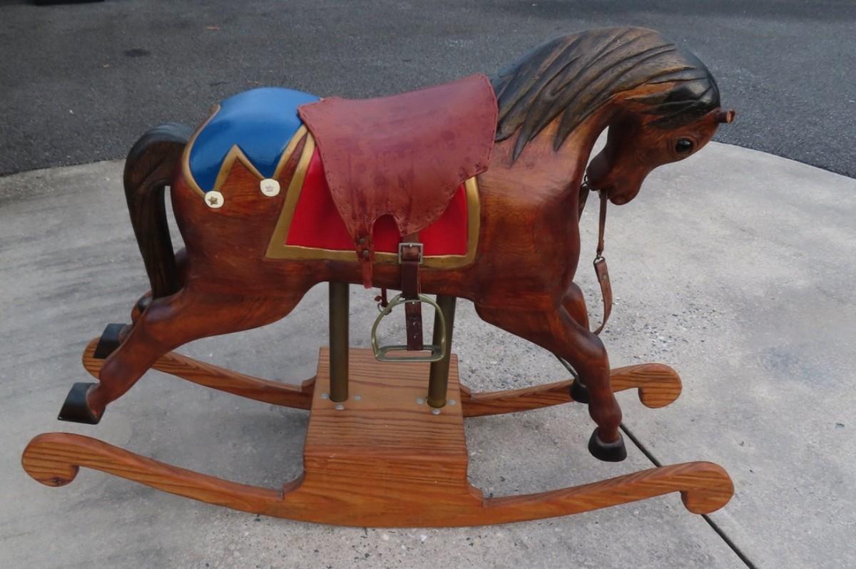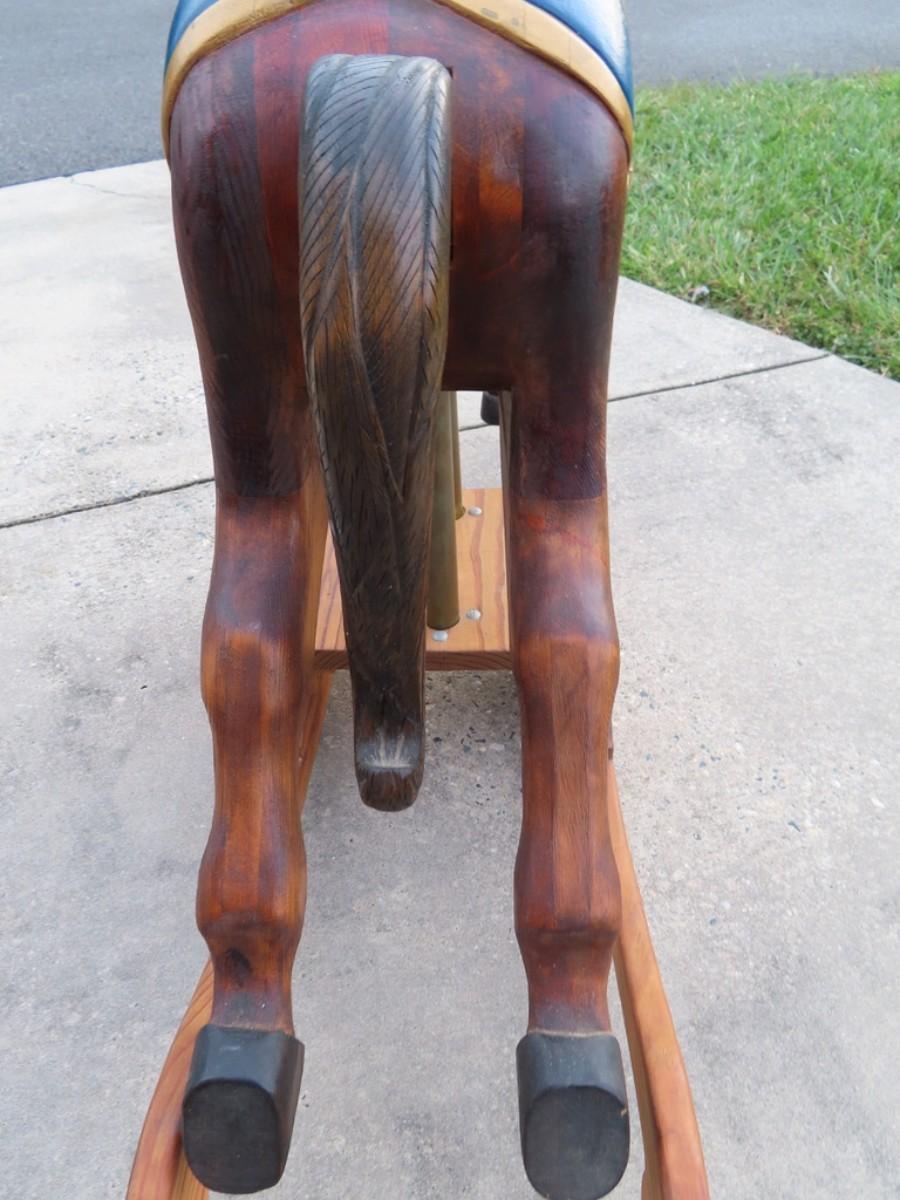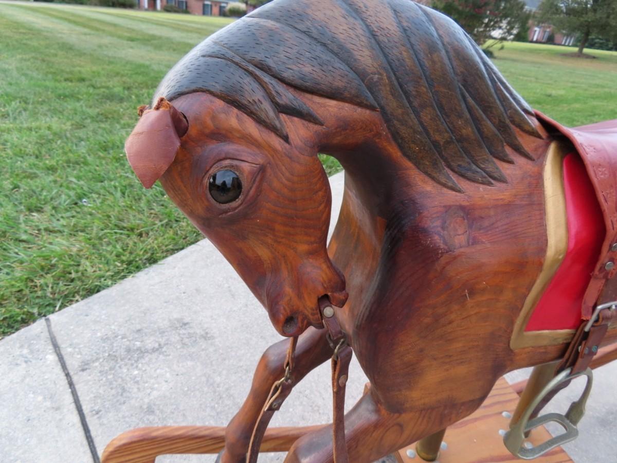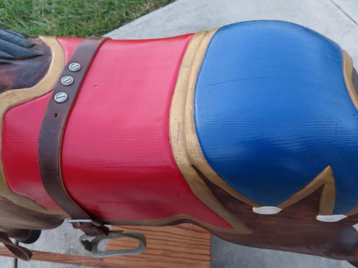 Beautiful handcrafted wooden rocking horse in excellent condition. This unique piece features detailed carving, a painted saddle with vibrant red, blue, and gold accents, and sturdy wooden rockers. Ideal for a nursery, playroom, or as a decorative piece, this rocking horse is both charming and functional. Perfect for children or collectors of vintage toys. Sturdy construction ensures long-lasting use. A timeless and classic addition to any home.