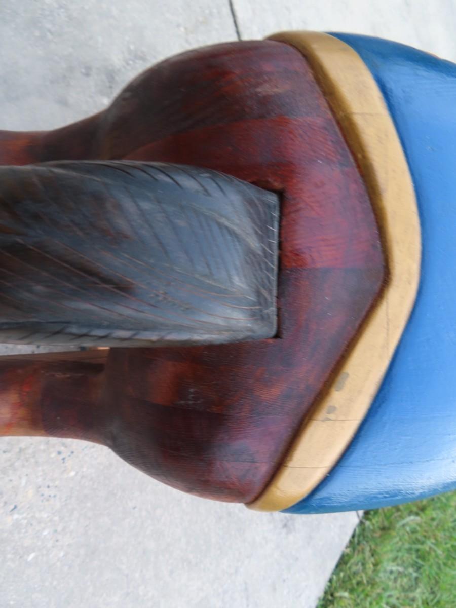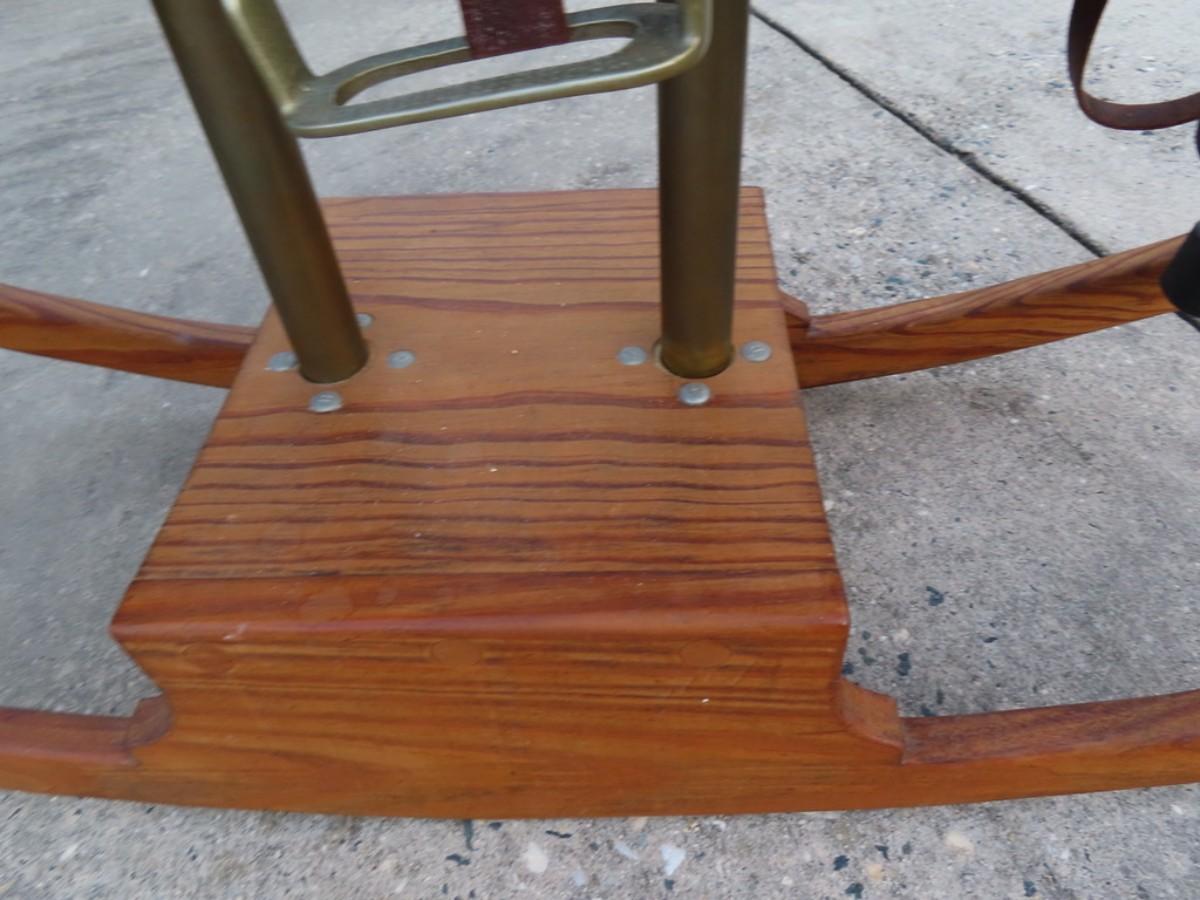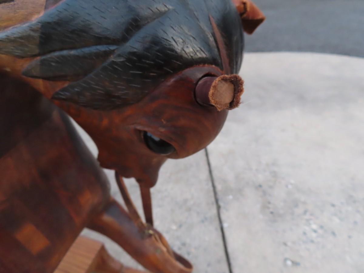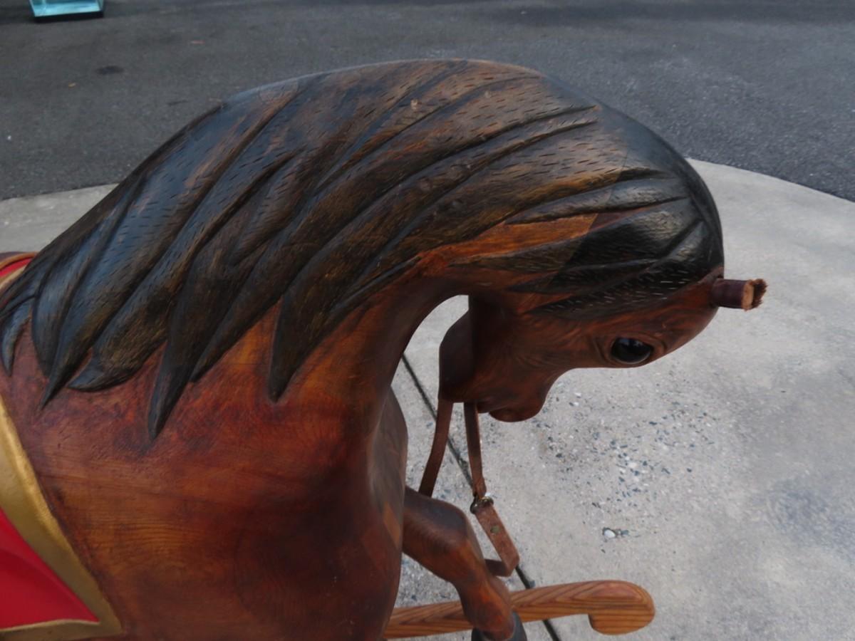 Beautiful handcrafted wooden rocking horse in excellent condition. This unique piece features detailed carving, a painted saddle with vibrant red, blue, and gold accents, and sturdy wooden rockers. Ideal for a nursery, playroom, or as a decorative piece, this rocking horse is both charming and functional. Perfect for children or collectors of vintage toys. Sturdy construction ensures long-lasting use. A timeless and classic addition to any home.