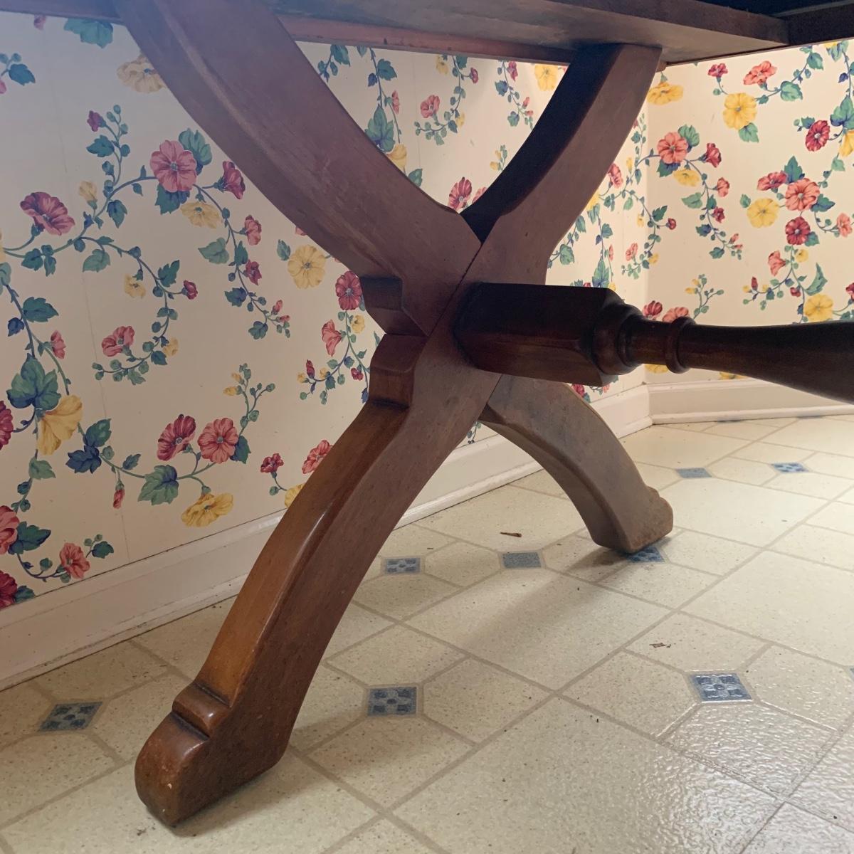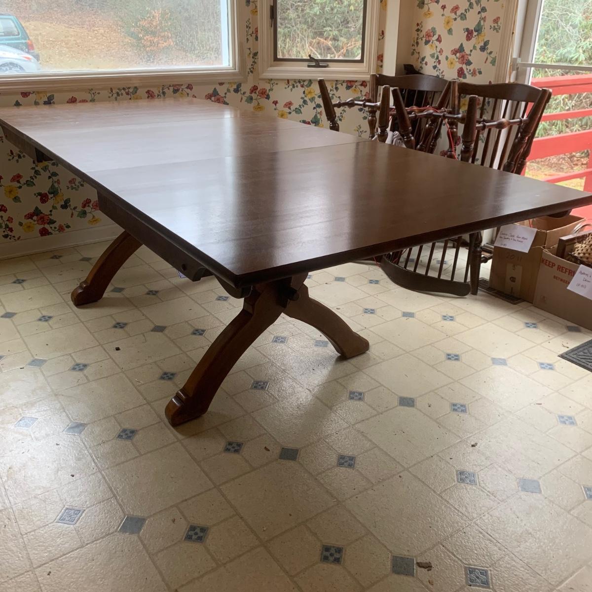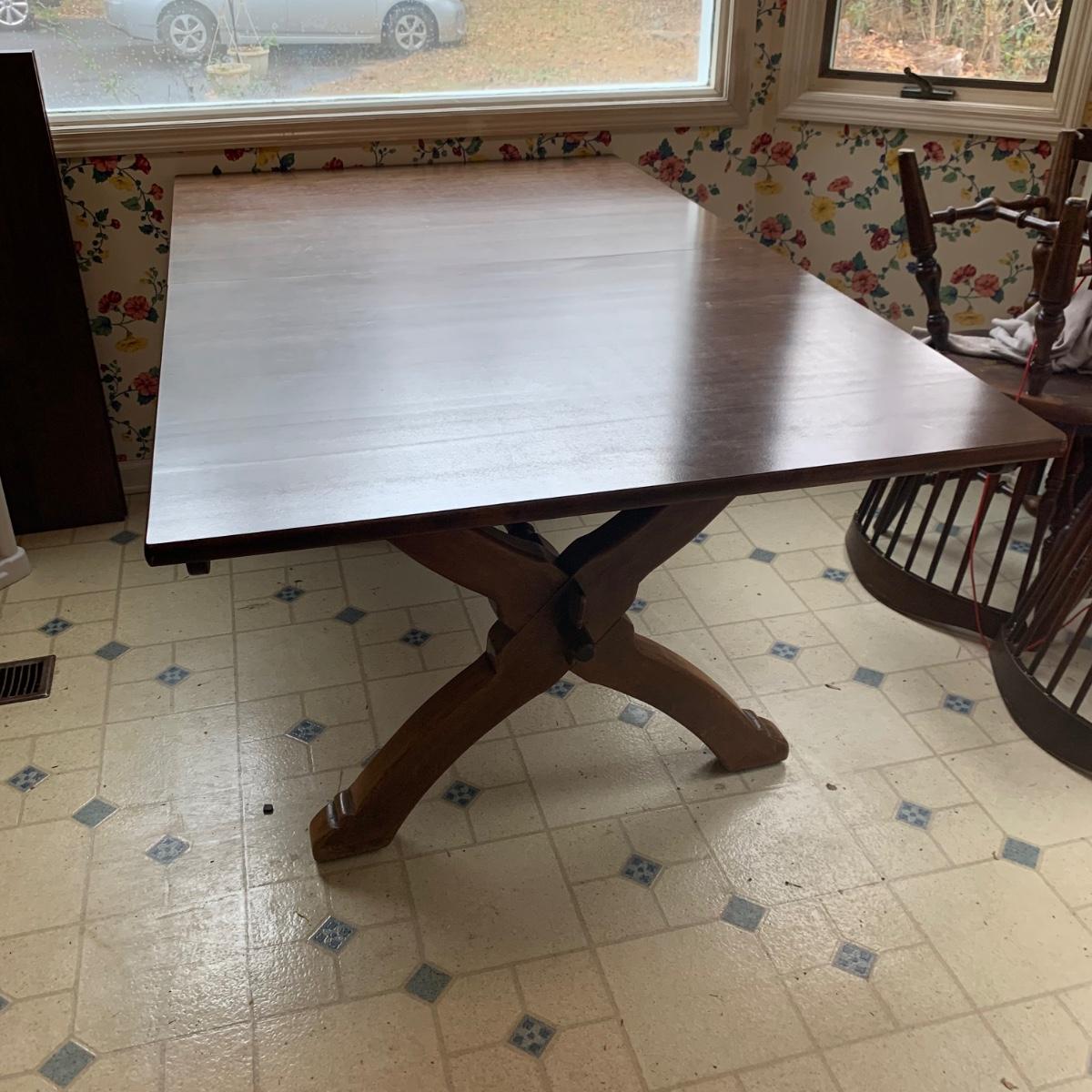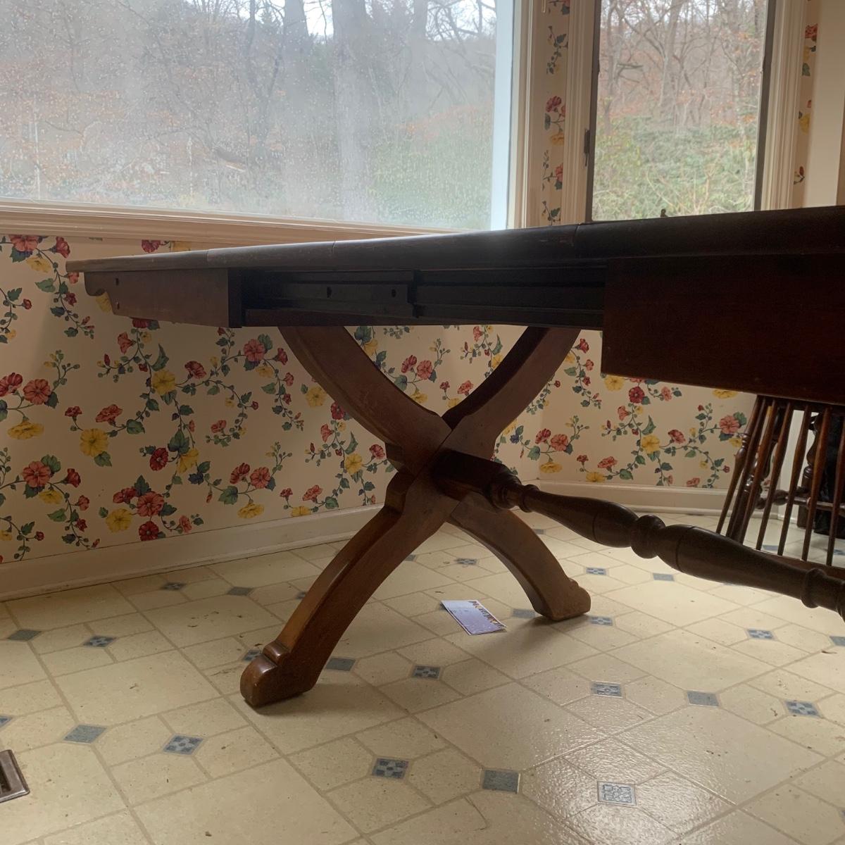 Nice and sturdy solid wood farmhouse style dining table with cross legs by Rockingham. Table has two leafs that each add 14” in length to the table. Without leafs in, the table measures 66”L x 40”W x 29.5H. With the two leaves added the length increases to 94”. The table is in good condition. There is no notable damage, just some wear apparent on the legs.