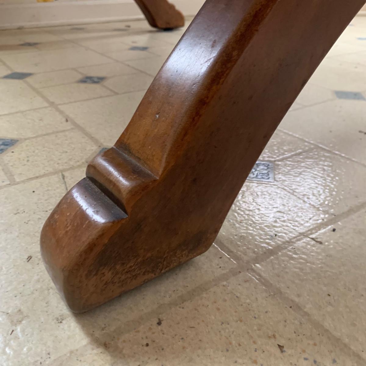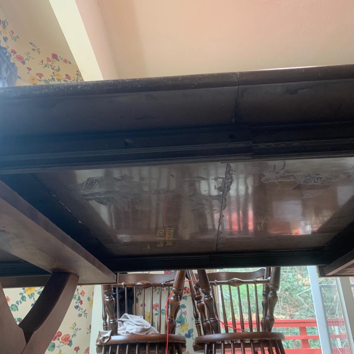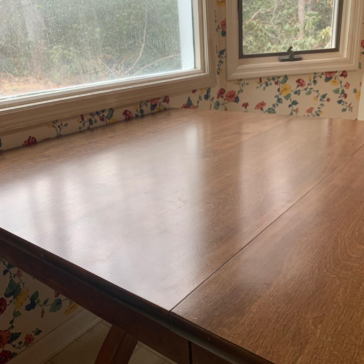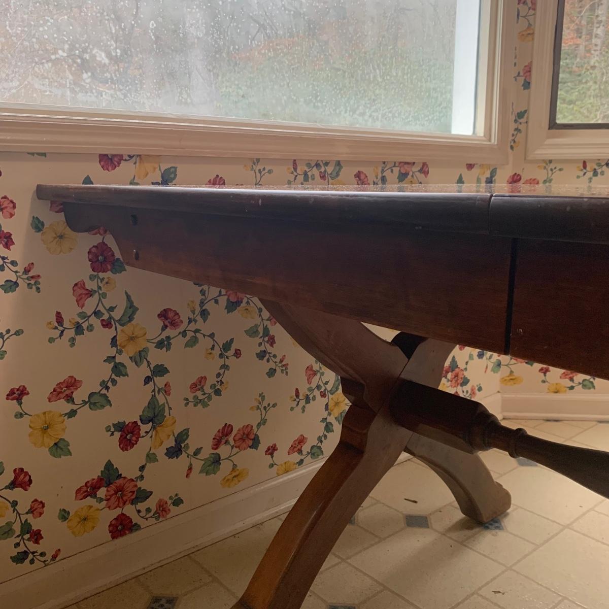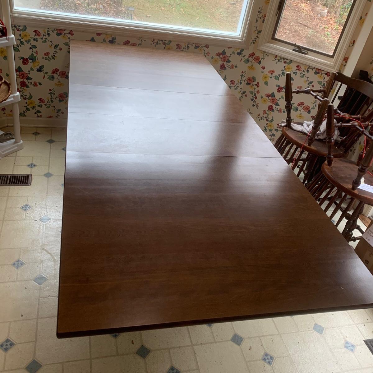 Nice and sturdy solid wood farmhouse style dining table with cross legs by Rockingham. Table has two leafs that each add 14” in length to the table. Without leafs in, the table measures 66”L x 40”W x 29.5H. With the two leaves added the length increases to 94”. The table is in good condition. There is no notable damage, just some wear apparent on the legs.