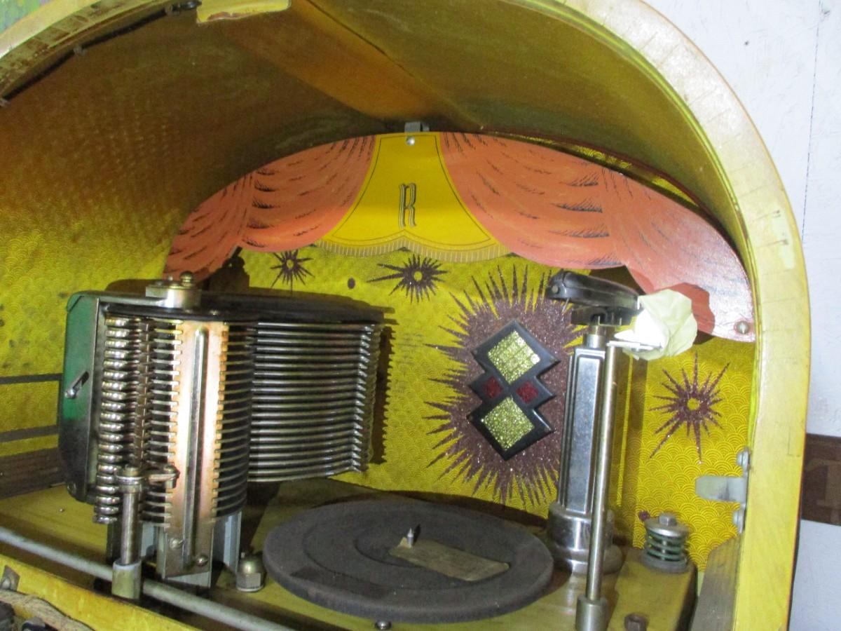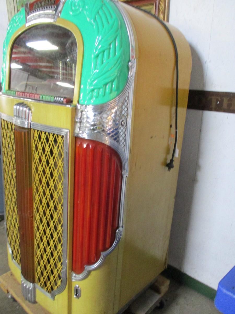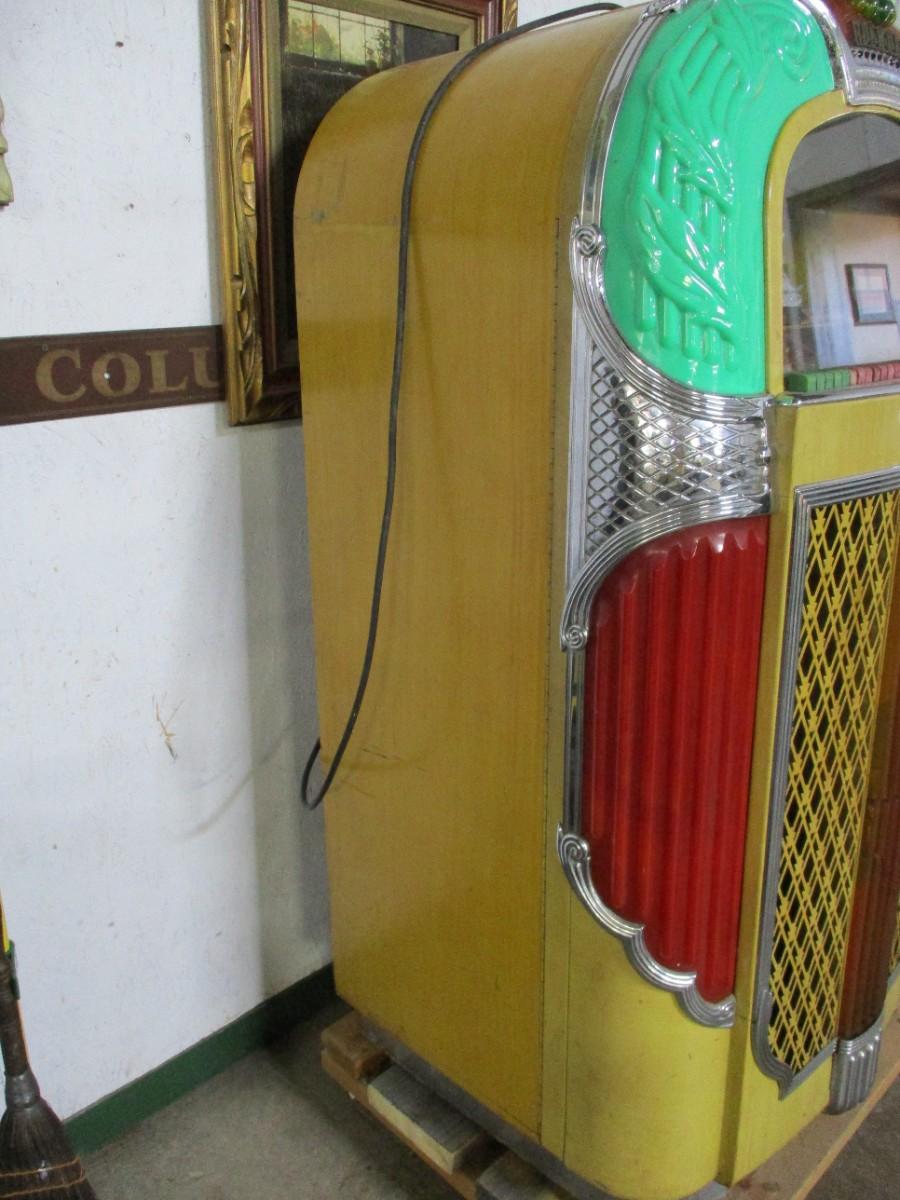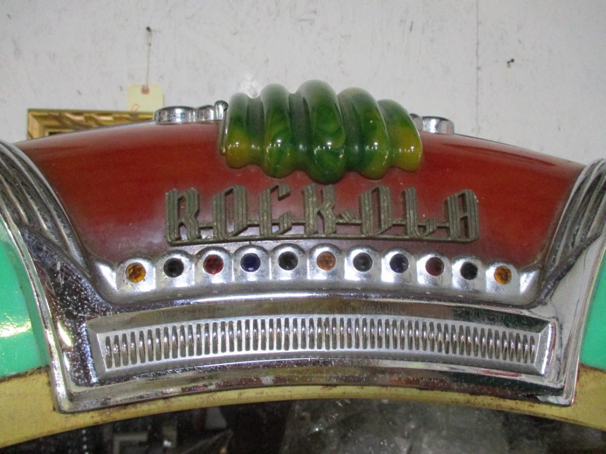 Rockola Jukebox plugs in and lights up. Will need solenoid work and some cosmetic restoration. Aesthetically appealing with nice color and design.