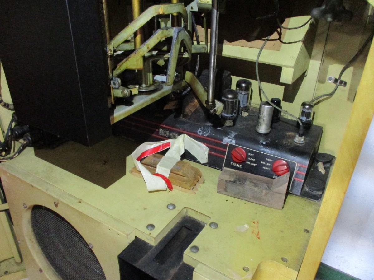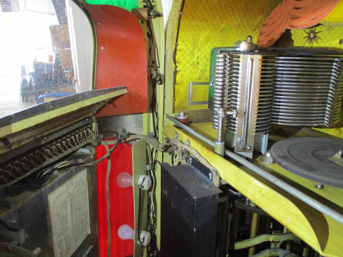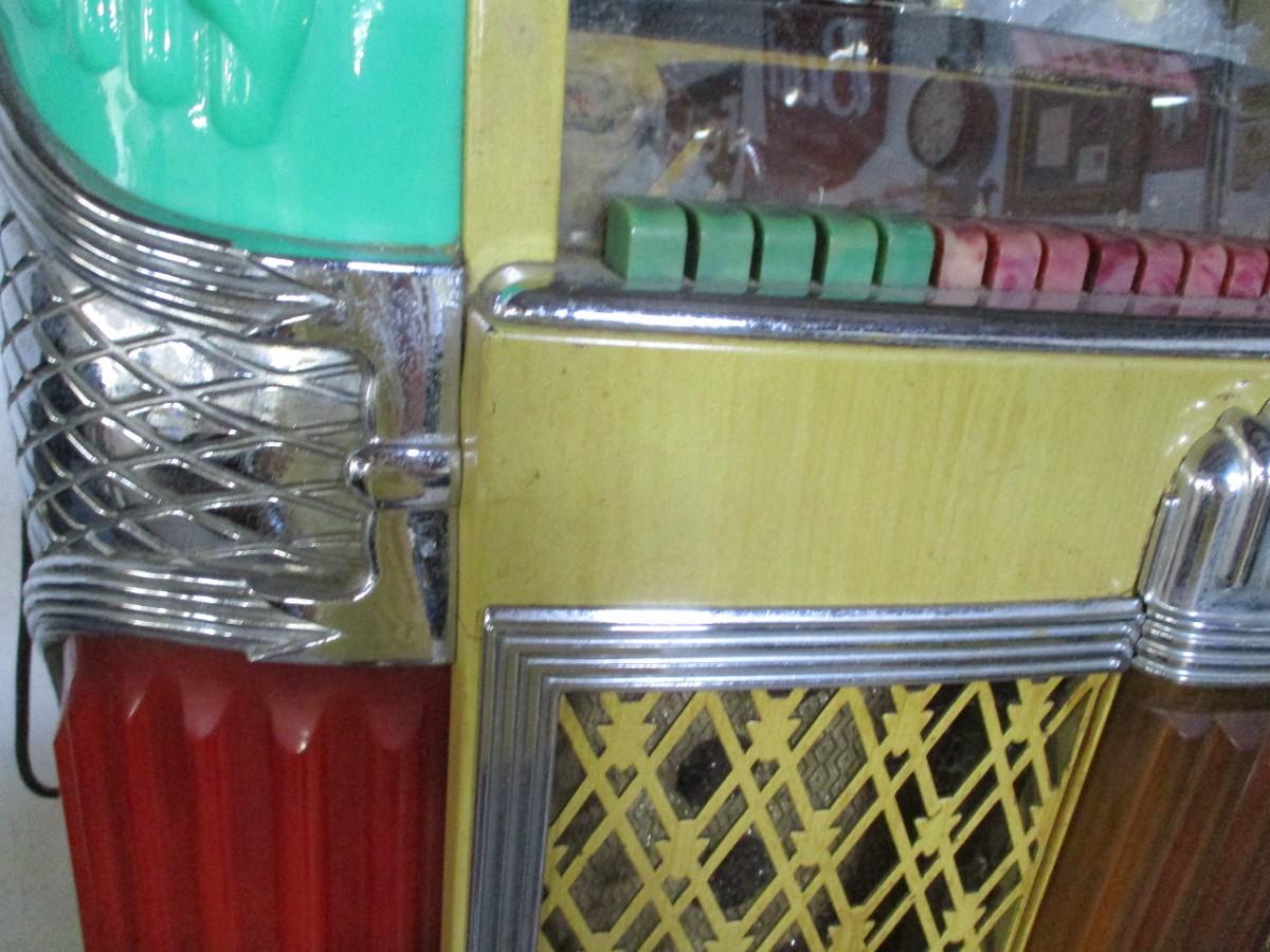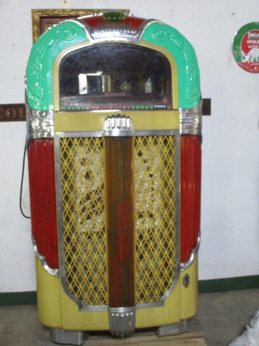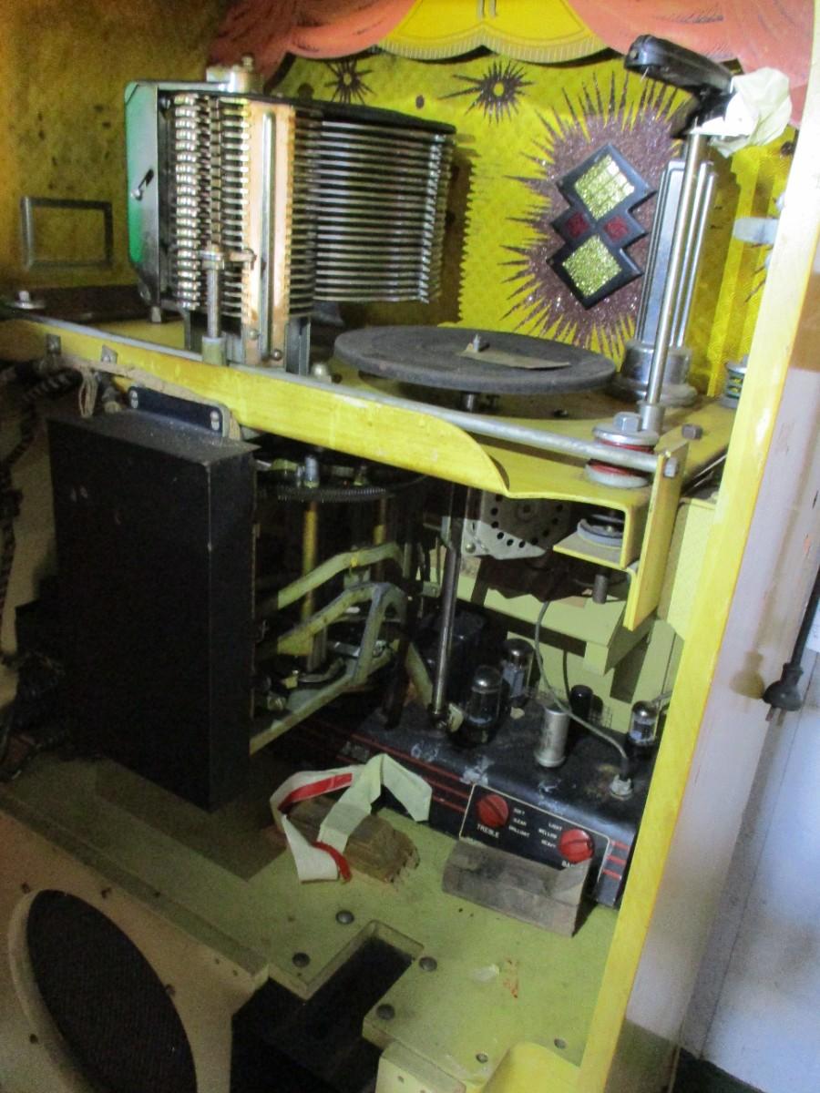 Rockola Jukebox plugs in and lights up. Will need solenoid work and some cosmetic restoration. Aesthetically appealing with nice color and design.