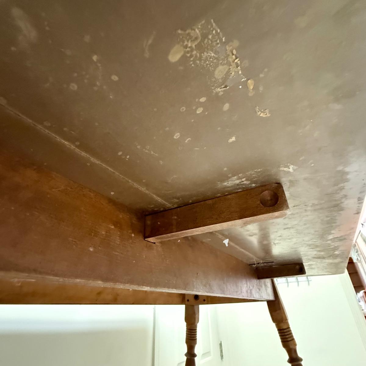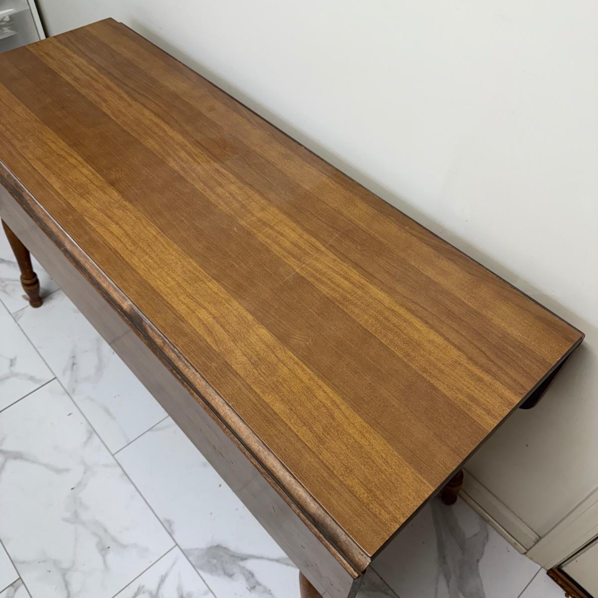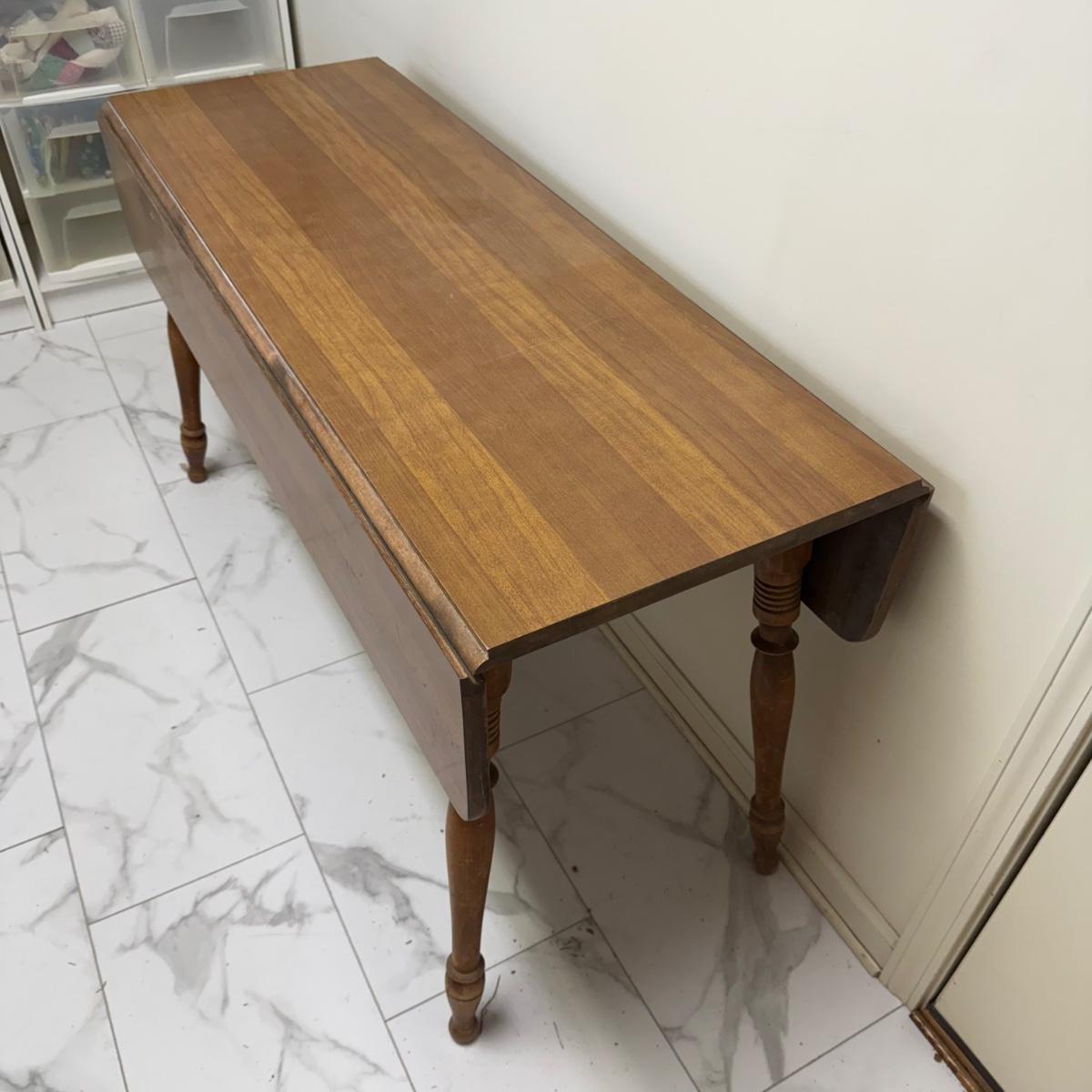 Wooden drop leaf table labeled “Rockport”. With leafs down it is 20” x 52” x 29.5”H. Leafs up makes the tabletop 36” x 52”. Tabletop has some discoloration and a handful of scratches and other blemishes.