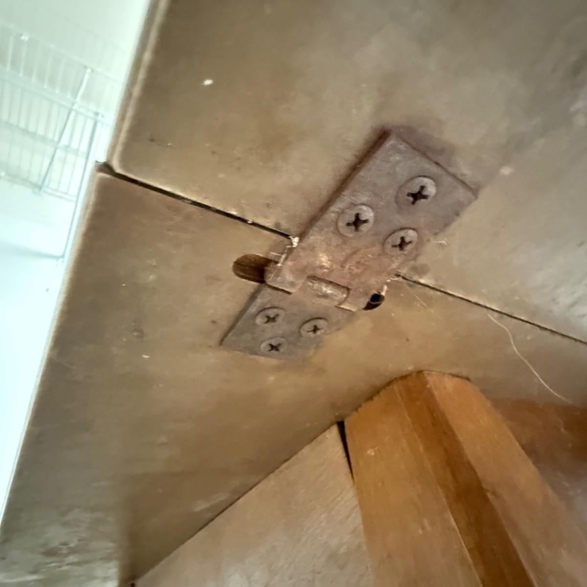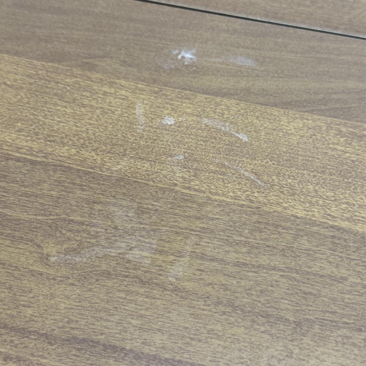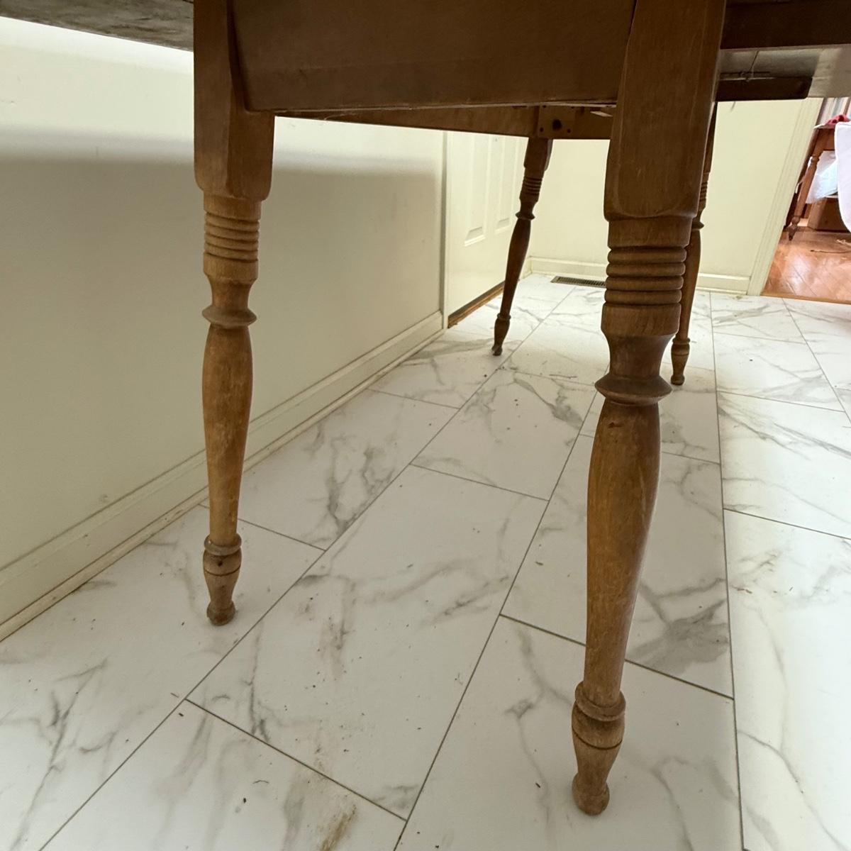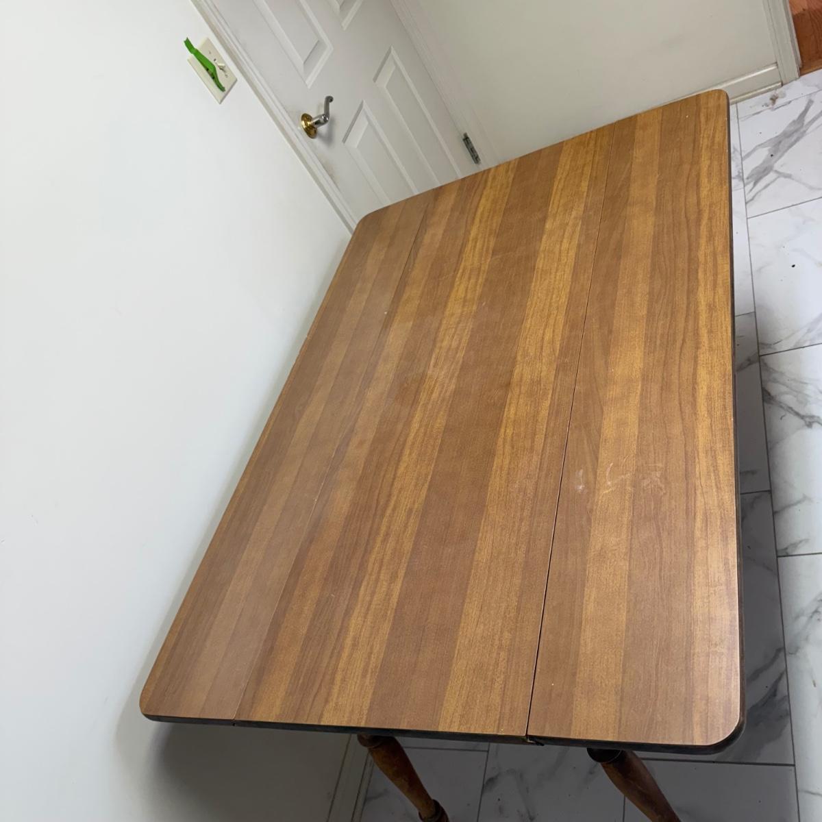 Wooden drop leaf table labeled “Rockport”. With leafs down it is 20” x 52” x 29.5”H. Leafs up makes the tabletop 36” x 52”. Tabletop has some discoloration and a handful of scratches and other blemishes.