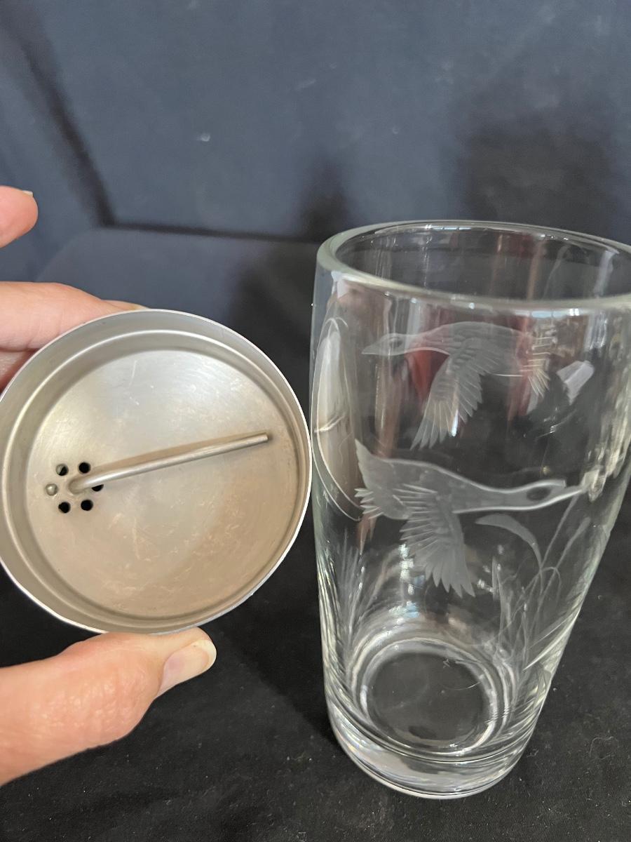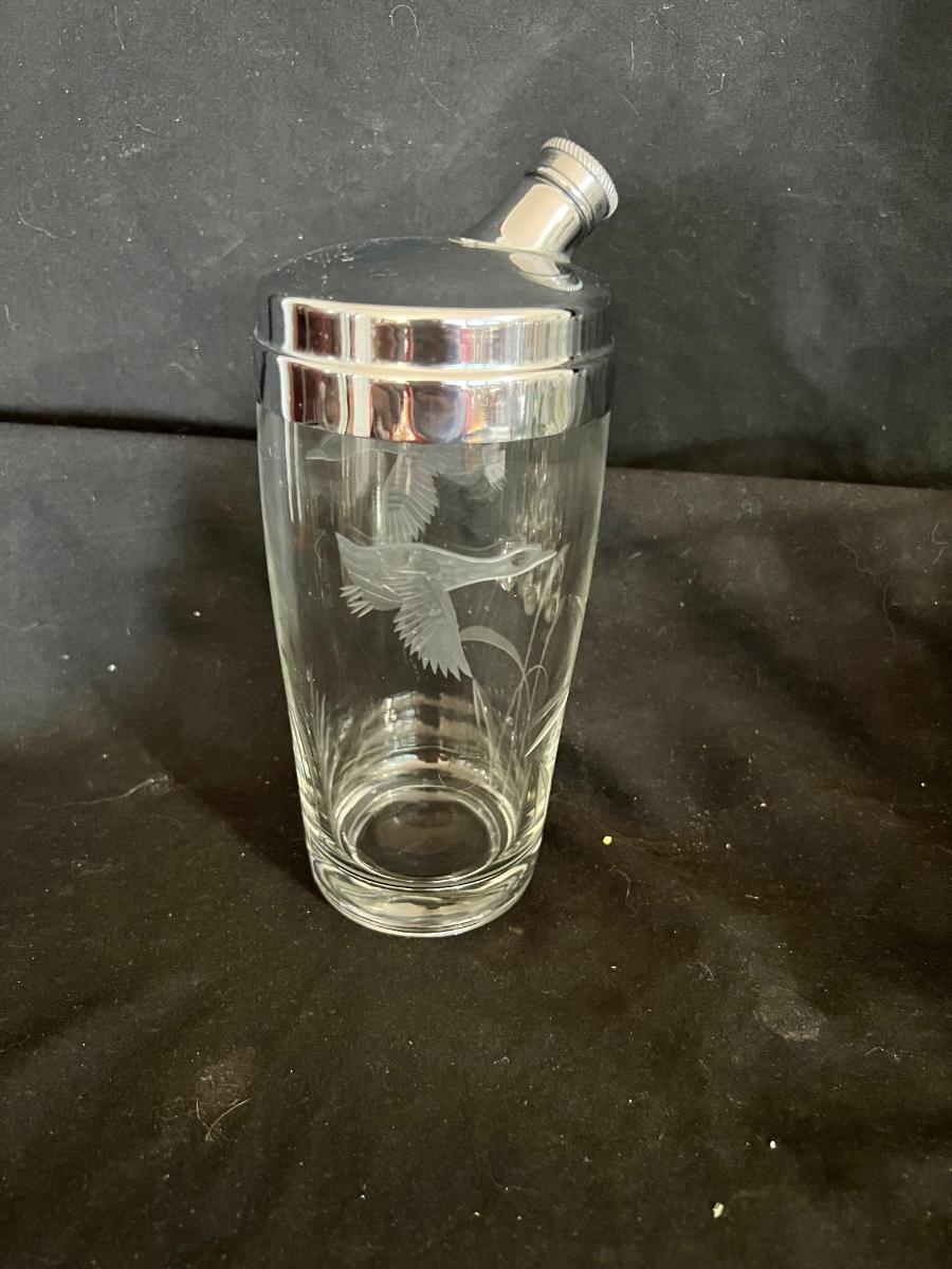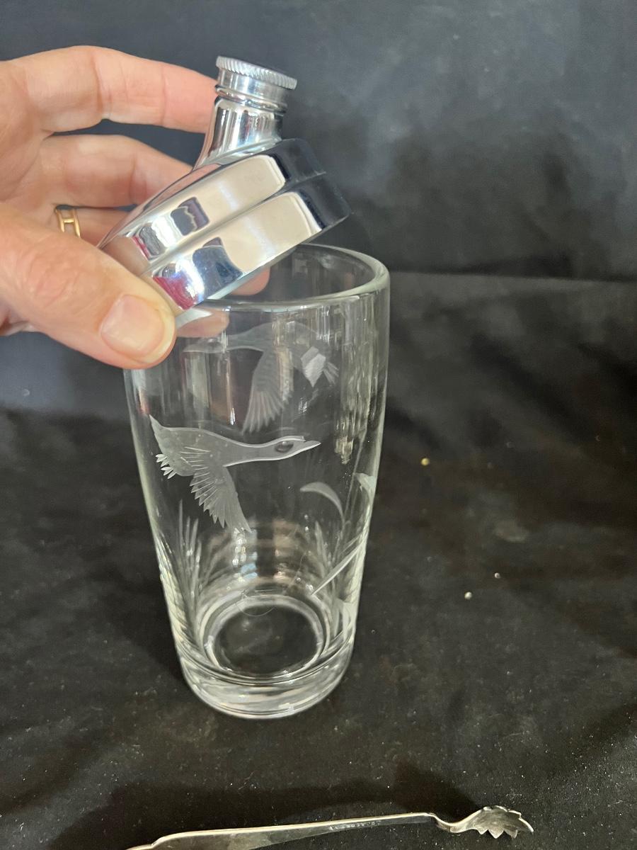 A set of six different bird themed glasses and well as four plain glasses. The set of four drinking glasses is etched. They each measure 2.5”D x 5.5”H. The shaker is etched with geese and measures 3”D x 6”H and the ice tongs are 5” long. Shipping available.