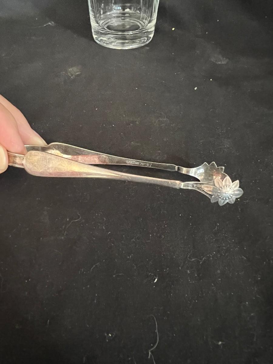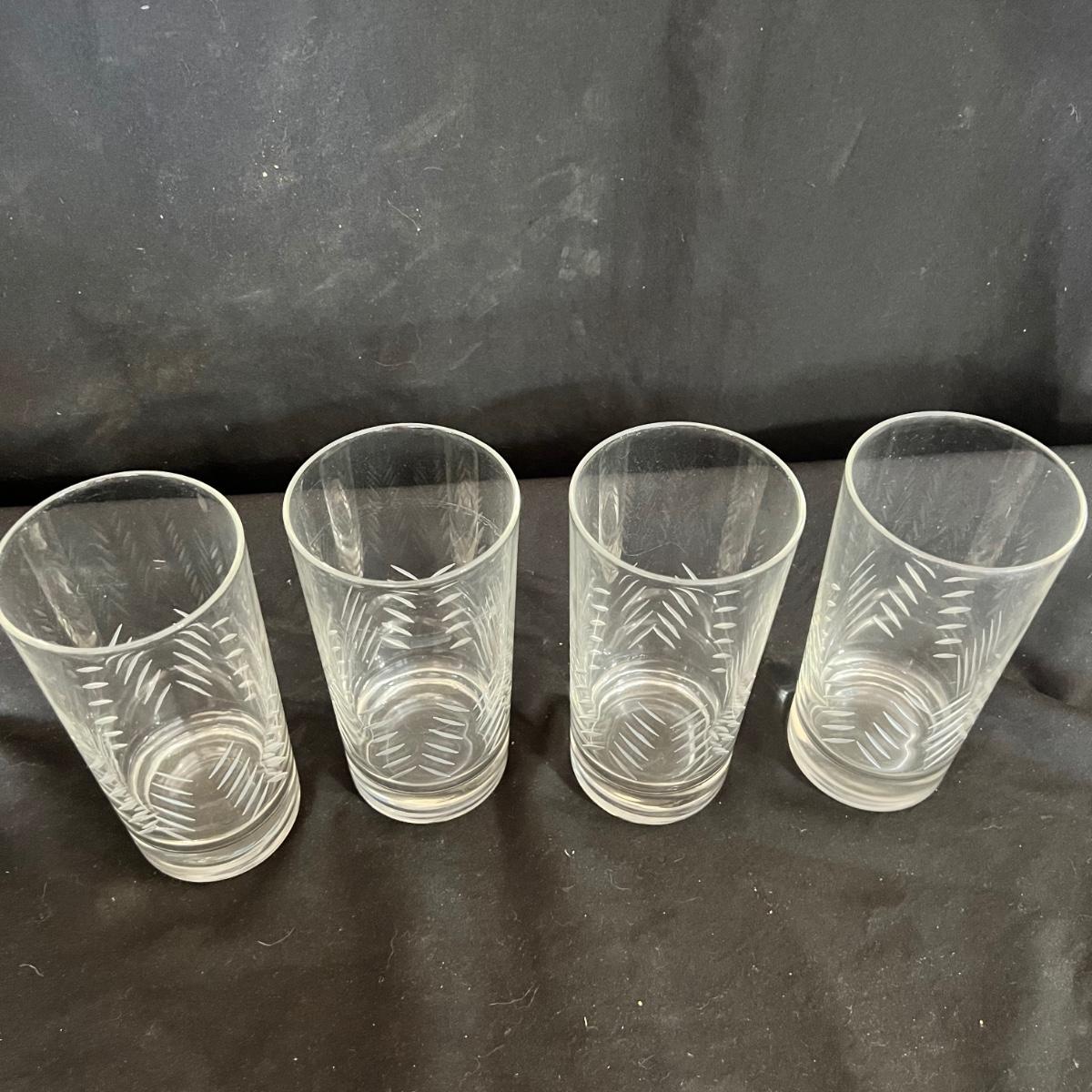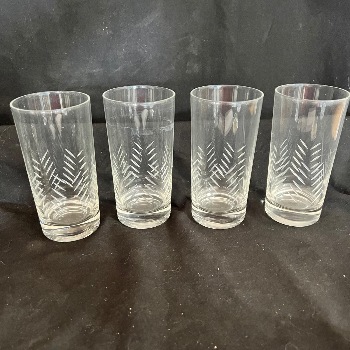 A set of six different bird themed glasses and well as four plain glasses. The set of four drinking glasses is etched. They each measure 2.5”D x 5.5”H. The shaker is etched with geese and measures 3”D x 6”H and the ice tongs are 5” long. Shipping available.