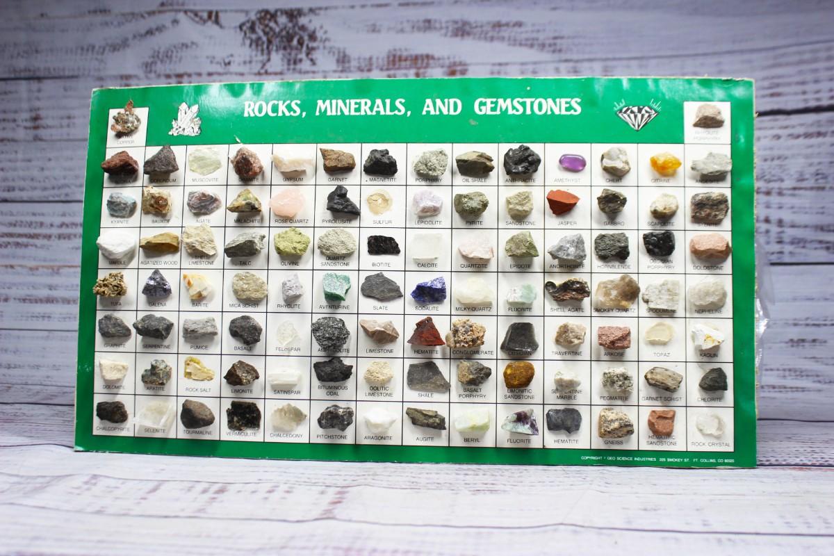 Rocks, Minerals, and Gemstones Identification Chart with Sample Pieces