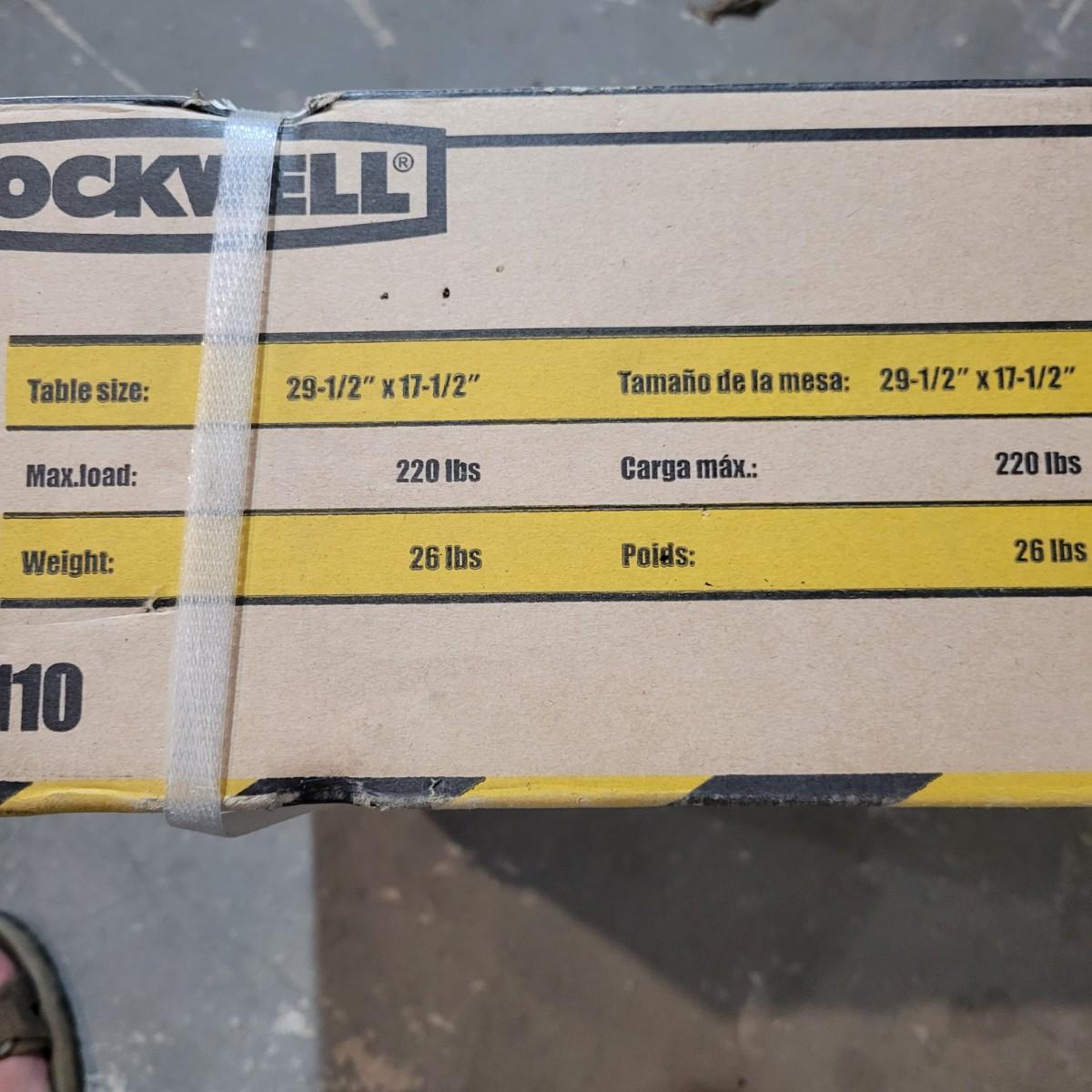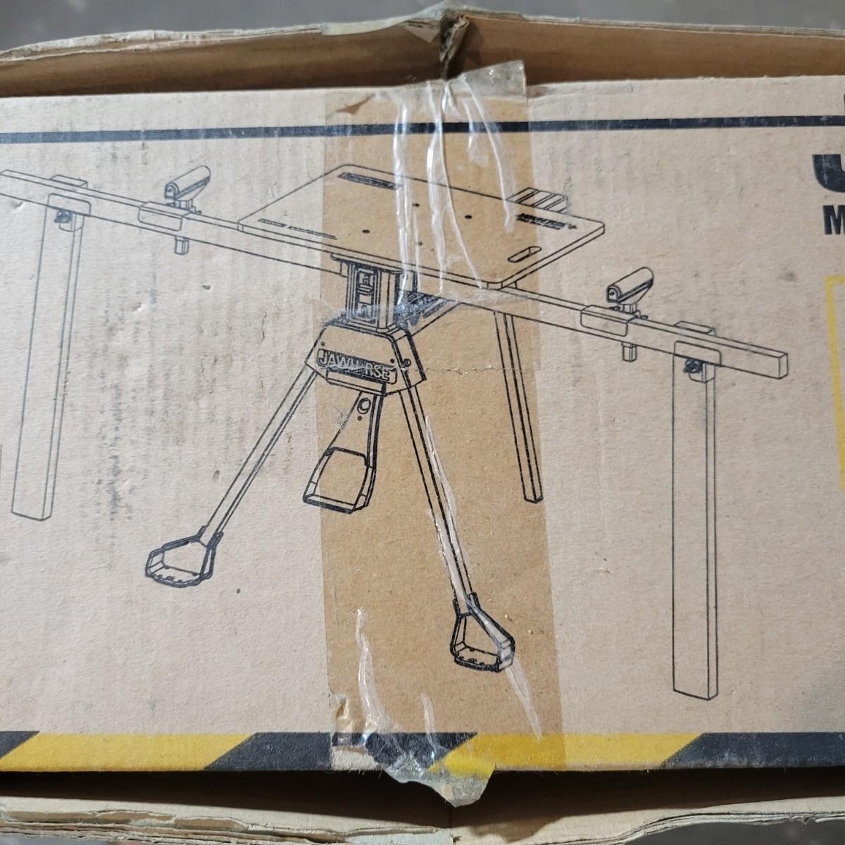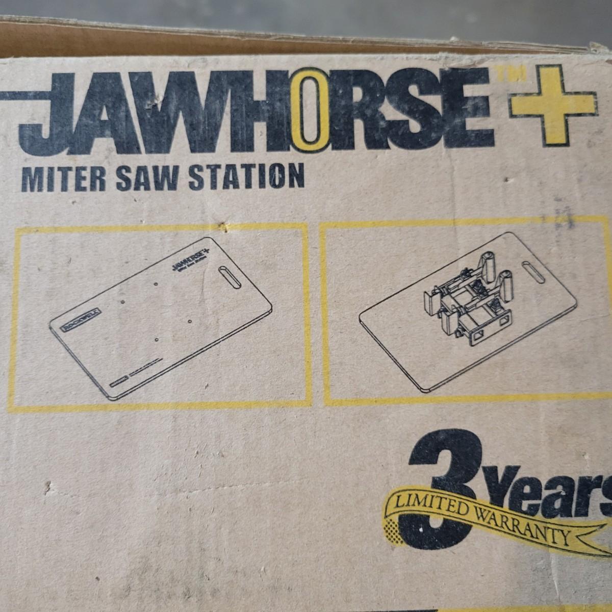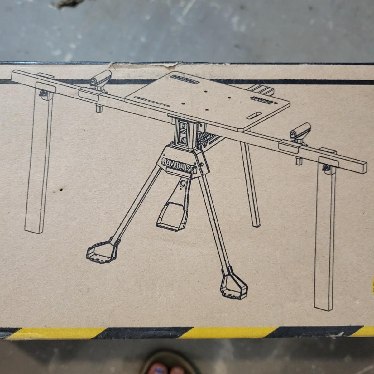 A Rockwell Jawhorse mitre saw station new, in its original box. A portable table that includes arms with adjustable rollers to hold lumber level for mitre cuts. Model # RK9110. Measures 29.5" x 17.5" and can hold up to 220lbs. Local pickup only
