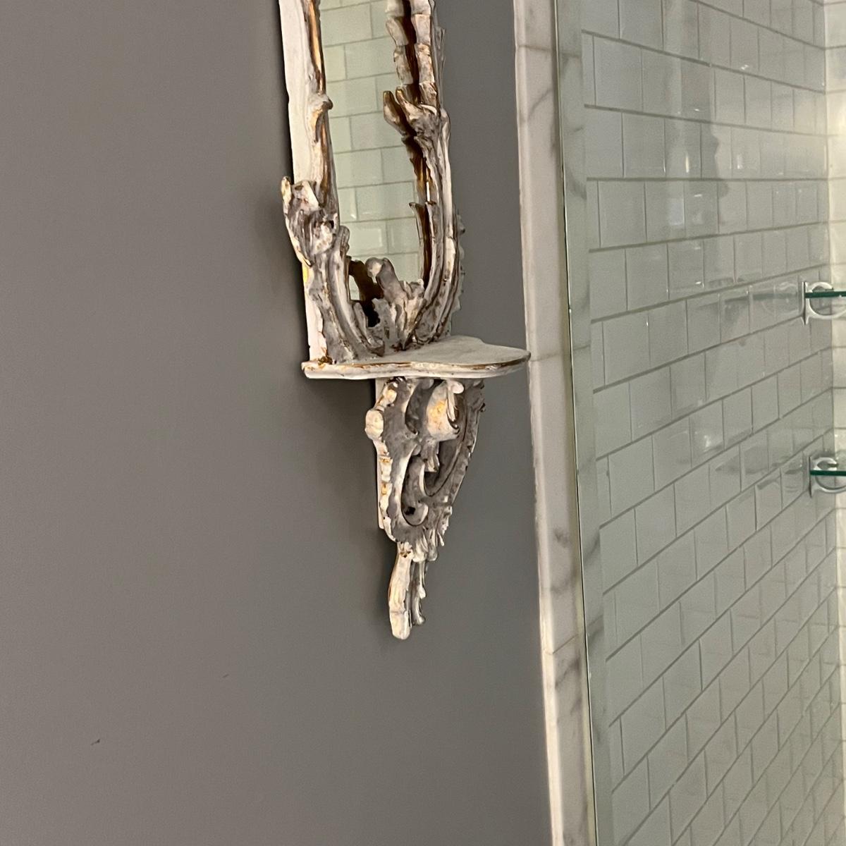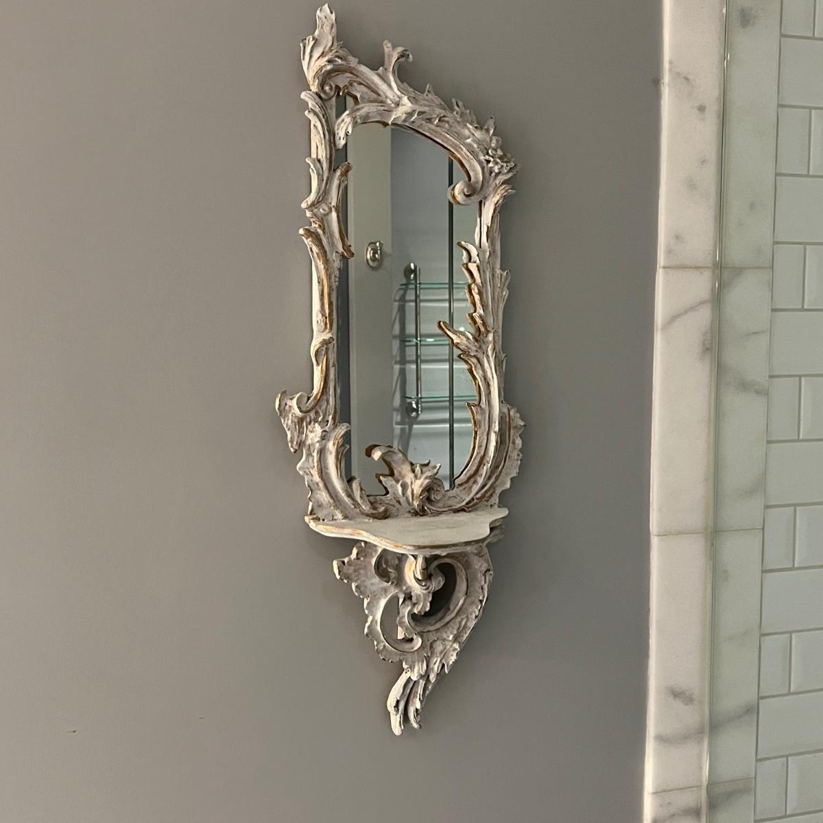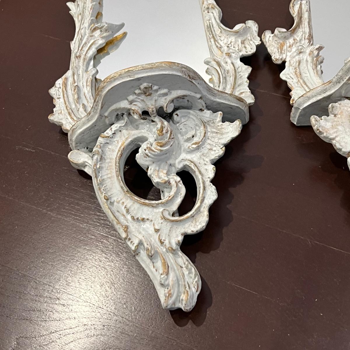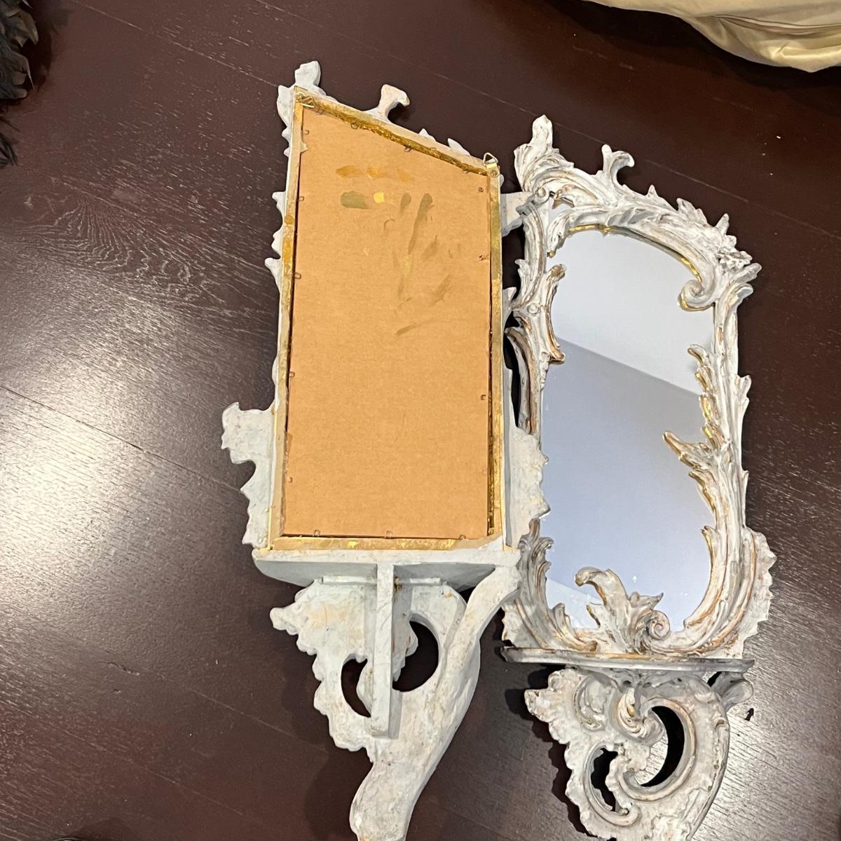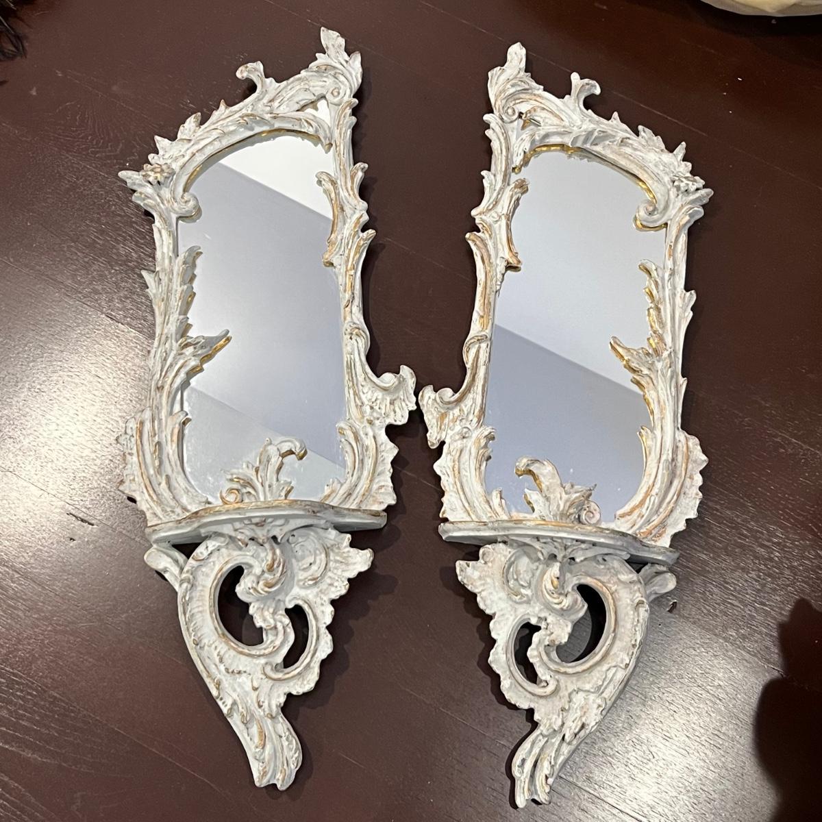 This matching pair of Rococo style mirrors appear to be painted wood and both have built in shelves. Note one shelf has what appears to be a permanent blue mark, but could be repainted. Both are ready to hang with two hooks each.