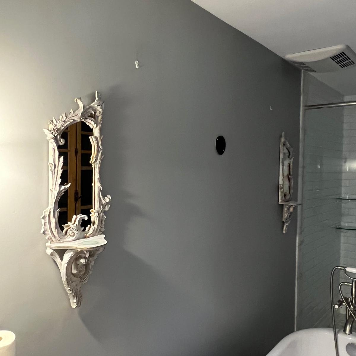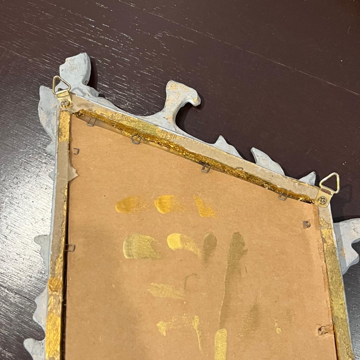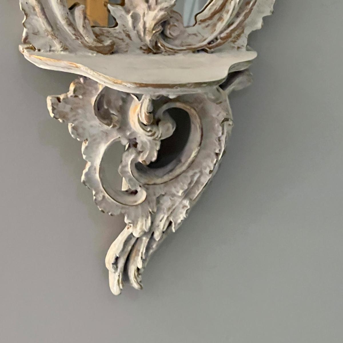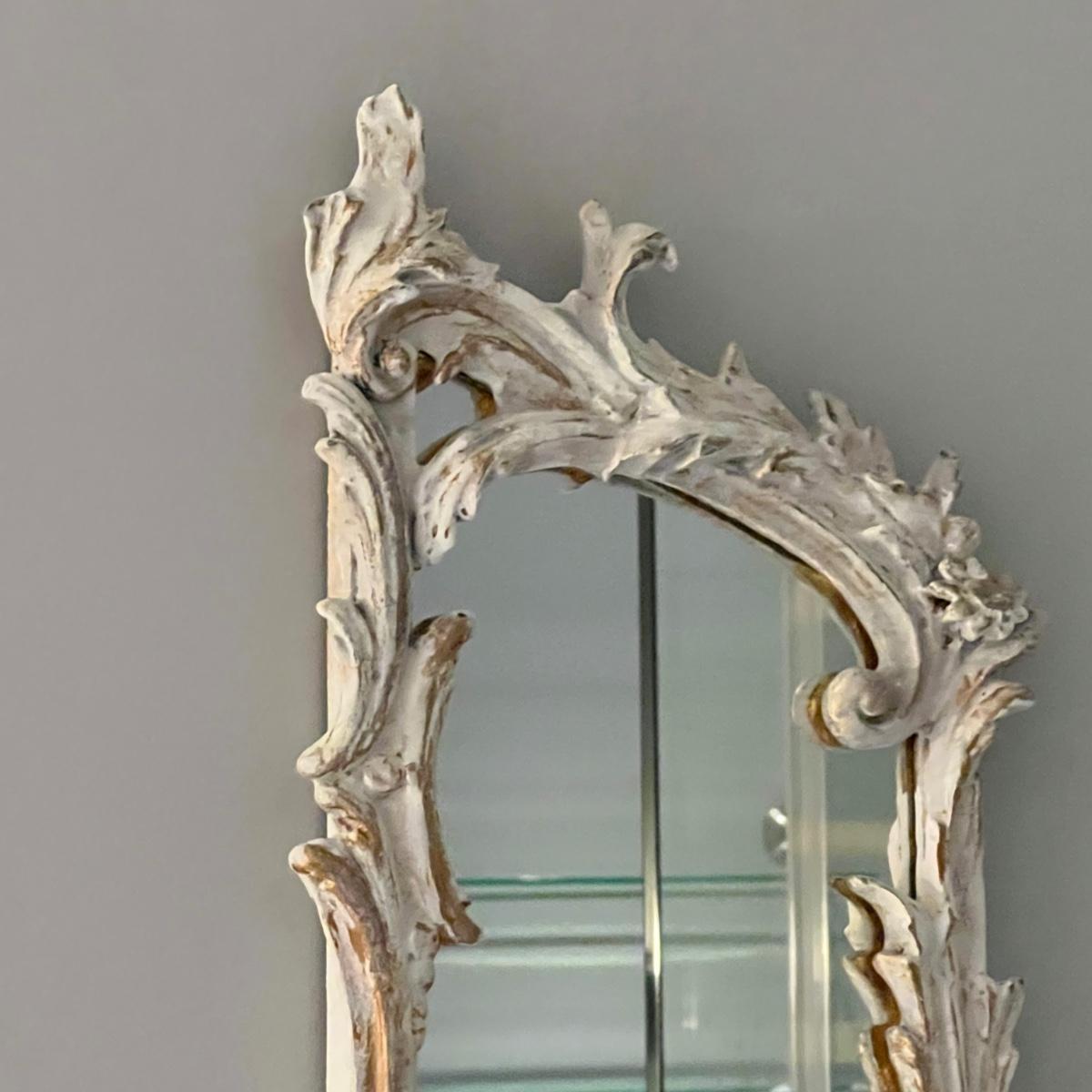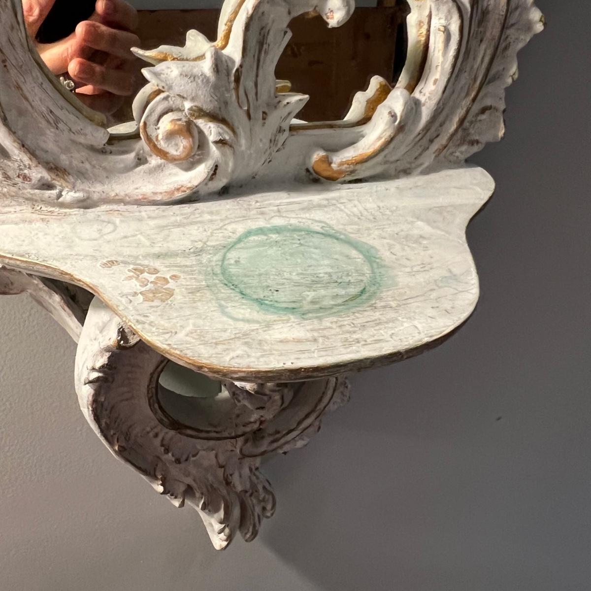 This matching pair of Rococo style mirrors appear to be painted wood and both have built in shelves. Note one shelf has what appears to be a permanent blue mark, but could be repainted. Both are ready to hang with two hooks each.