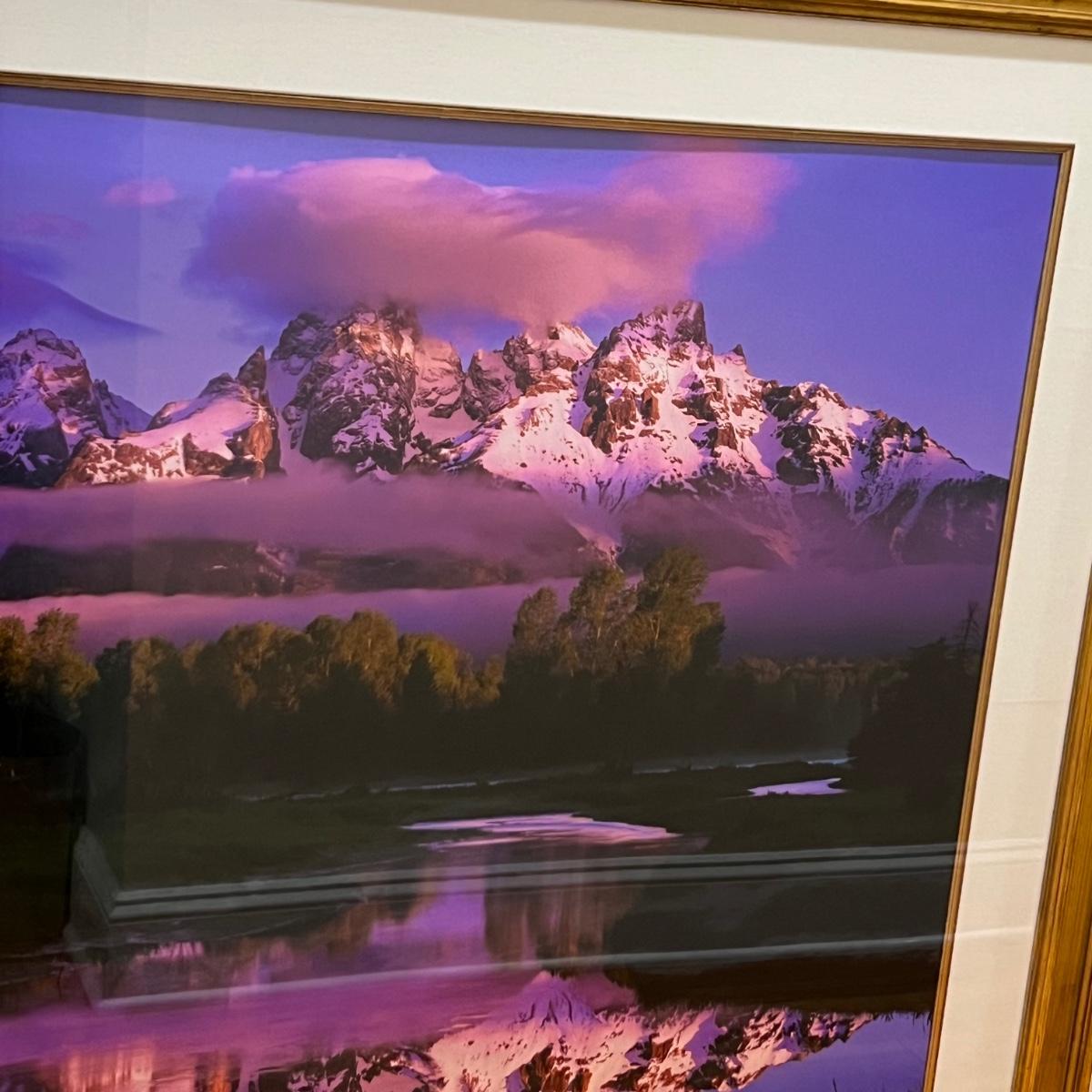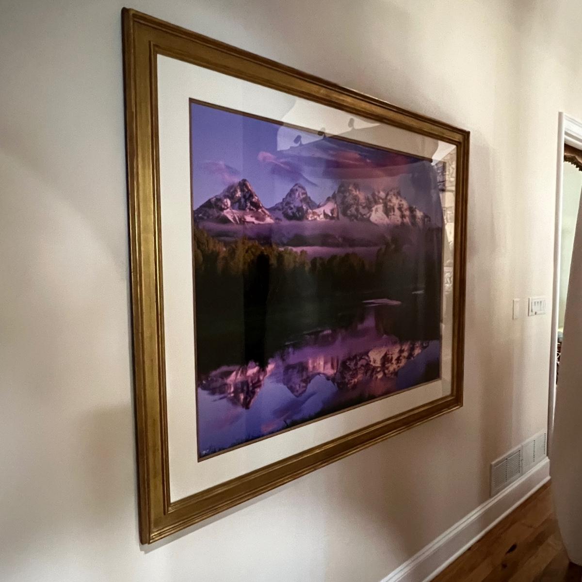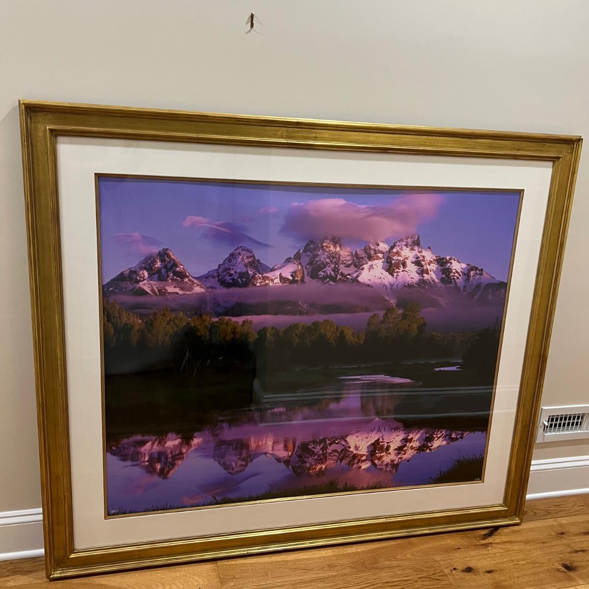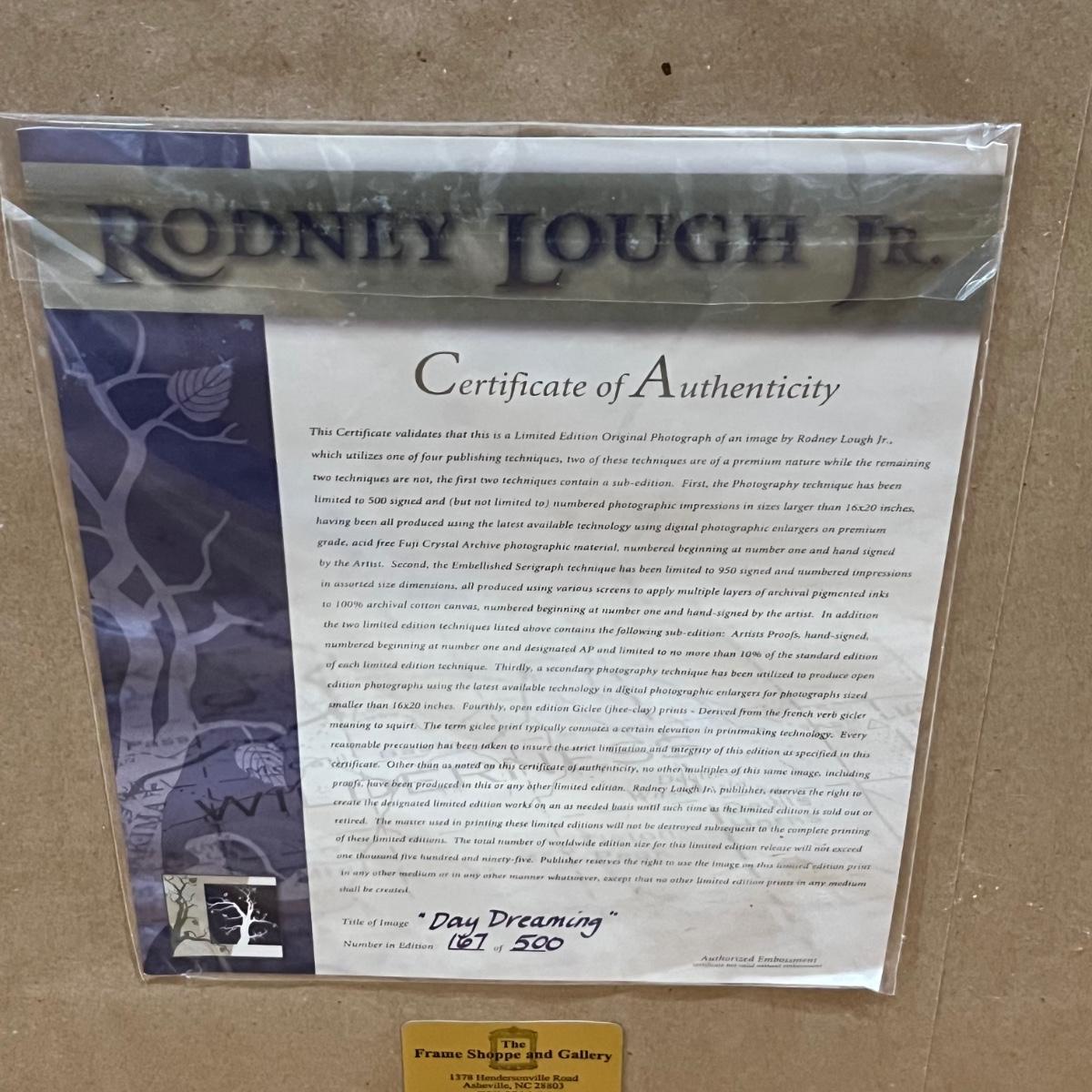 This large framed photograph is by landscape photographer Raymond Lough and is titled “Day Dreaming”. It is matted and mounted under glass in a gold and black resin like frame. Artist information is on the back. Note there is a small area of paint located on one upper corner of the back of the frame.