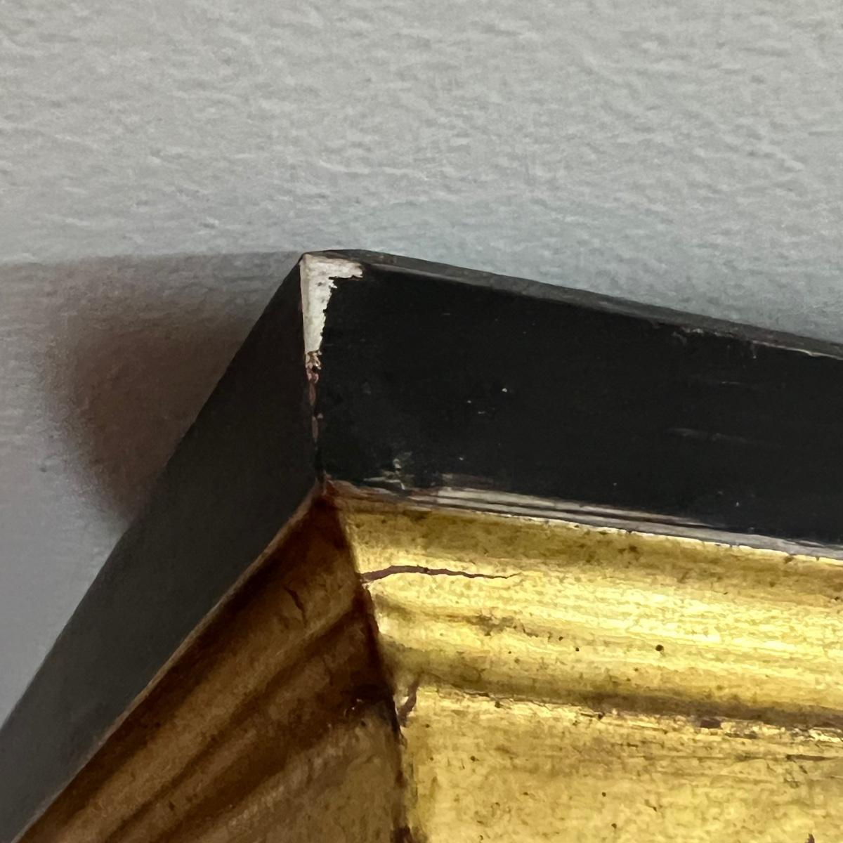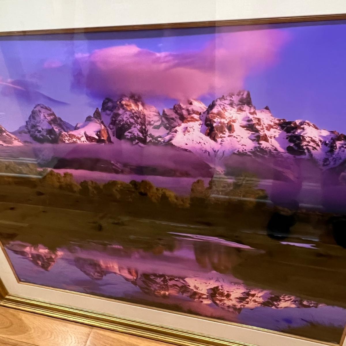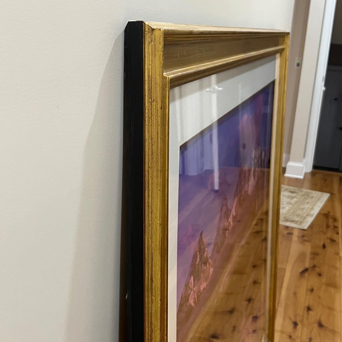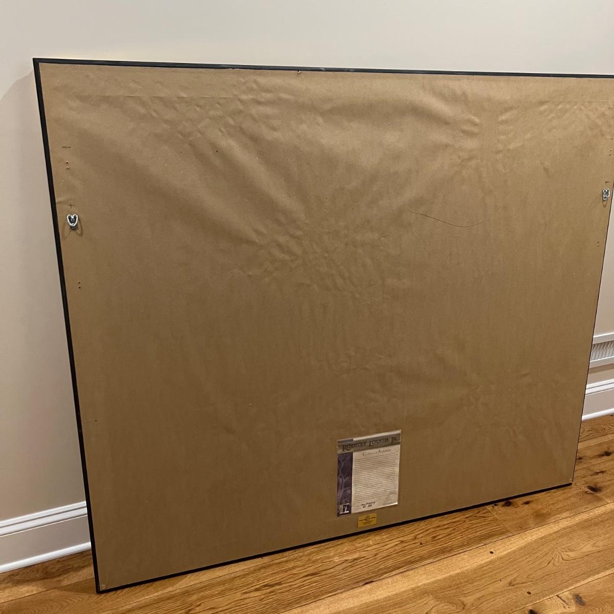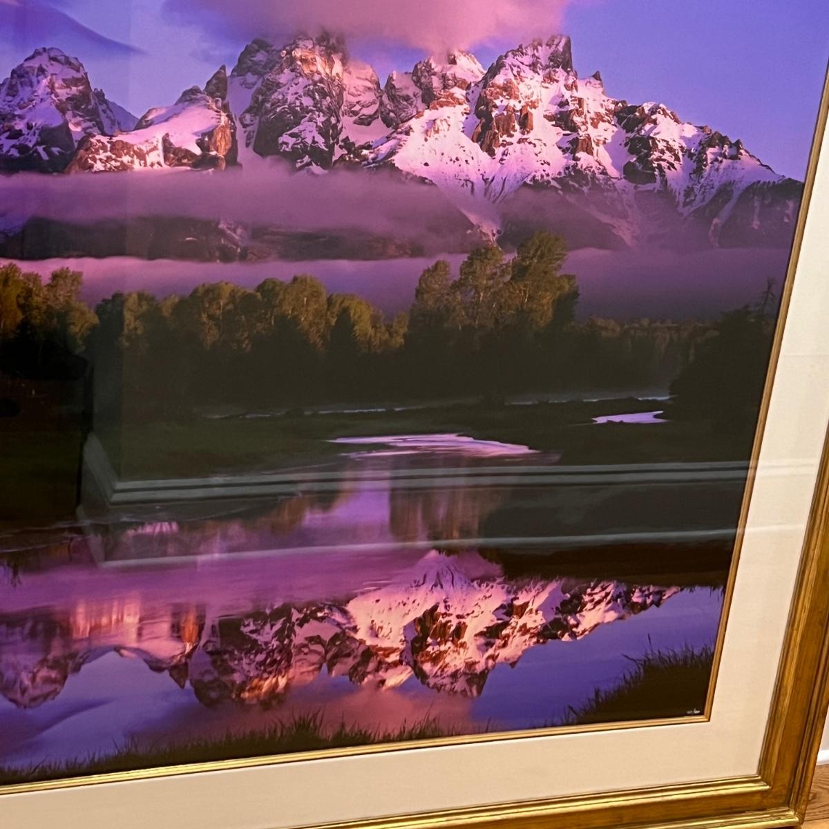 This large framed photograph is by landscape photographer Raymond Lough and is titled “Day Dreaming”. It is matted and mounted under glass in a gold and black resin like frame. Artist information is on the back. Note there is a small area of paint located on one upper corner of the back of the frame.