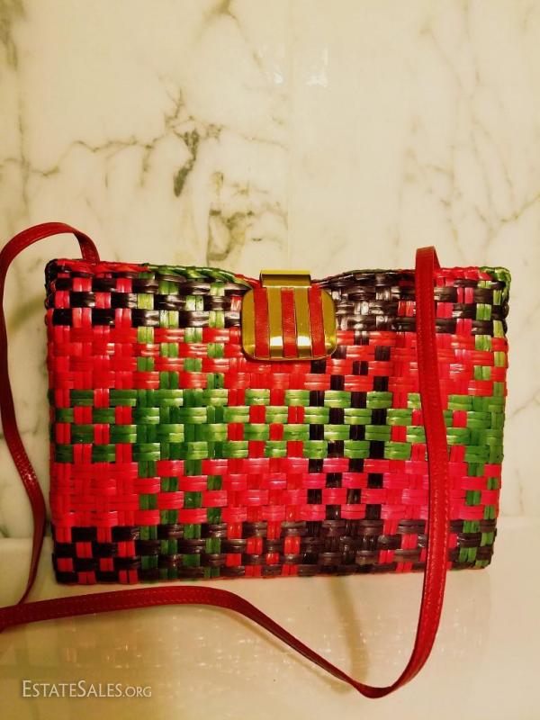 By famous Rodo Italy wicker all hand weaved by Artisans. The inside is calf skin leather and so is the strap. There is a cutout pocket lined in gold leather.. The red strap can be removed so the bag can be worn as a clutch or shoulder bag.The closure buckle is heavy metal gold plated with leather strips design. Completely new worn once on runway show.