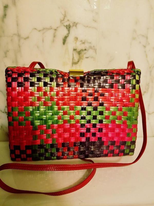 By famous Rodo Italy wicker all hand weaved by Artisans. The inside is calf skin leather and so is the strap. There is a cutout pocket lined in gold leather.. The red strap can be removed so the bag can be worn as a clutch or shoulder bag.The closure buckle is heavy metal gold plated with leather strips design. Completely new worn once on runway show.