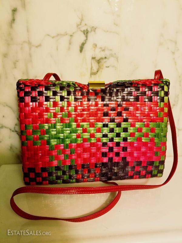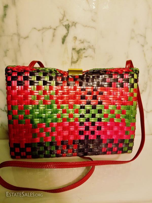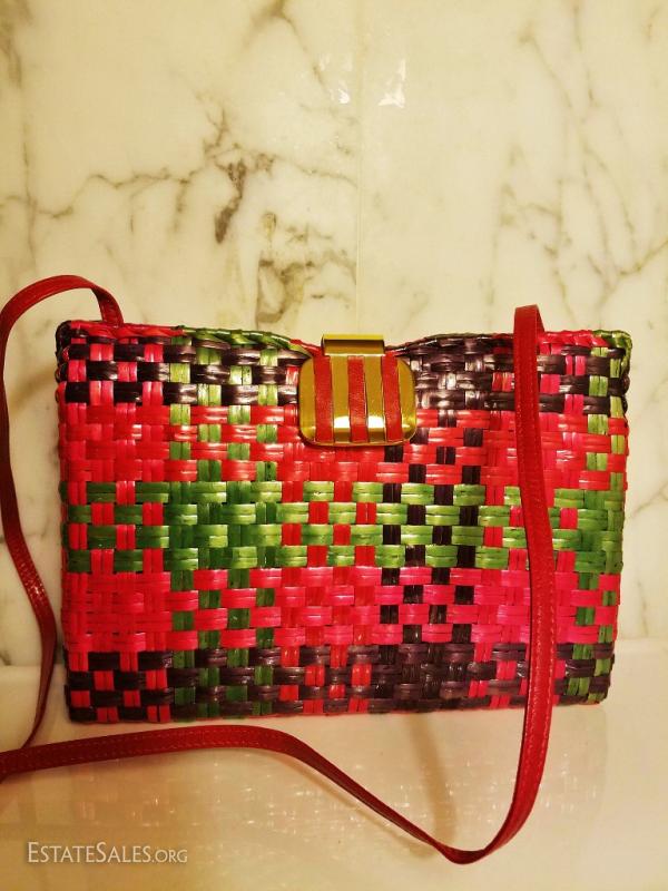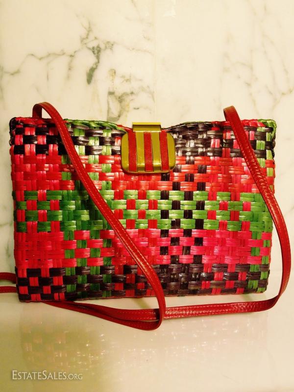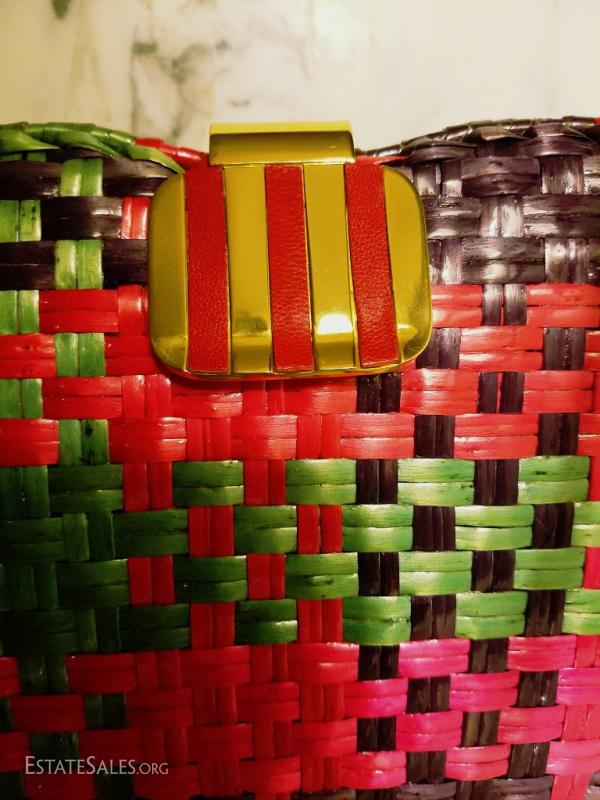 By famous Rodo Italy wicker all hand weaved by Artisans. The inside is calf skin leather and so is the strap. There is a cutout pocket lined in gold leather.. The red strap can be removed so the bag can be worn as a clutch or shoulder bag.The closure buckle is heavy metal gold plated with leather strips design. Completely new worn once on runway show.