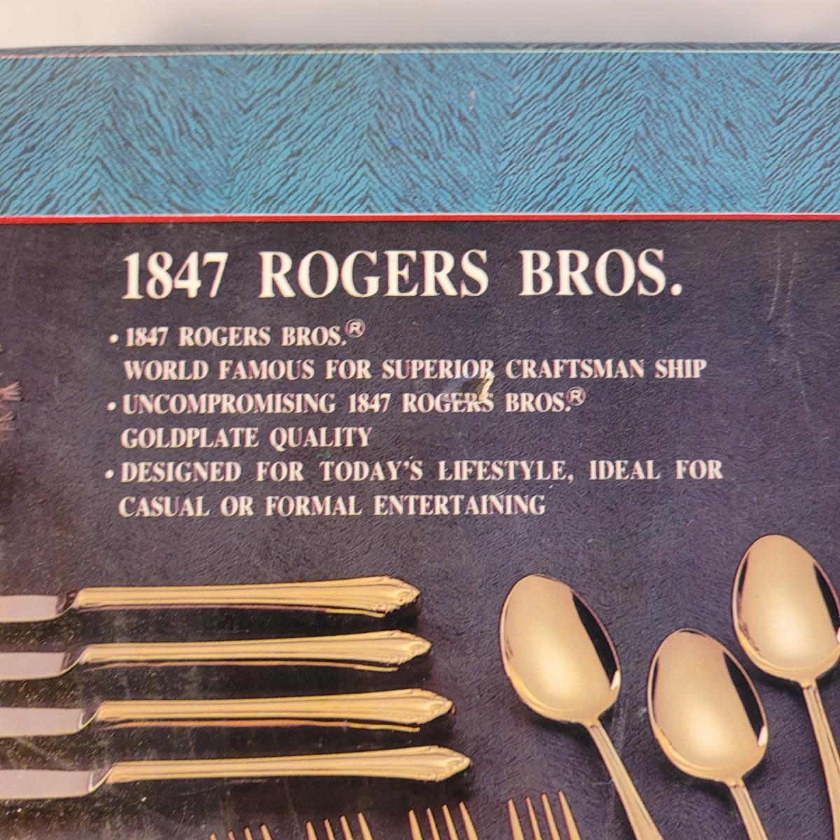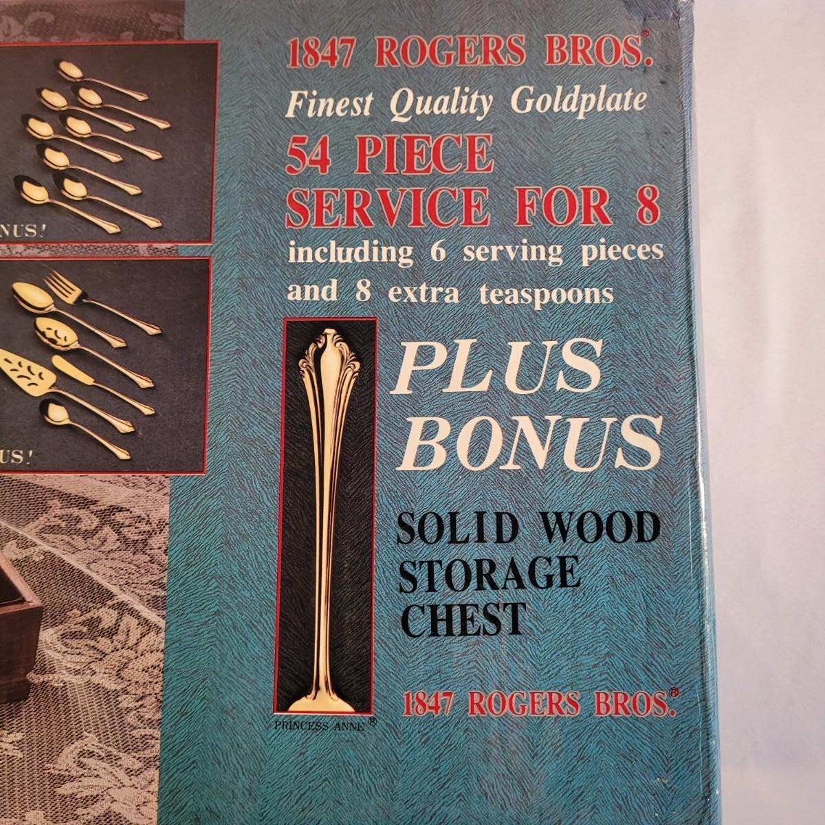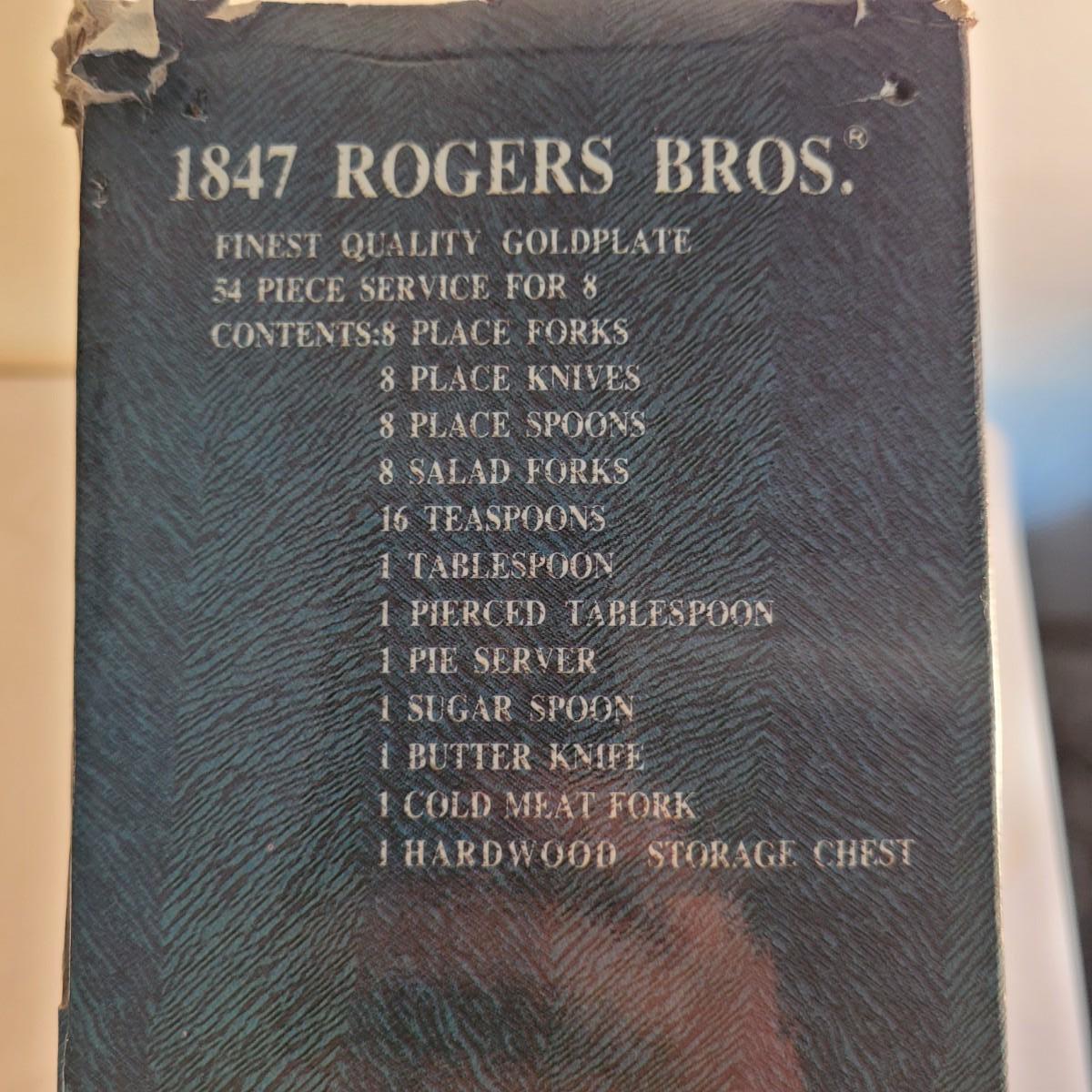 This lot includes a full 54 piece set of gold-plated flatware made by Roger Bros. This set is complete and in very good condition. It includes all 54 pieces stated on box, wooden storage box, and original packaging. The box measures 14.5" x 11.5" x 4.5"H.