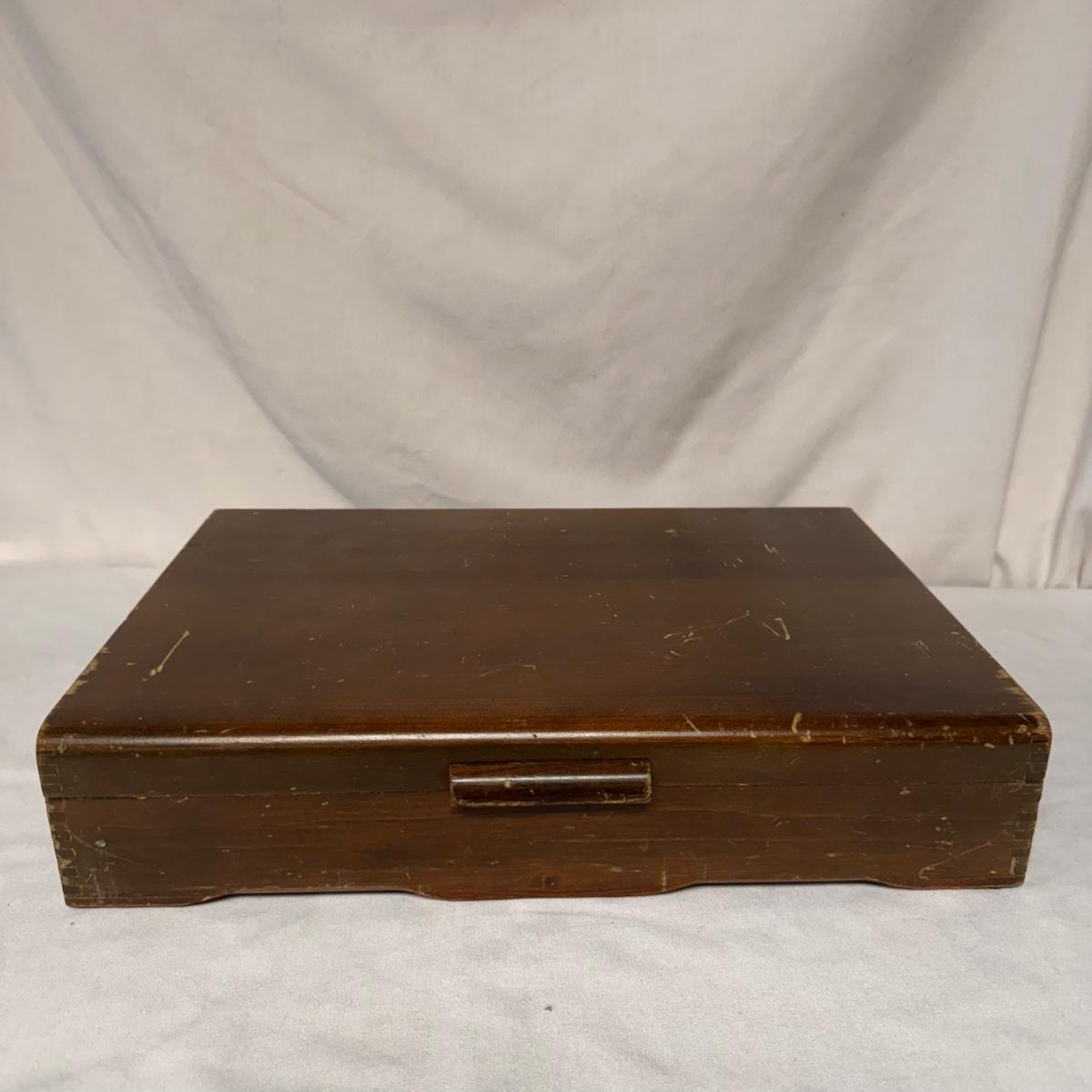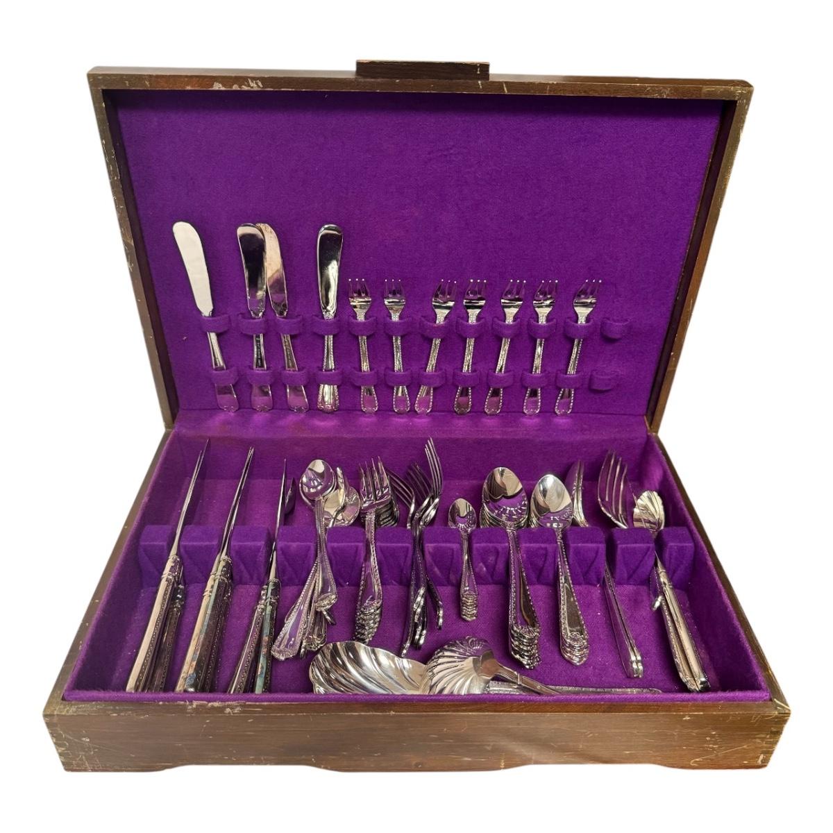 This lot of Rogers Bros silver plated flatware for four included eight of the following: dinner knives, all of the spoon sets pictured, and medium sized forks. There are six dinner forks, seven small dessert forks, four butter knives, and one of each serving utensil pictured. The wooden box storing the silverware is an anti-tarnish silverware container. There are signs of wear including tarnish due to age - see pictures included. Shipping available.