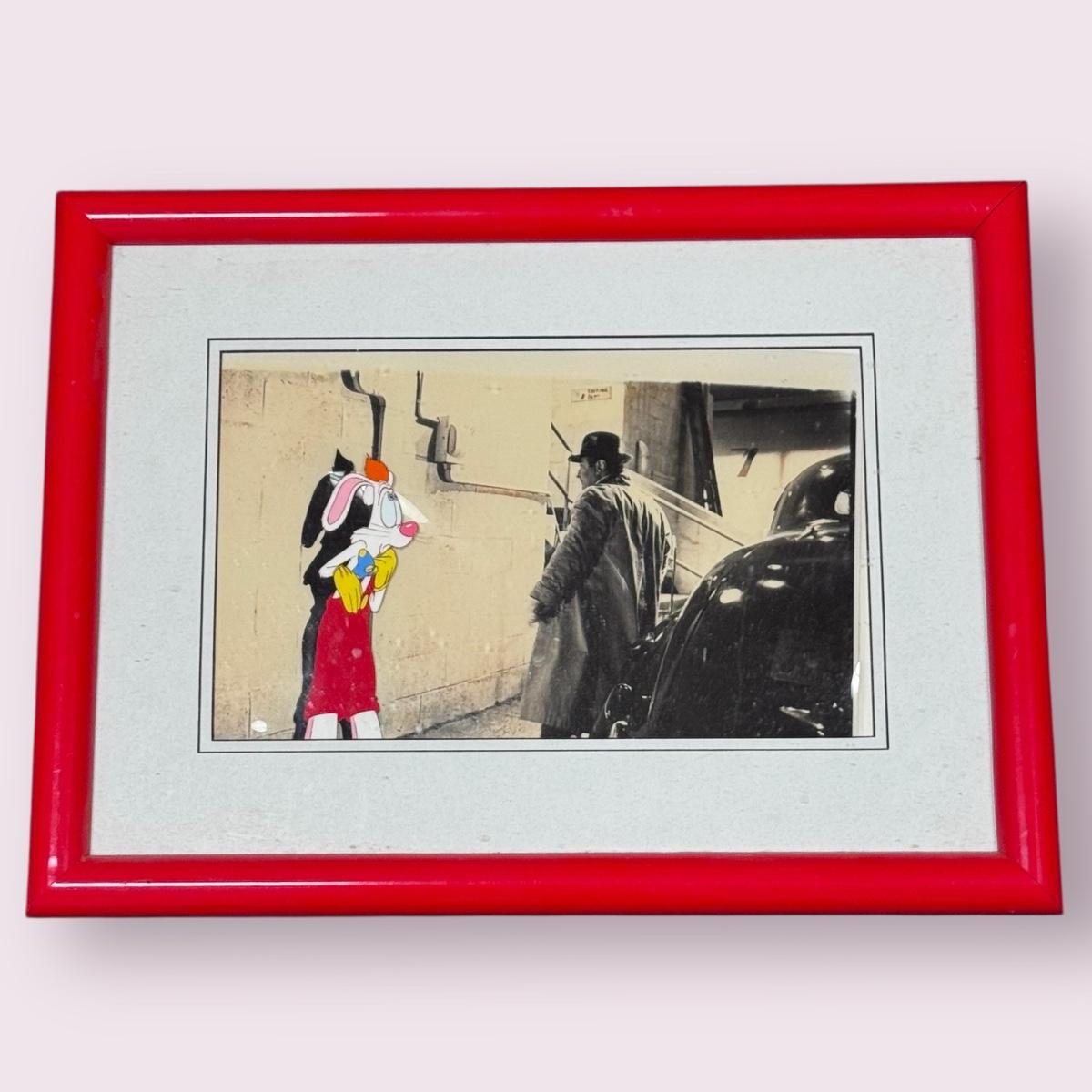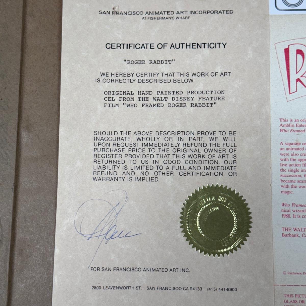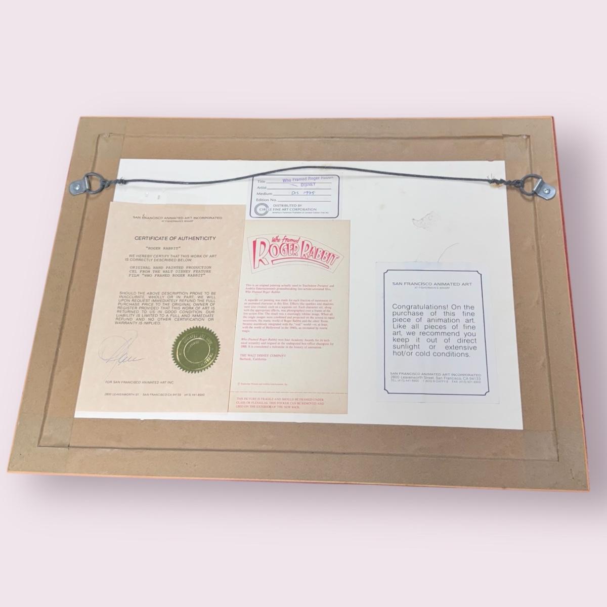 This lot includes one original hand painted production cel from the Walt Disney feature “Who Framed Roger Rabbit.” The cel is protected with a layer of plastic, two mattings, and a wooden frame with a red protective plastic layer on each side. The plastic sheet protecting the art needs a good cleaning. The frame measures 19.5” x 15”H. On the back of the frame, there are three letters of certification. Please see photos for more details.