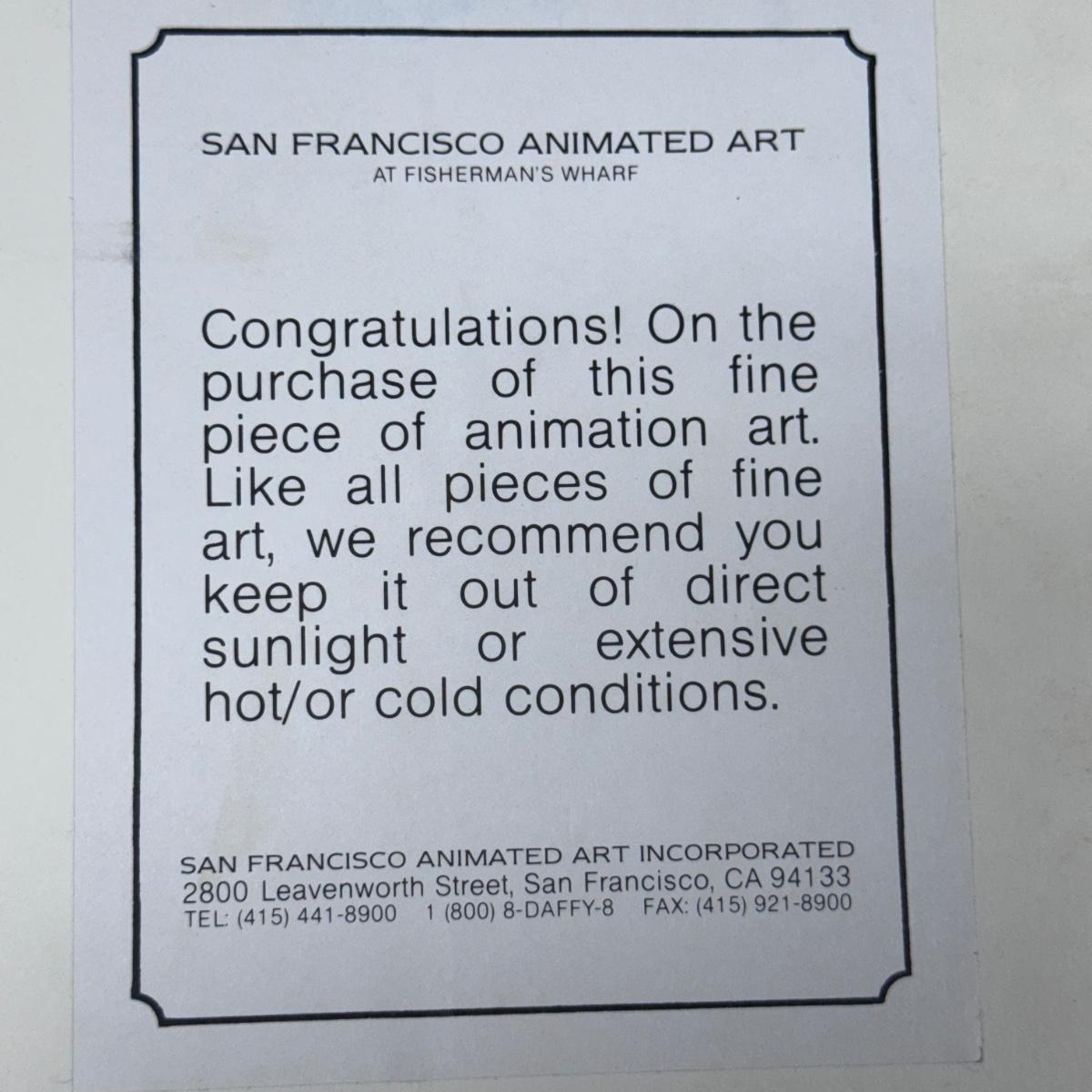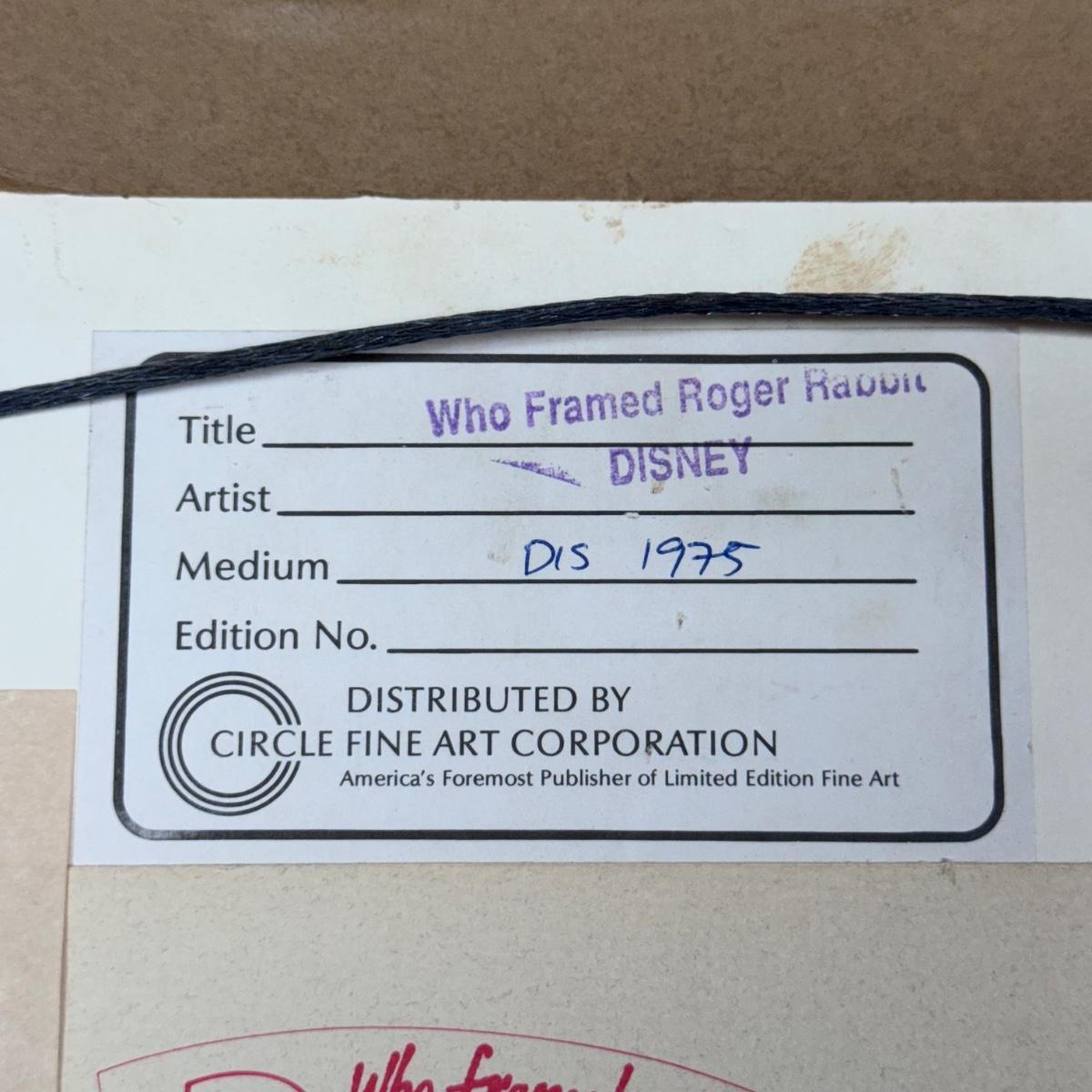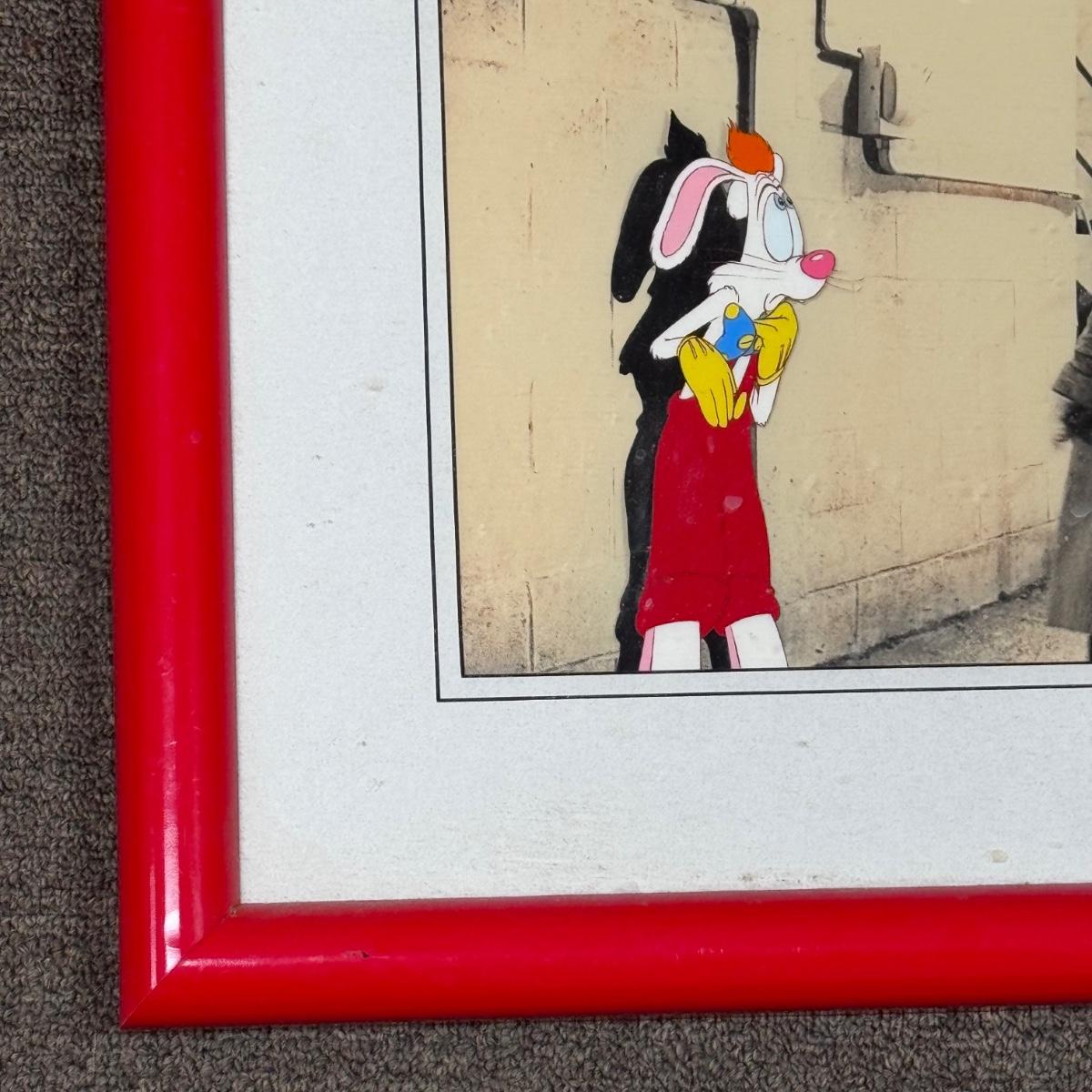 This lot includes one original hand painted production cel from the Walt Disney feature “Who Framed Roger Rabbit.” The cel is protected with a layer of plastic, two mattings, and a wooden frame with a red protective plastic layer on each side. The plastic sheet protecting the art needs a good cleaning. The frame measures 19.5” x 15”H. On the back of the frame, there are three letters of certification. Please see photos for more details.