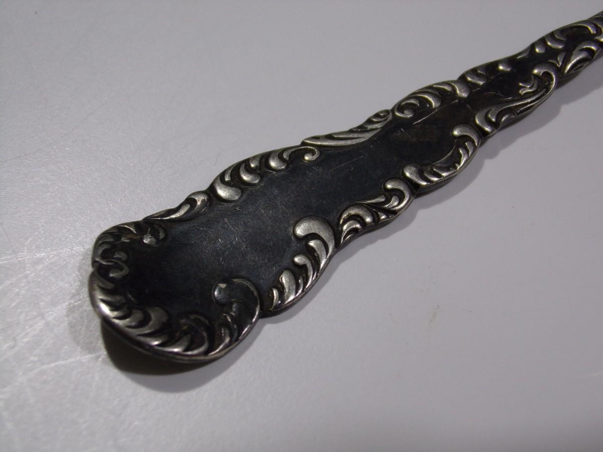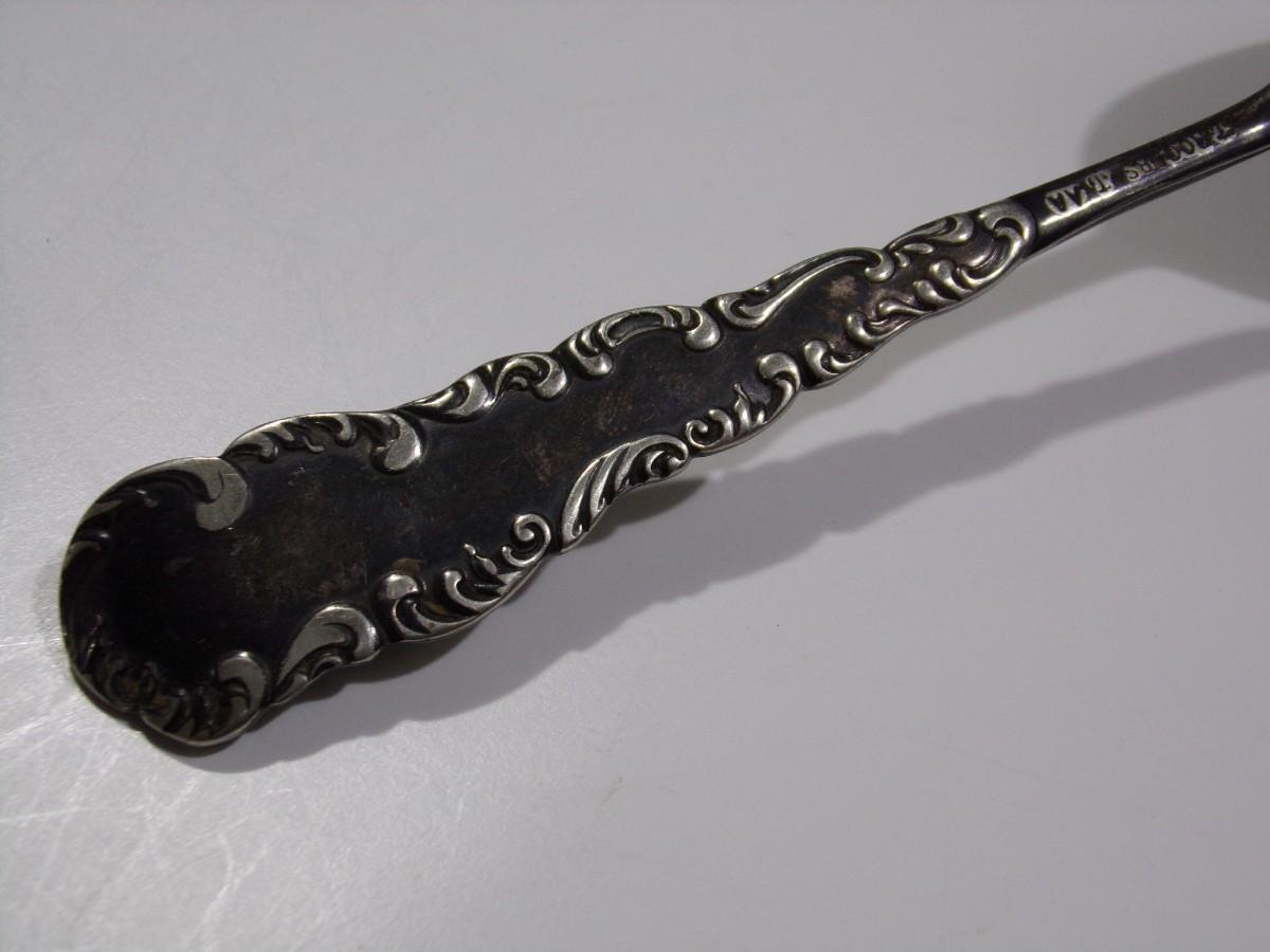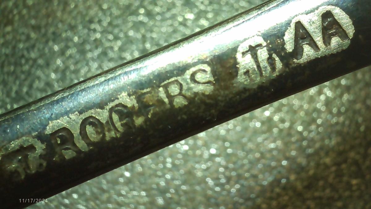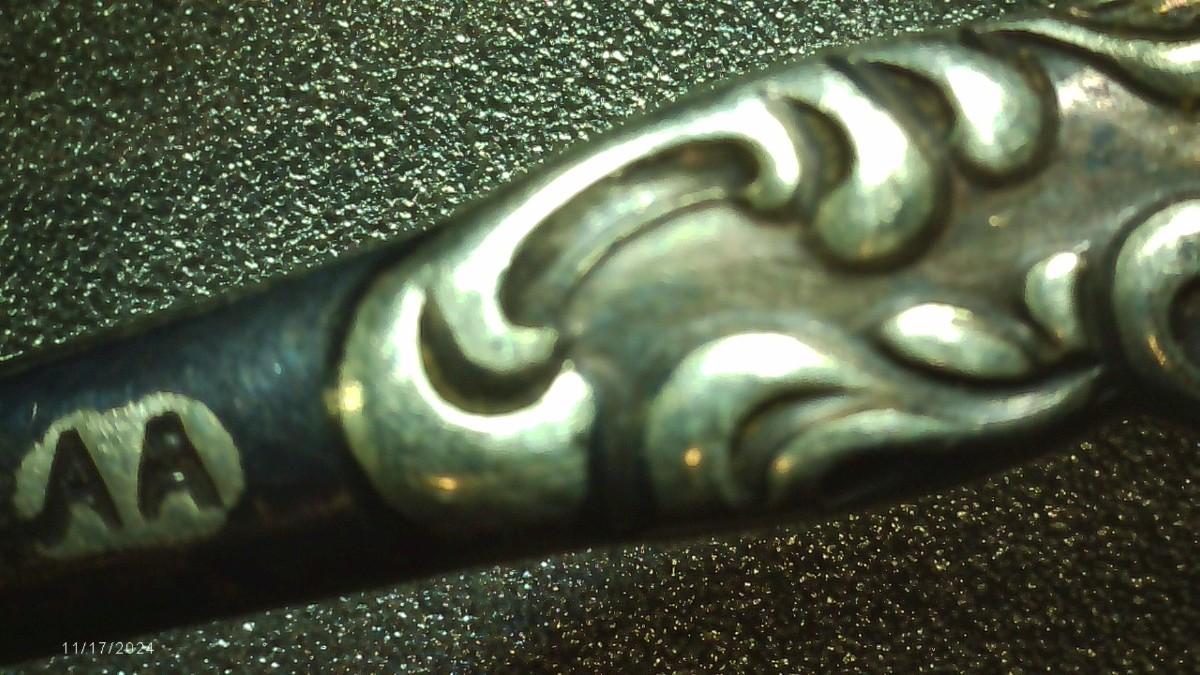 Rogers AA (w/anchors) silver plate, has extremely ornate feathery pattern on entire length of handle edges, front and back.