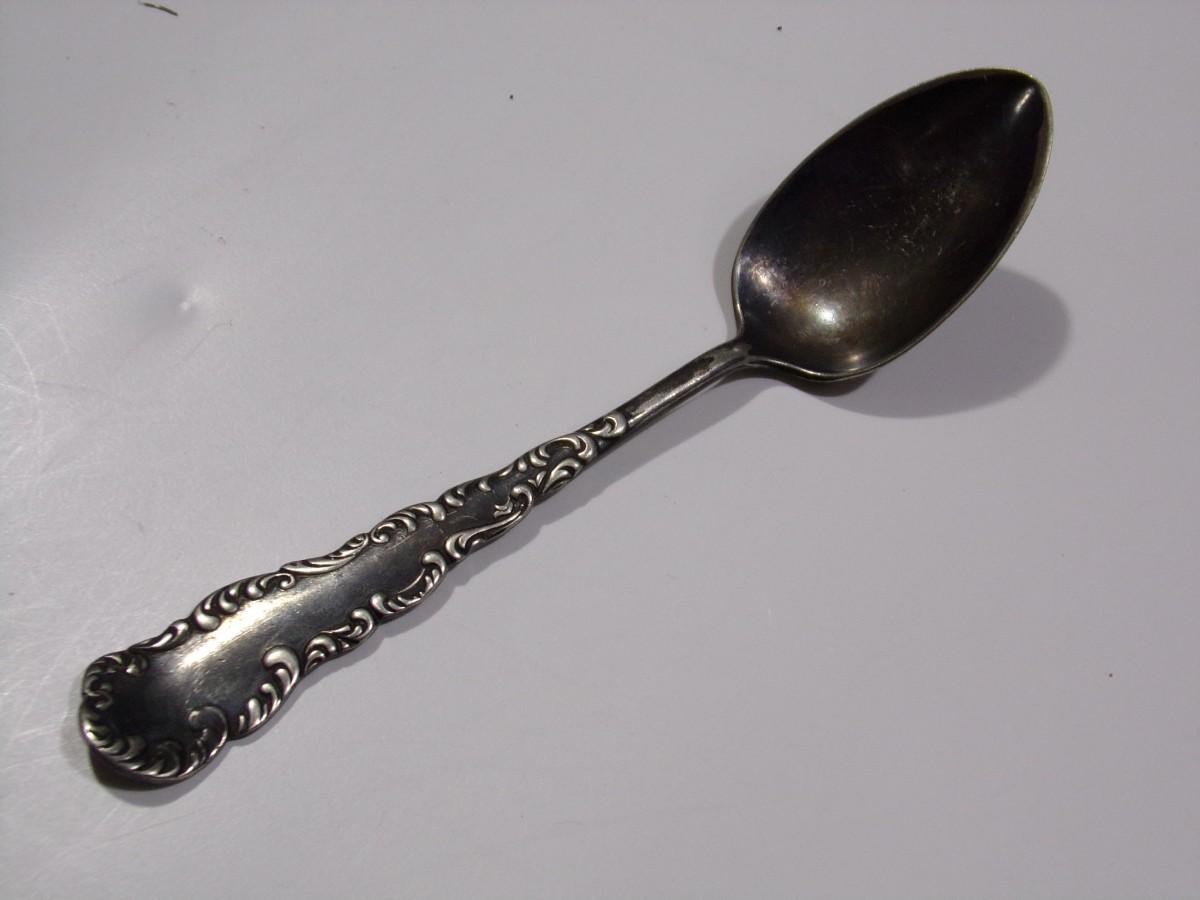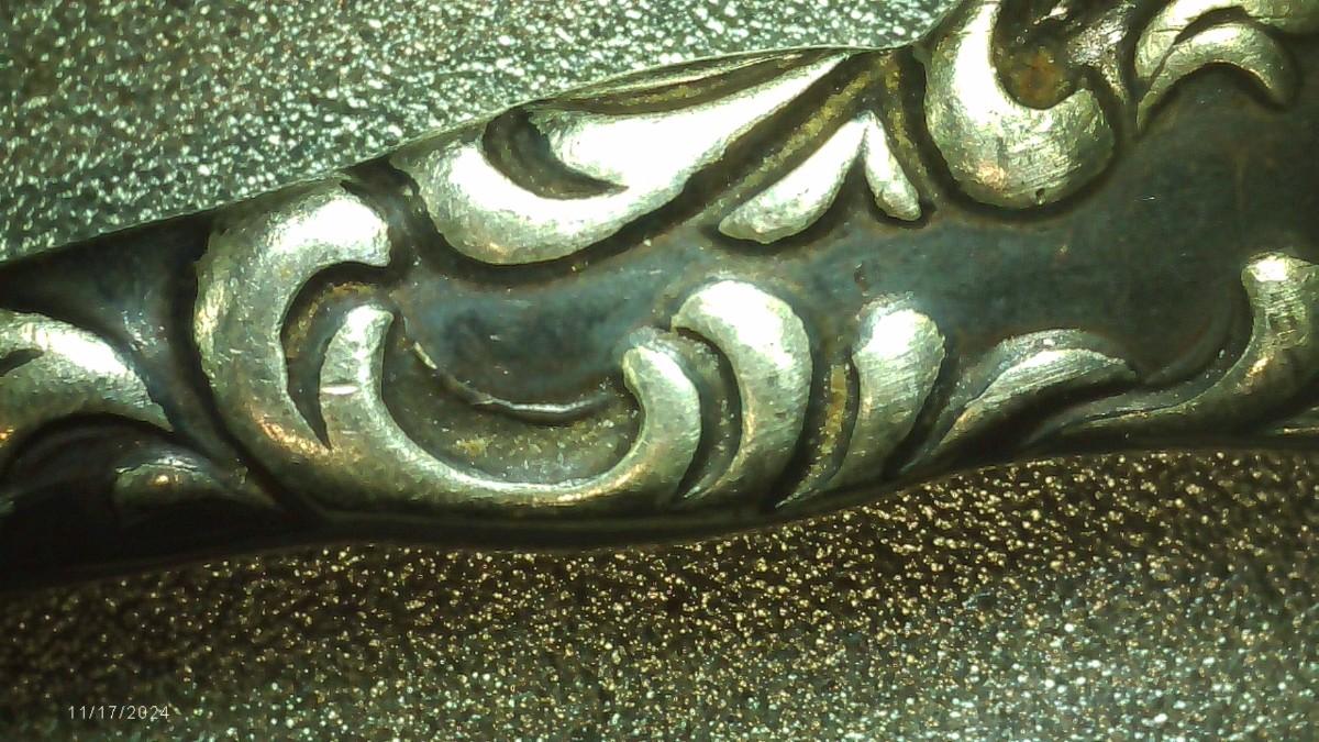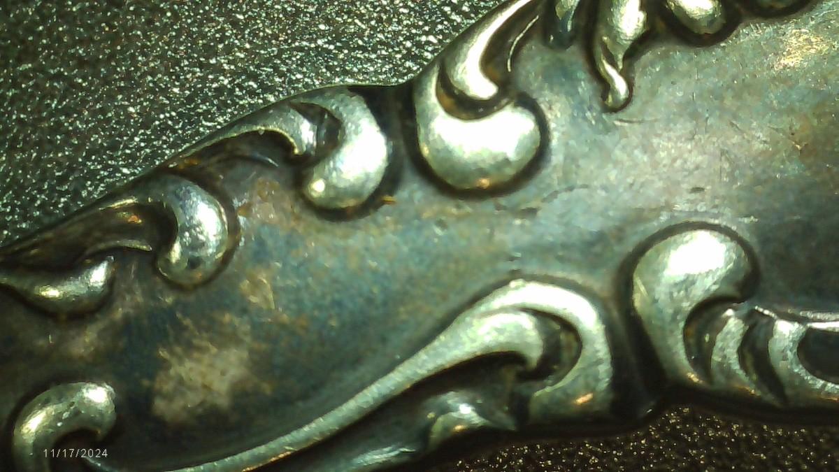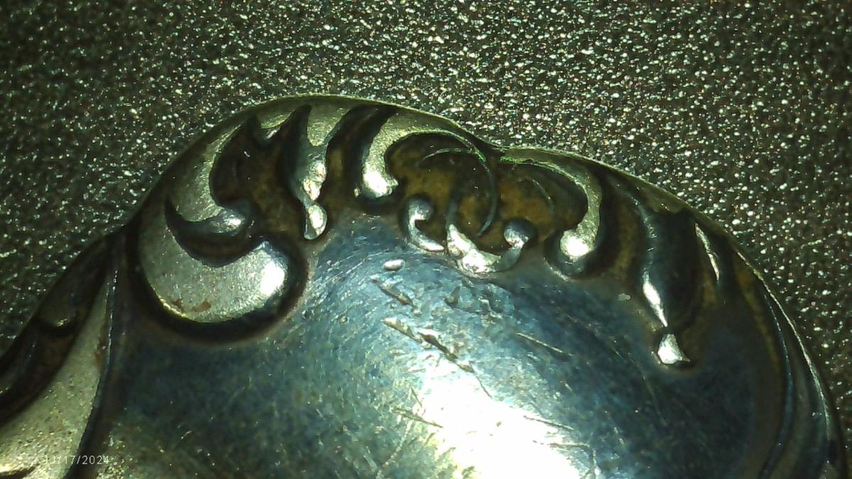 Rogers AA (w/anchors) silver plate, has extremely ornate feathery pattern on entire length of handle edges, front and back.